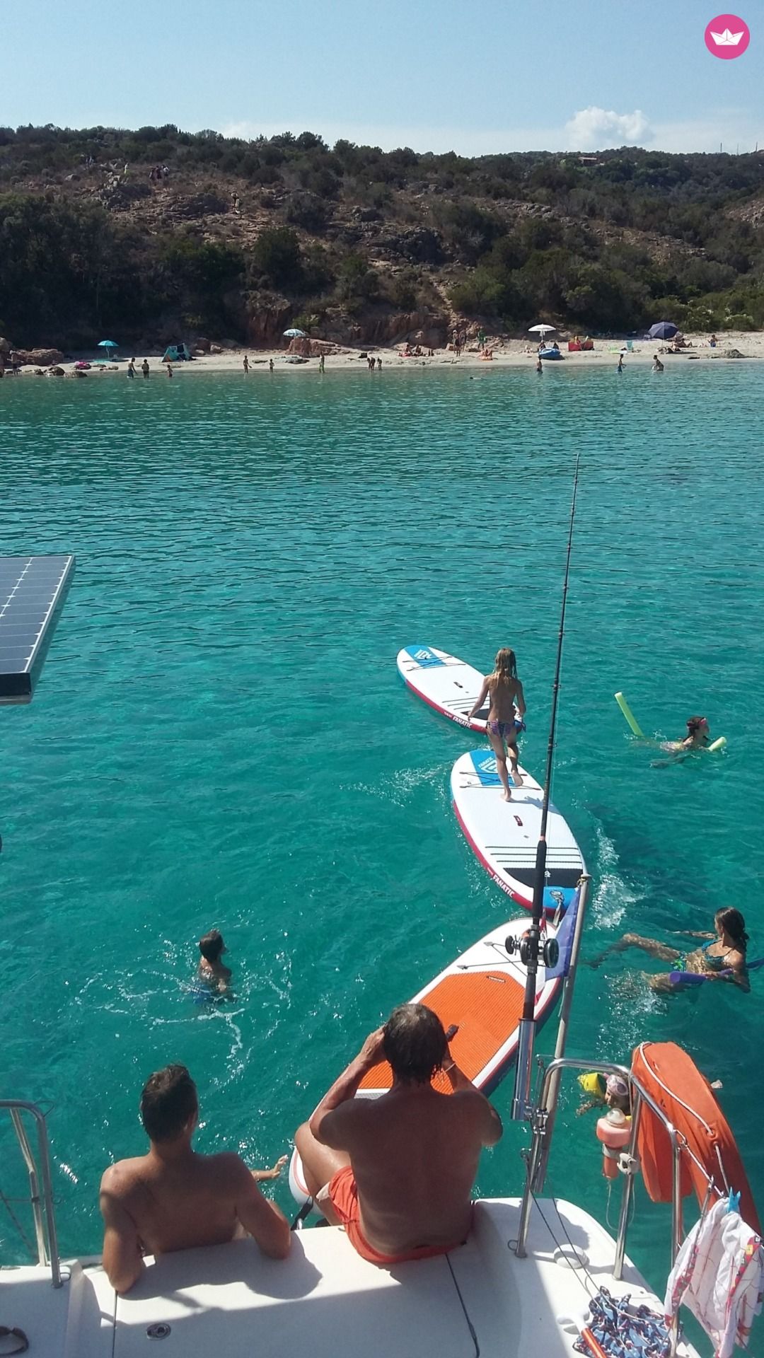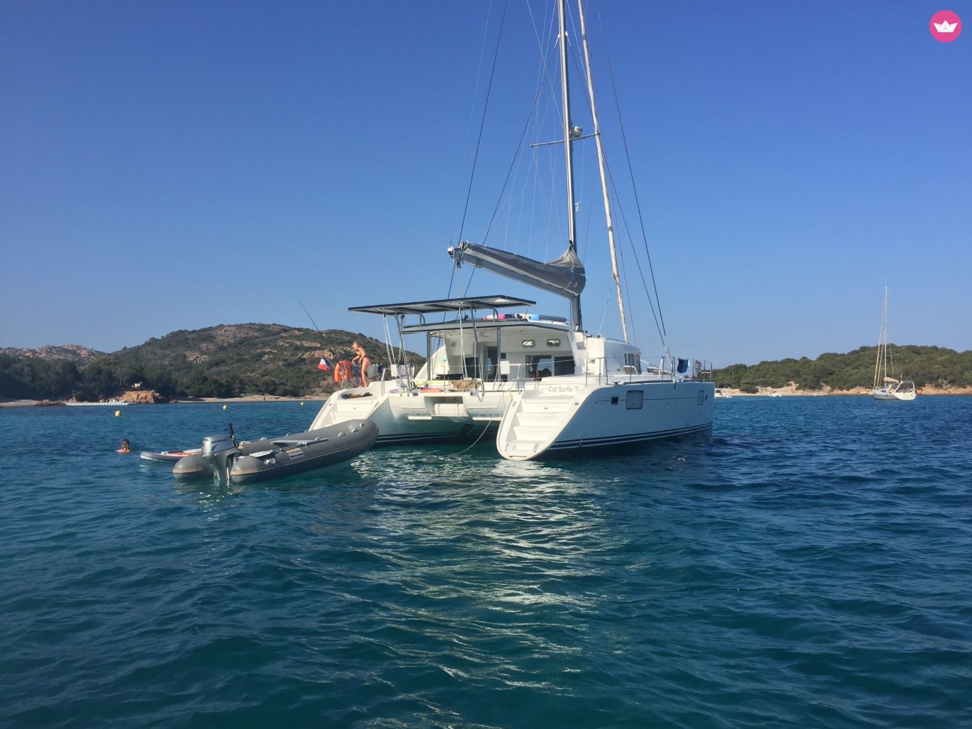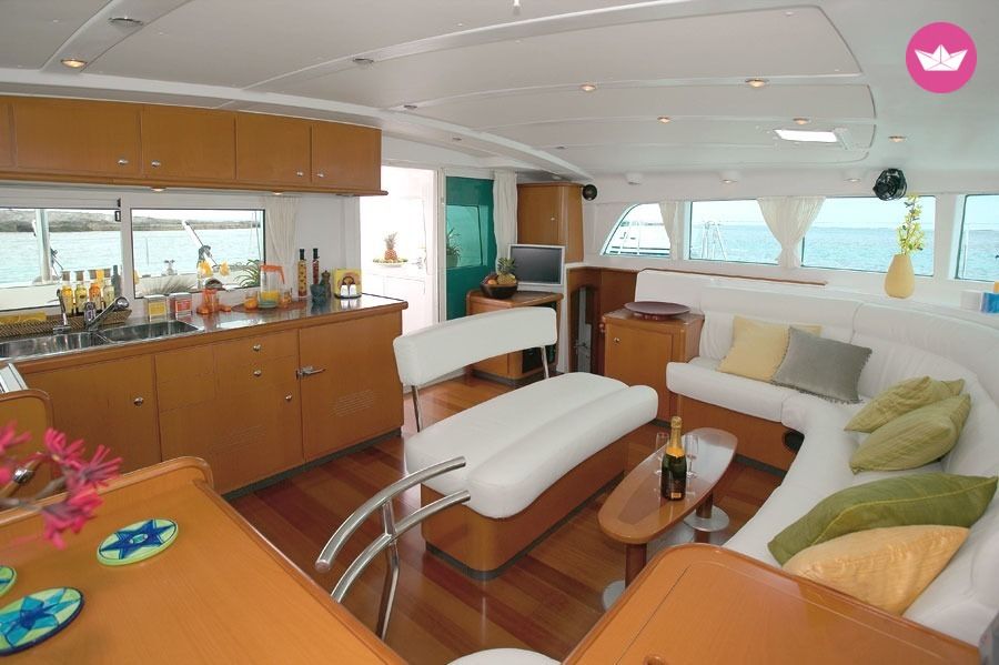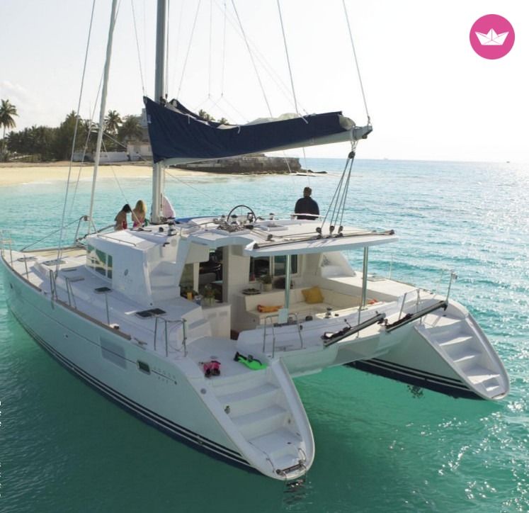 Description of Roman's catamaran , "Cat Surfer" est un catamaran à voile de 13.61m de long par 7.7m de large, salon et cockpit de plain-pied, cockpit avant, flybrige, version 4 cabines. Le Lagoon 440 a été construit de 2004 à 2010, son confort et ses qualités marines incomparables dans cette gamme en ont rapidement fait un des bestsellers du chantier bordelais CNB, le leader mondial des catamarans. Pour votre confort : 230V disponible dans le salon et les cabines et dans le plus grand silence grace à 1300W de panneaux solaires qui alimentent aussi cafetière filtre, Nespresso, bouilloire, etc ... Une grande plancha complète un équipement de cuisine au top pour se régaler à tous les repas ! Un dessalinisateur 100 L/h, lui aussi alimenté en silence à l'energie solaire, permet d'être totalement autonome en eau douce et de réduire les retours au port. Il y a aussi quelques masques, palmes et tubas à bord, 2 Stand Up Paddle, et du matériel de pêche. Une très grande annexe de 380cm et 20cv pour vous balader ou vous déposer à terre. Difficile de s'ennuyer ! Accueil 12 personnes maximum à la journée. Jusqu'à 8 personnes conseillé sur location semaine, 9 couchages maximum pour les passagers. Cabine du skipper en pointe avant babord. Les 4 cabines doubles, chacune avec sa salle de bain, sont à votre disposition. En plus du tarif affiché sur le site vous devrez vous acquitter le jour de l'embarquement de : Options obligatoires : - skipper : 250 EUR par jour - forfait gaz/carburant : 35 EUR par jour Options facultatives : - Linge de lit et toilette : 30 EUR par cabine double
