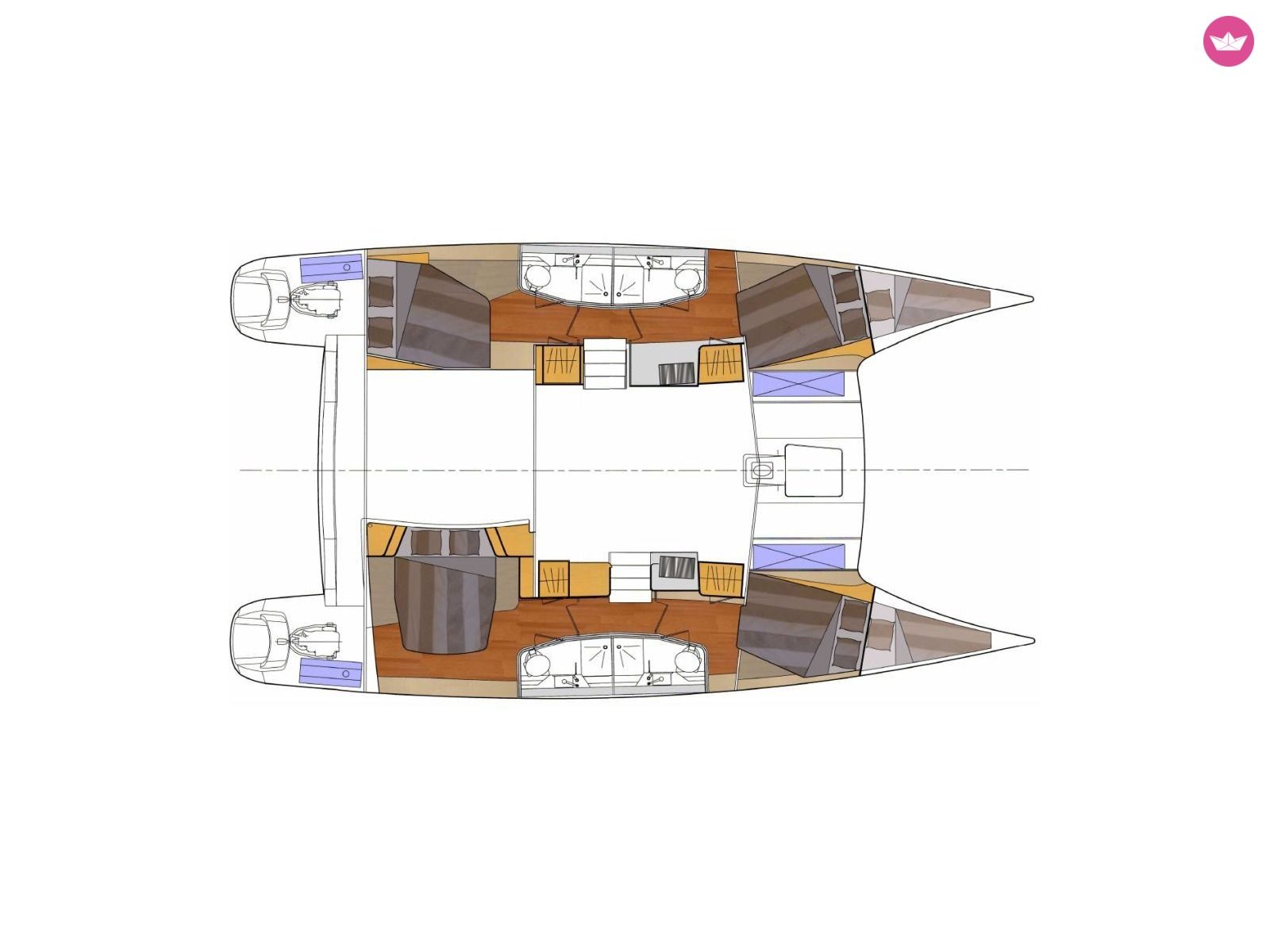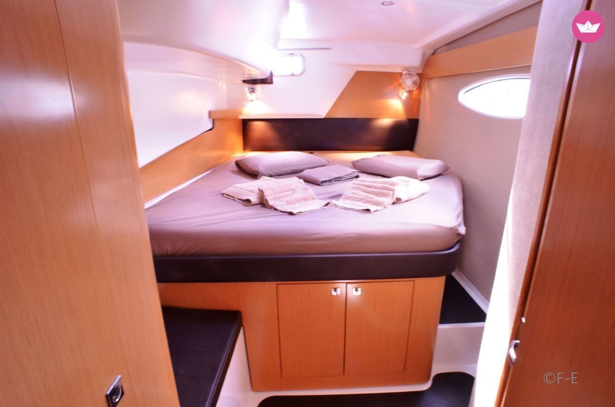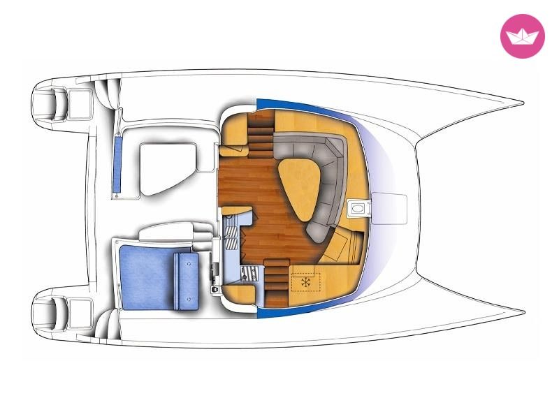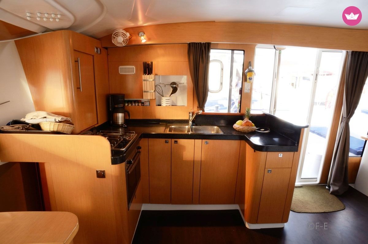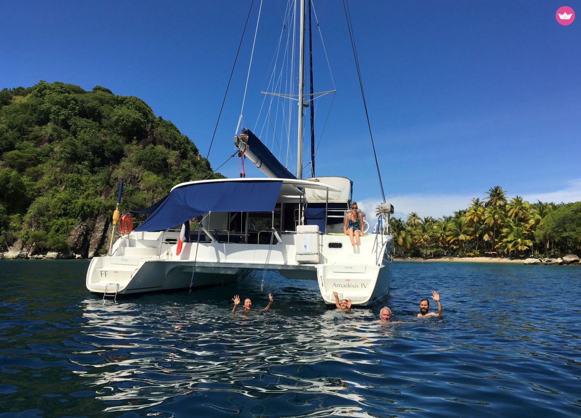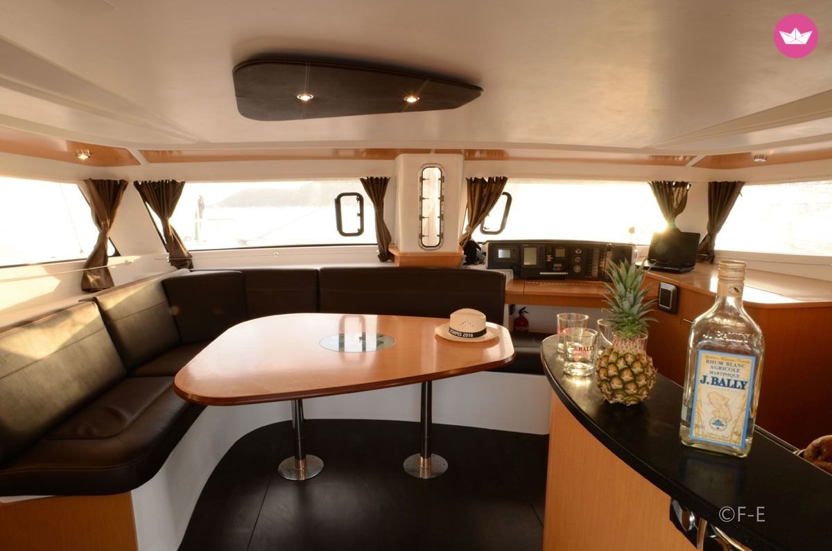 Description of Romain's catamaran , Kontan vwè zòt ! Cindy et Romain vous accueillent sur leur catamaran pour vous faire découvrir les plaisirs de la navigation en catamaran dans les Petites Antilles. Avec 3 cabines doubles et 2 cabines simples à votre disposition, Amadeus 4 accueillera jusqu'à 8 personnes dans le plus grand confort. Chaque cabine double dispose d'un lit et de sa propre salle d'eau avec un espace douche séparé. Eau chaude et froide sous pression sont de rigueur et les draps et linge de toilette sont fournis, bien entendu. Les WC sont raccordés à un système d'eaux noires pour des raisons évidentes de salubrité et de respect de l'environnement. Toutes les cabines sont également équipées de hublots ouvrants, de ventilateurs et de prises électriques en 220 volts. Sur le pont principal, le carré accueil une grande cuisine en U équipée d'un évier double, d'une gazinière 3 feux et four, d'un réfrigérateur 130L, d'un conservateur 90L, tout le nécessaire de cuisine et de multiples rangements. La cuisine et la confection des repas est en gestion libre et Cindy et Romain s'inviteront à votre table. Les ventilateurs, les ouvertures ainsi que le taud de baies vitrées assurent une température confortable. Les grands espaces intérieurs faciliteront les déplacements à bord et chacun se sentira à son aise au mouillage comme en navigation. Sa grande réserve d'eau douce (530L) avec dessalinisateur est un gage de confort et de sérénité non négligeable ! Séparé du carré intérieur par une baie vitrée, le cockpit - lieu de prédilection lors des mouillages - dispose d'une table à manger pour 10 personnes, d'une banquette et d'un bain de soleil double, parfait pour les instants méditation, lecture, farniente ou pêche. Le poste de barre avec sa banquette 3 places est situé 2 marches plus haut. Il dispose d'un pilote automatique, commande du guindeau, winch électrique, loch, speedomètre, sondeur, girouette, anémomètre. En tant que capitaine vous en prendrez les commandes facilement, toutes les manœuvres y étant rapportées. A vous les mouillages paradisiaques, dans la baie des Saintes au pied du pain de sucre, à Malendure au cœur de la Réserve Cousteau, à Marie-Galante capitale du rhum, ou même au delà des Îles de Guadeloupe... Tous les matériels et accessoires sont à votre disposition : Annexe avec moteur hors bord, palmes, masques, tubas, kayak 3 places, planche à voile, guitare, djembé, hamac... Avec son expérience de la mer (plusieurs années de voile légère, une trans-méditerranée, une trans-atlantique, plusieurs convoyages en tant qu'équipier et bien sûr toutes les navigations dans les Antilles effectuées à l'année avec ce catamaran, pour un total de 6000+ milles nautiques), Romain vous apportera toute l'aide nécessaire pour les manœuvres et saura vous guider dans vos choix de navigation et excursions, tout cela dans le respect des règles de sécurité et de bonne pratique et avec l'équipement règlementaire. Cindy quand à elle saura vous conseiller pour vos excursions à terre afin de vous faire découvrir les trésors cachés des Caraïbes, et pourra également, sur demande, vous mitonner des plats aux saveurs créoles (ou selon vos goûts).