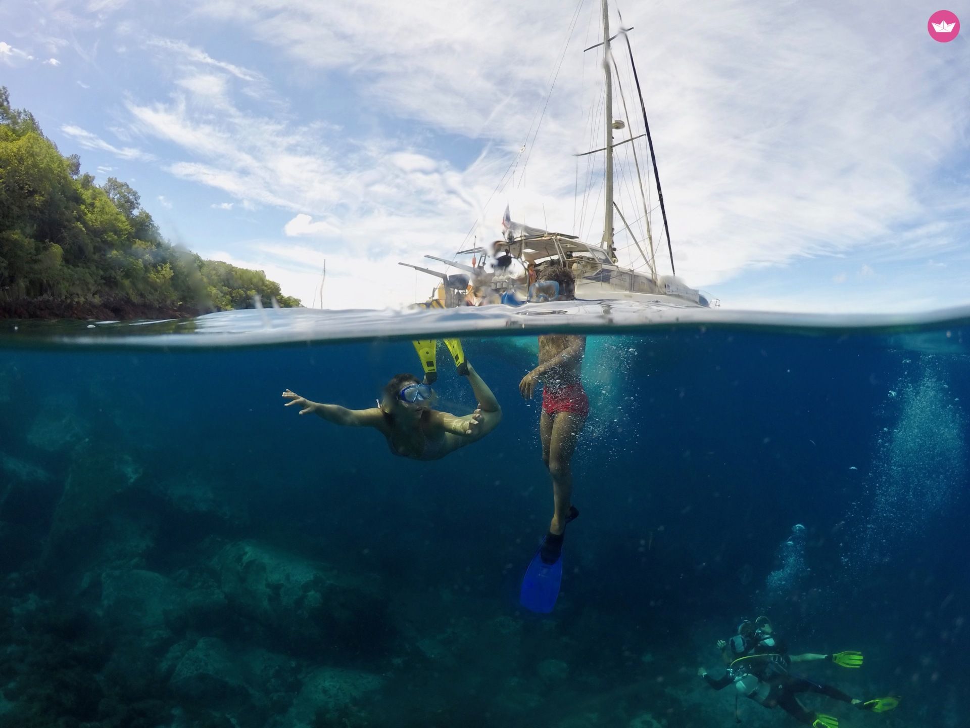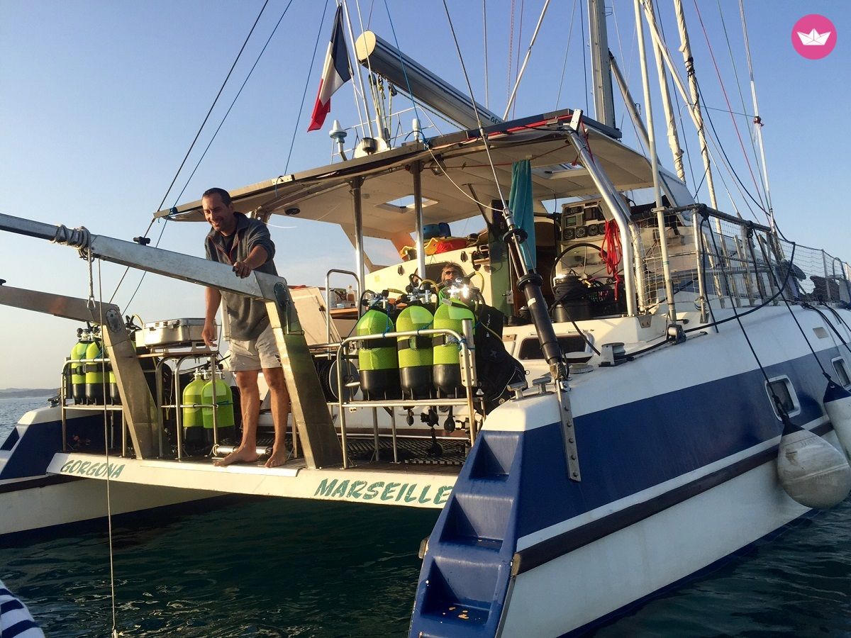 Description of Chloé's catamaran , Bonjour, Nous vous proposons de faire des sorties en mer avec ce catamaran - sorties plongée ou journée découverte plongée en petit comité ! 1. Pack journée : 8h30/17h 2. Pack 24h (avec nuit à bord) 3. Pack Martinique 3 jours & 2 nuits 4. Pack Saint Vincent 5 jours & 4 nuits Fonctionnement en petit comité : jusqu'à 8 - 10 personnes à la journée, et 7 en hébergement (3 chambres double et un lit simple) Possibilité de faire des baptêmes de plongée, des explo, des formations de plongée, ou tout simplement du snorkeling, paddle & canoé à bord. 1. Pack journée : 8h30/17h 1) Journée de la mer avec randonnée palmée (matériel et encadrement inclus, navigation incluse) De 10 à 99 ans : 79 €. Déjeuner en option à 20€ Enfant jusqu'à 9 ans : 39 €. Déjeuner en option à 12€ Enfant jusqu'à 2 ans : gratuit 2) Supplément plongée (matériel et encadrement, sachant que nous enregistrons vos baptêmes de plongée auprès de PADI, ce qui valide le début de votre formation de plongée PADI) De 10 à 99 ans : + 40€ (+55€ si vous souhaitez effectuer deux plongées dans la journée) Enfant jusqu'à 9 ans : + 30 € Photos sous-marine de votre plongée : 7,90€ (apportez votre clé USB ou bien prenez la nôtre en souvenir !) Vidéo intégrale de votre plongée : 24€90 (apportez votre clé USB ou bien prenez la nôtre en souvenir !) Clé USB aux couleurs d'ATAO Plongée : 9,90€ Livre de formation PADI : 59€ Carte de certification PADI : 39€ 3) Suppléments boissons Nous sommes un restaurant avec la licence grande restauration. Vous pouvez donc acheter à bord des boissons fraîches avec ou sans alcool : coca, ice tea, eau pétillante, Evian fraîche, bière Lorraine, Desperados, pastis, rhum arrangé, punch coco, punch passion, schrub, ti-punch et même du champagne pour les plus festifs d'entre vous ! Privatisation du catamaran Journée privatisée : 690€/groupe (jusqu'à 10 personnes, adultes et enfants) De 11 à 12 personnes : +69€/personne Déjeuner privatif : 20€/personne. Supplément nocturne : 149€ (horaires modifiés, de 13h30 à 22h au lieu de 8h30 - 17h) 2. Pack 24h Partagé : - 179€ par adulte - 124€ pour les 3-9 ans Privatif : - 890€ pour un groupe jusqu'à 4 personnes - 990€ pour un groupe entre 5 et 7 personnes Inclus : catamaran, snorkling, paddle, canoé, nuitée, les 3 repas, accès à la formule 1 plongée achetée = 1 plongée offerte soit 40€ 3. Pack Martinique 3 jours et 2 nuits Partagé : - 445€ par adulte - 290€ pour les 3-9 ans Privatif : - 2490€ pour un groupe jusqu'à 4 personnes - 3390€ pour un groupe entre 5 et 7 personnes Inclus : catamaran, snorkling, paddle, canoé, nuitée, les 3 repas, plongée incluse (1 à 2 par jour par personne) 4. Pack Saint Vincent 5 jours & 4 nuits au départ de Martinique : nous contacter pour un devis personnalisé.