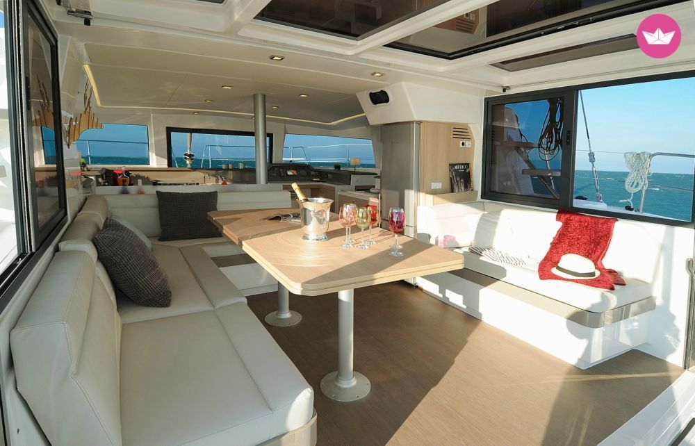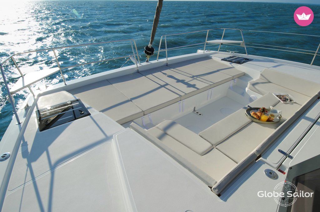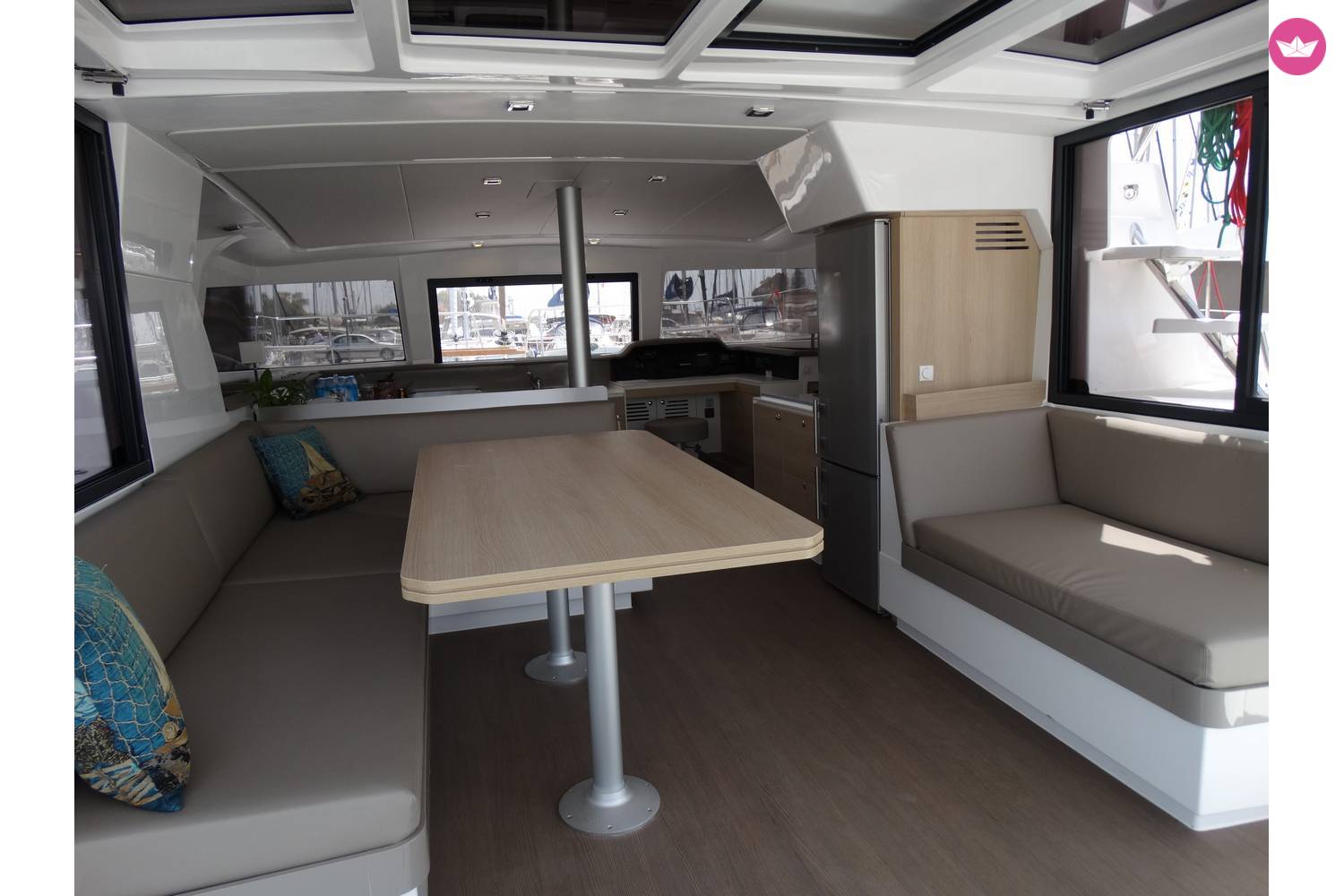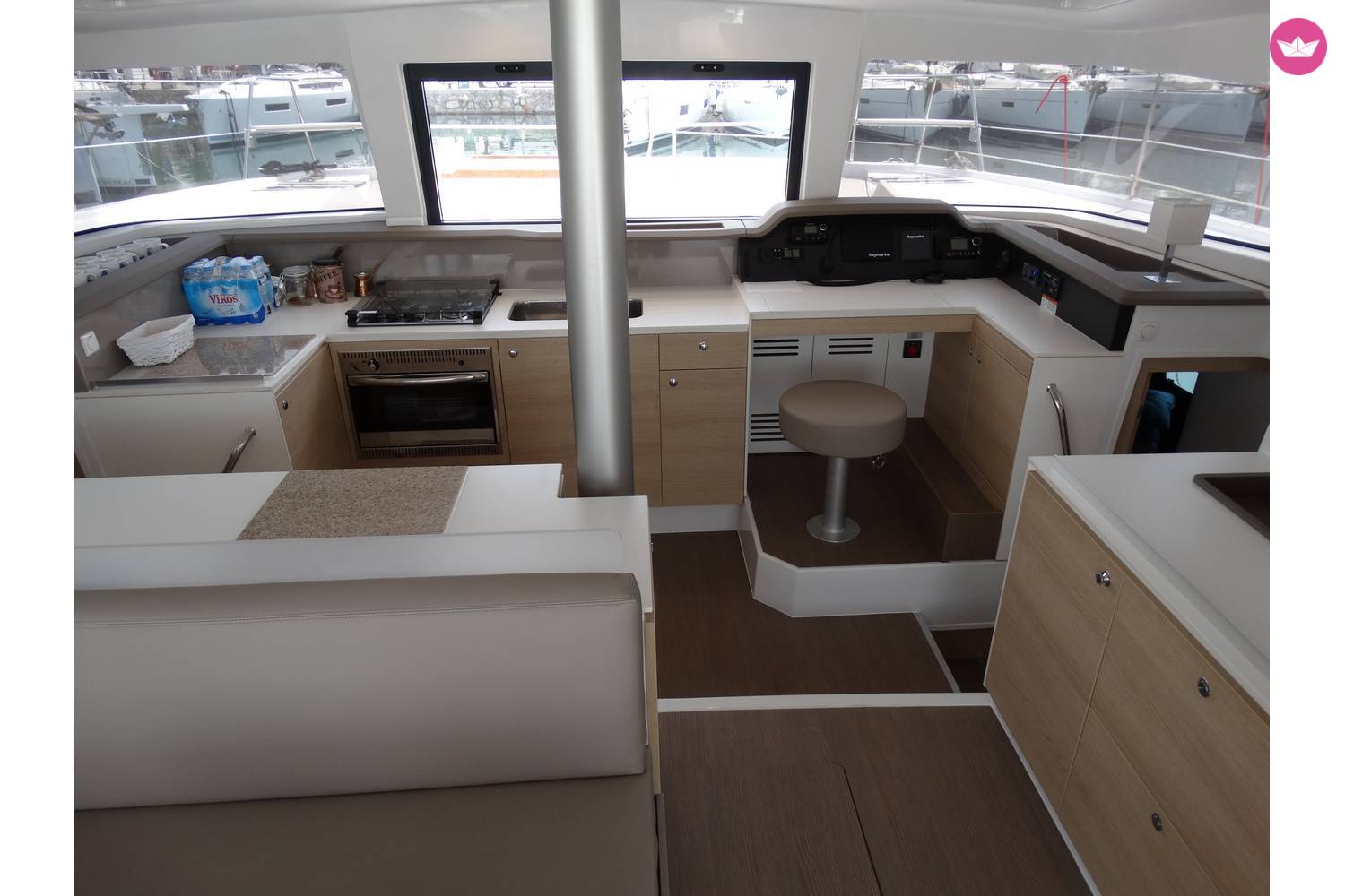 Description of Eirini's catamaran Welcome to our beautiful catamaran Bali 4.1. This multihull catamaran will definitely turn many heads whilst cruising into a favourite port of your choosing. Sail our catamaran around the Aegean sea and discover the most beautiful places or cruise into the sunset sipping on drinks from the deck of the Bali 4.1 for the utmost luxurious experience sailing our boats. The catamaran is built in 2019 and it has a distinguishable sleek lines and design. The interior is equipped with all of the modern amenities you may request during your stay on board. The boat has also a cockpit and central platform and living area with a helm and access into the catamaran's interior where you can find a fully equipped galley and a spacious living room with a sofa and dining table. The interior also provides access to 4 double cabins plus 2 for skipper and crew and access to 4 bathrooms with showers and toilets. The boat is located in our base in Keramoti in the North Aegean. North Aegean is one of the the most amazing sailing choices in Greece. The area has bays with crystal clear waters and islands with historical and environmental interest, offering you the choice between Peaceful and frequented destinations. Extras: Fuel, food provision End cleaning 40€/cabin Skipper 150€ per day Hostess 120€ per day Optional Equipment: Safety net cost 150€/week Internet pack 5GB costs 40€. Kayak cost 10€/day