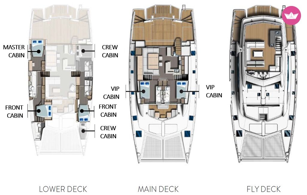 Description of Agnes's catamaran Catamaran Leopard 58 operates from PRASLIN (Mahe not possible). Outer Island cruises also available! Leopard 58 accommodates 10 guests in 5 cabins with separate crew compartments. Two VIP cabins with private outside terrace at the back, are directly connected to the Main Salon by the sliding doors, offering a convenient access to the front cockpit. Large windows give in the morning an impression of waking up on the surface of crystal water and possibility of touching it, while in the evening they become the gate to the most wonderful sunsets in the globe. In the boat floats are located three other guest cabins, one of which is MASTER CABIN with private dressing and very spacious bathroom, that you won’t find in any standard class catamaran. Each cabin has a queen bed, own suite bathroom with closet space, and is additionally equipped with separated air conditioning unit and a fan, which are great amenities during the warm days. Minimum charter days: 3. Please note: Prices vary from € 3800 to € 5200 per day. For year 2019: 04.05 - 13.10: 3800 €/day 13.10 - 26.12: 4600 €/day 26.12 - 05.01: 5200 €/day 05.01 - 05.05: 4600 €/day Prices subject to change. Price includes: ▪ Crew: skipper, cook ▪ Full board for max 10 Guests (3 meals a day: breakfast, lunch & dinner) ▪ Tap water, coffee and tea all day ▪ Soft drinks and snacks ▪ Generator use up to 8h/day ▪ Watertoys: Seabob, Freediver, 2x SUP, snorkeling set ABC, 2x fishing set (bottom and trolling), dinghy with engine ▪ 2 sets of bed linen and 2 sets of towels (beach and shower) per Guest per week ▪ Router WiFi with 10 GB transfer (extra Internet transfer can be ordered at base) ▪ National Park fees ▪ Yacht fuel ▪ Mooring fees ▪ Handling fees ▪ Yacht insurance Extra costs: ▪ Flights ▪ Transfers between the airport/marina etc. ▪ Amirantes Pack – applies to cruises to Outer Islands: 1000€ per week ▪ Alcoholic beverages - separate order can be made before the cruise ▪ On-land tours ▪ Everything that is not included in the offer