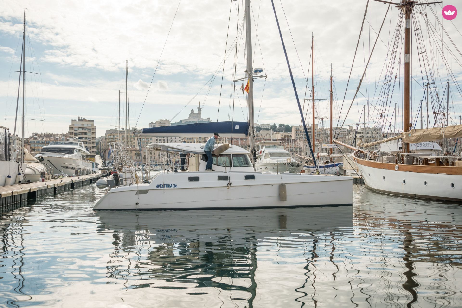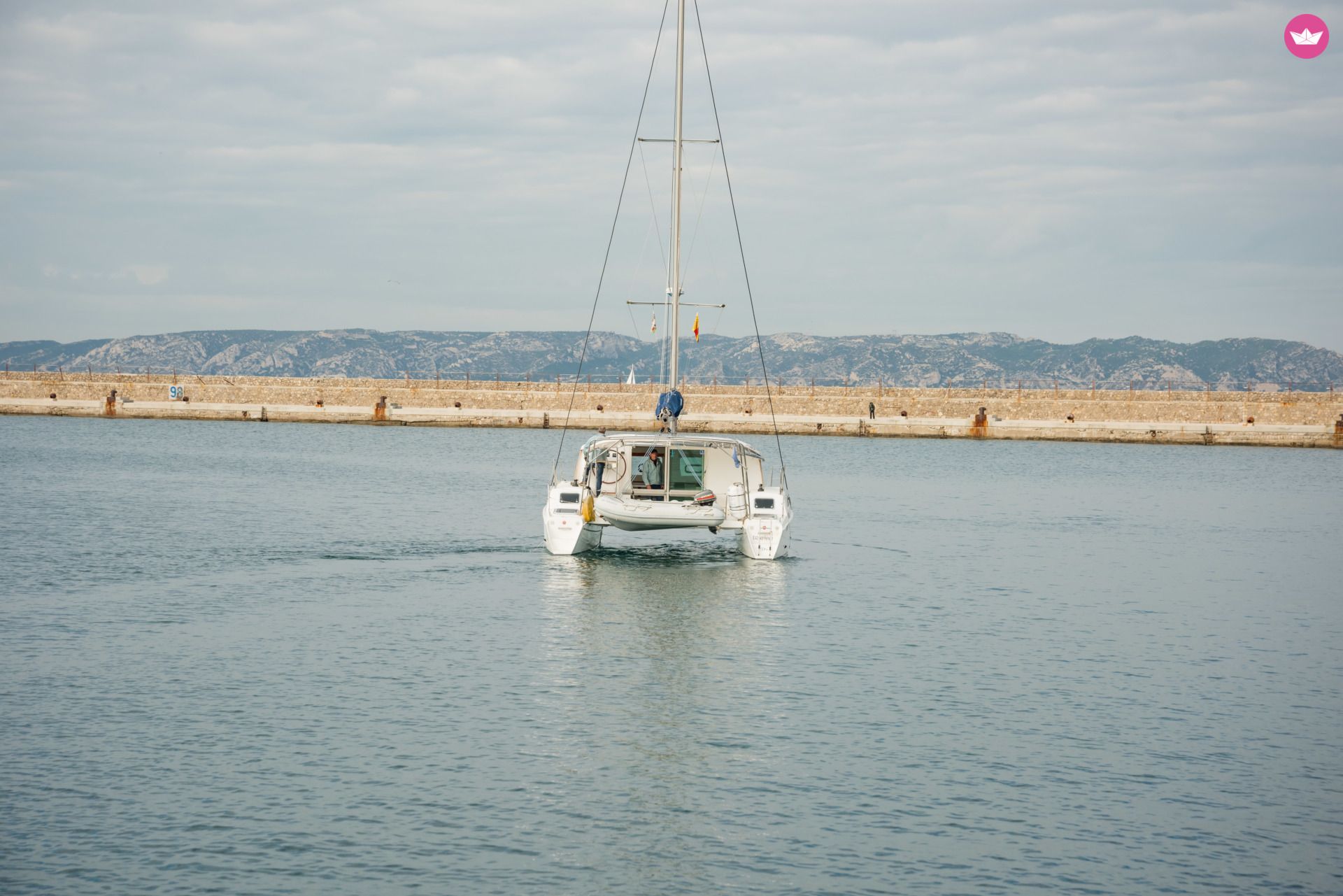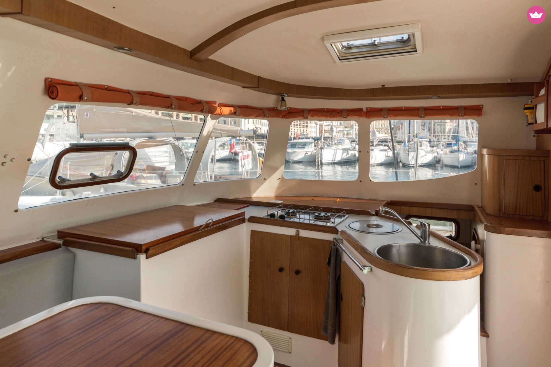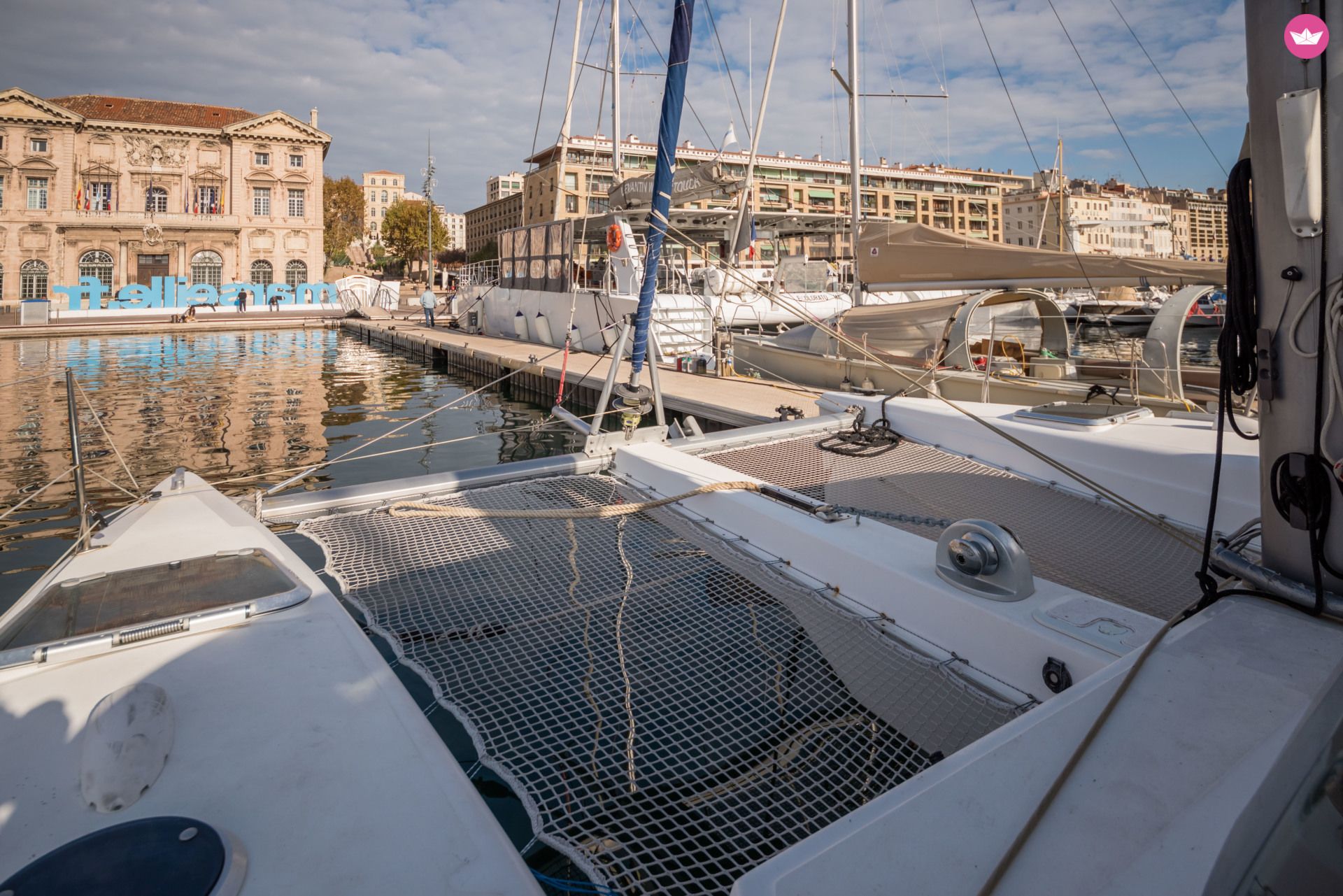 Description of Rémy's catamaran , Bonjour, vivant exclusivement à bord (toute l’année), mes navigations m’amènent à fréquenter de nombreux ports. Aussi je vous propose en co-navigation Trigwen. Le catamaran a une capacité d'accueil pour une sortie à la journée de 7 personnes maximum. Pour une sortie plus longue (plusieurs nuits), 4 personnes est un maximum car Trigwen possède 3 cabines de 2 places. Trigwen a un carré équipé (cuisine, frigo, chauffage, 220 V), un cockpit avec un auvent qui permet à l'escale de doubler la surface, une petite salle d'eau, une douche, une douche de pont. À bord sont installés des rideaux occultants avec moustiquaires. Une annexe semi-rigide avec un moteur de 9,9 CV Trigwen a une garde robe de 4 voiles, l'équipement électronique (logiciel de navigation, AIS, radar) et l'équipement de sécurité (balises individuelles & EPIRB). Les frais d’entretien, de réparations, d’assurance, de port, de carburant etc. m’incitent à vous accueillir à bord de façon ponctuelle afin de participer à ces dépenses Au plaisir de partager une de mes balades ! Kenavo Ar wec’h al