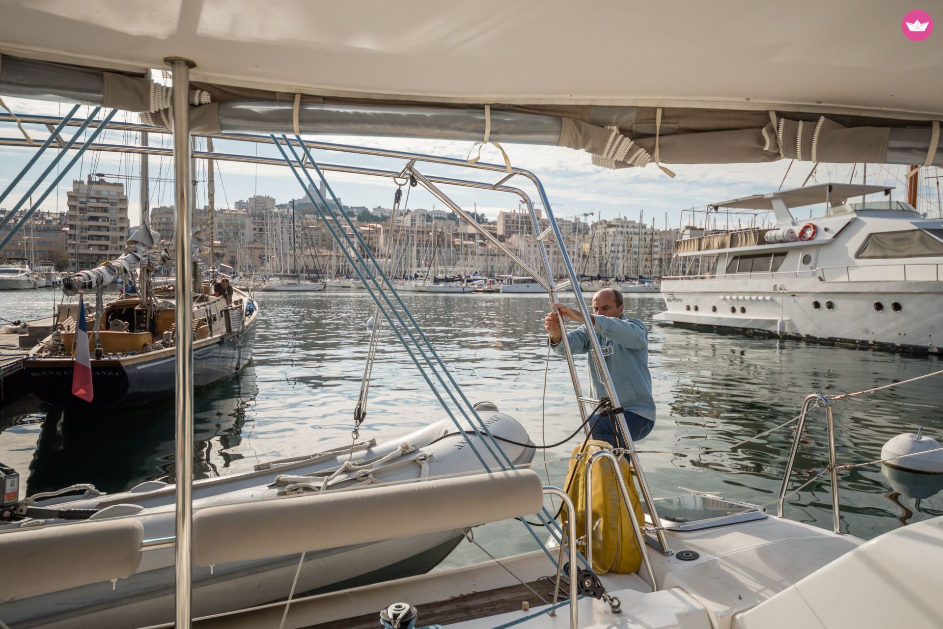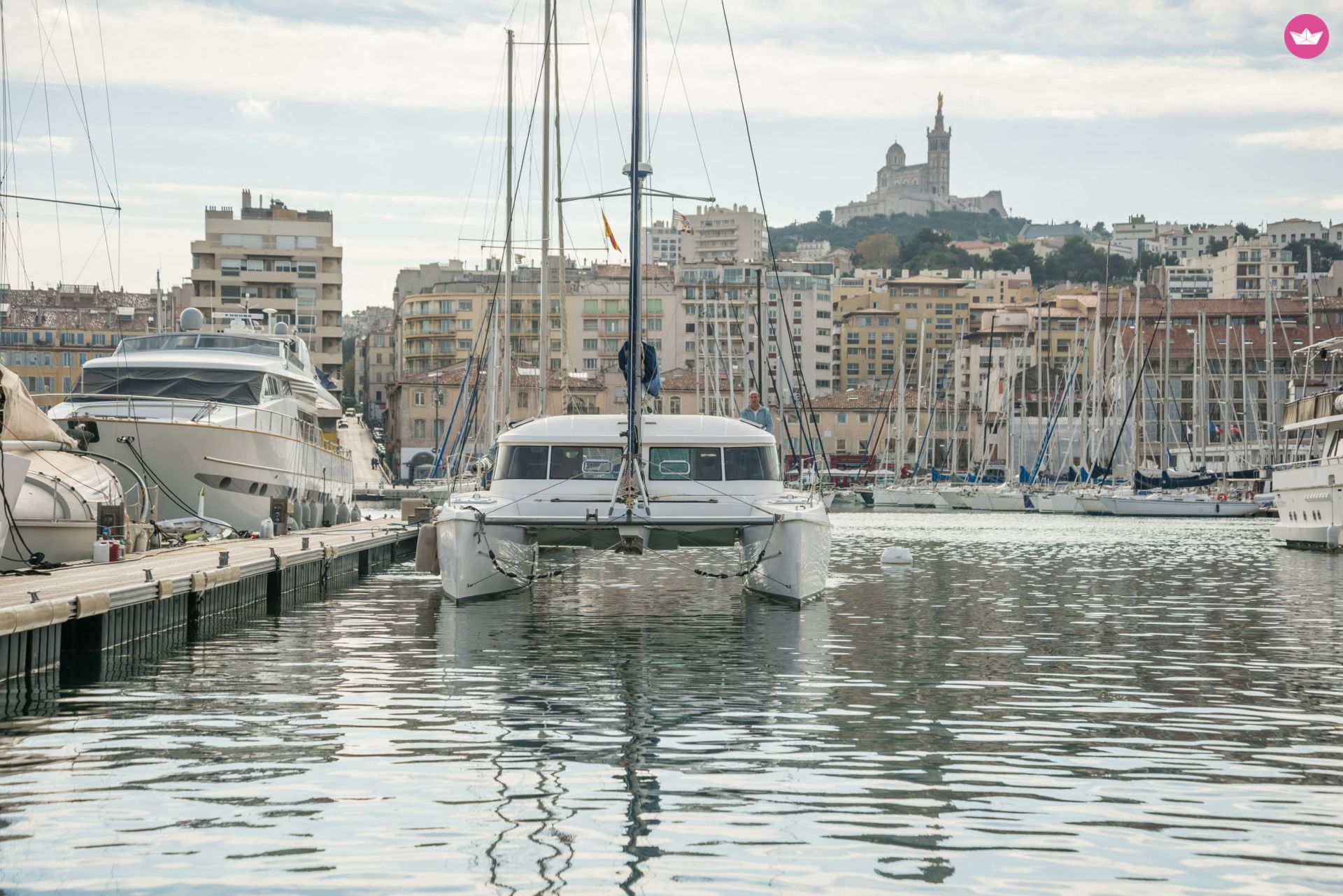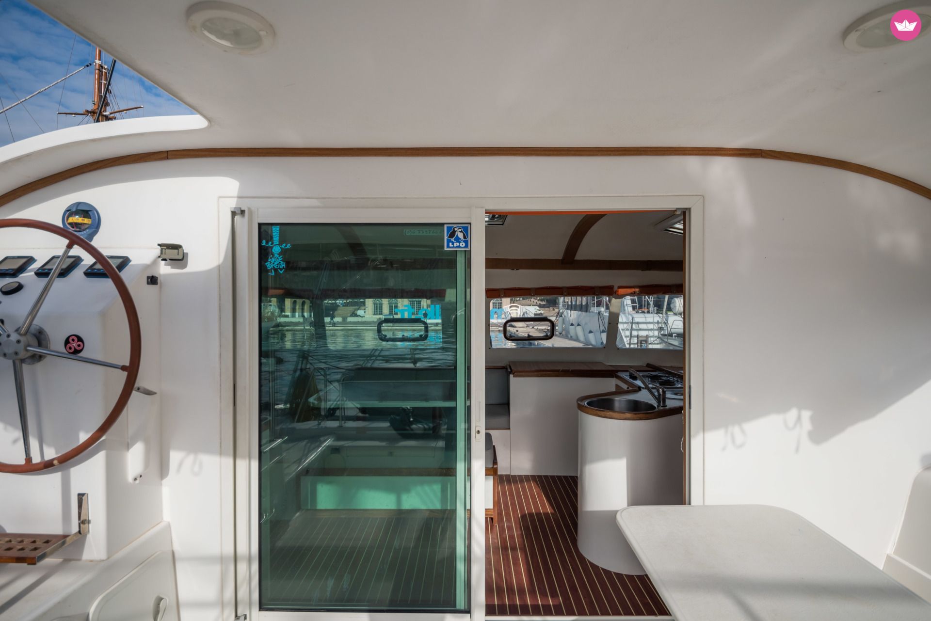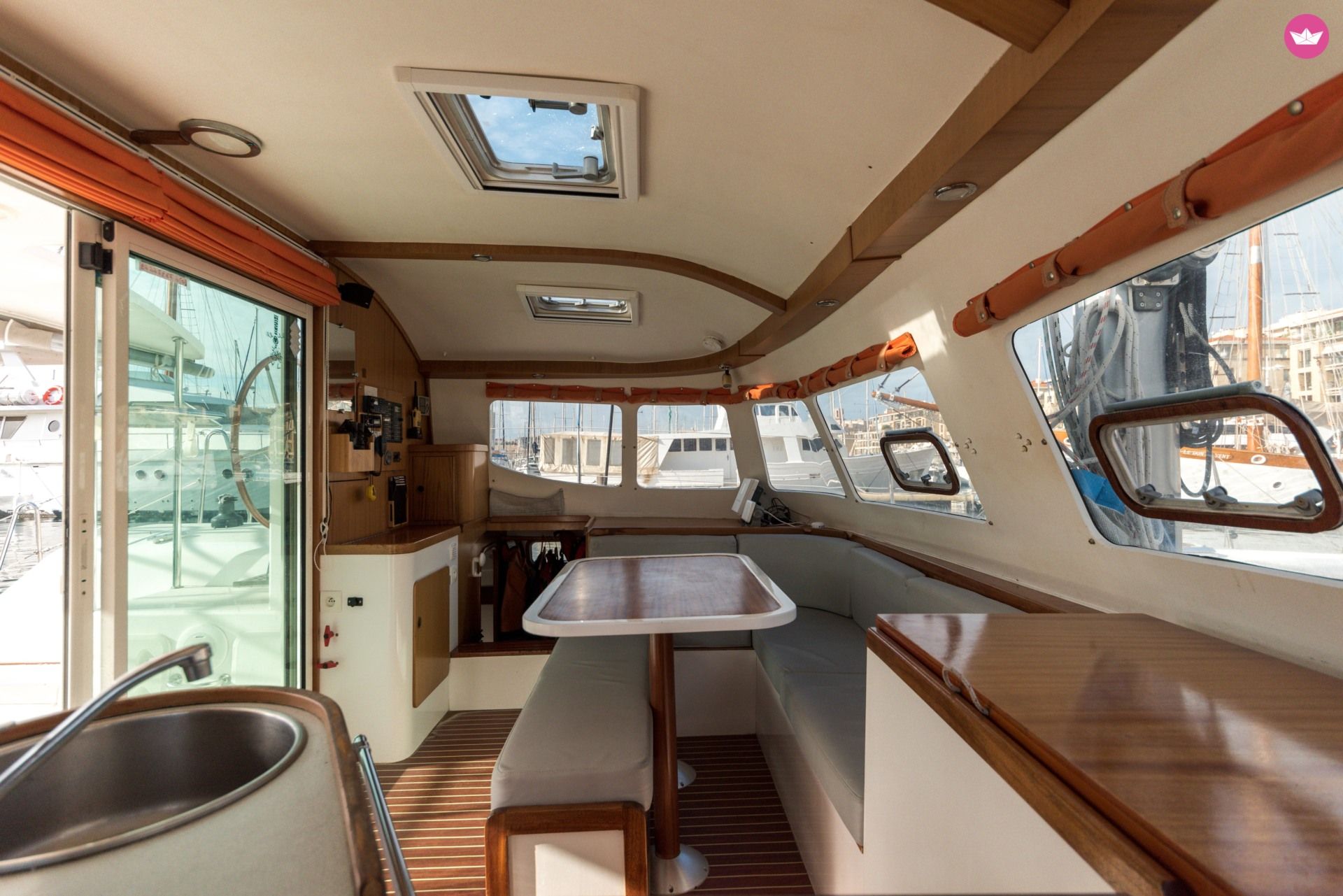 Description of Rémy's catamaran , Bonjour, vivant exclusivement à bord (toute l’année), mes navigations m’amènent à fréquenter de nombreux ports. Aussi je vous propose en co-navigation Trigwen. Le catamaran a une capacité d'accueil pour une sortie à la journée de 7 personnes maximum. Pour une sortie plus longue (plusieurs nuits), 4 personnes est un maximum car Trigwen possède 3 cabines de 2 places. Trigwen a un carré équipé (cuisine, frigo, chauffage, 220 V), un cockpit avec un auvent qui permet à l'escale de doubler la surface, une petite salle d'eau, une douche, une douche de pont. À bord sont installés des rideaux occultants avec moustiquaires. Une annexe semi-rigide avec un moteur de 9,9 CV Trigwen a une garde robe de 4 voiles, l'équipement électronique (logiciel de navigation, AIS, radar) et l'équipement de sécurité (balises individuelles & EPIRB). Les frais d’entretien, de réparations, d’assurance, de port, de carburant etc. m’incitent à vous accueillir à bord de façon ponctuelle afin de participer à ces dépenses Au plaisir de partager une de mes balades ! Kenavo Ar wec’h al