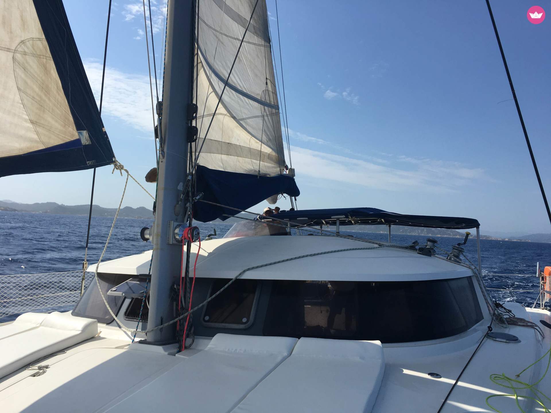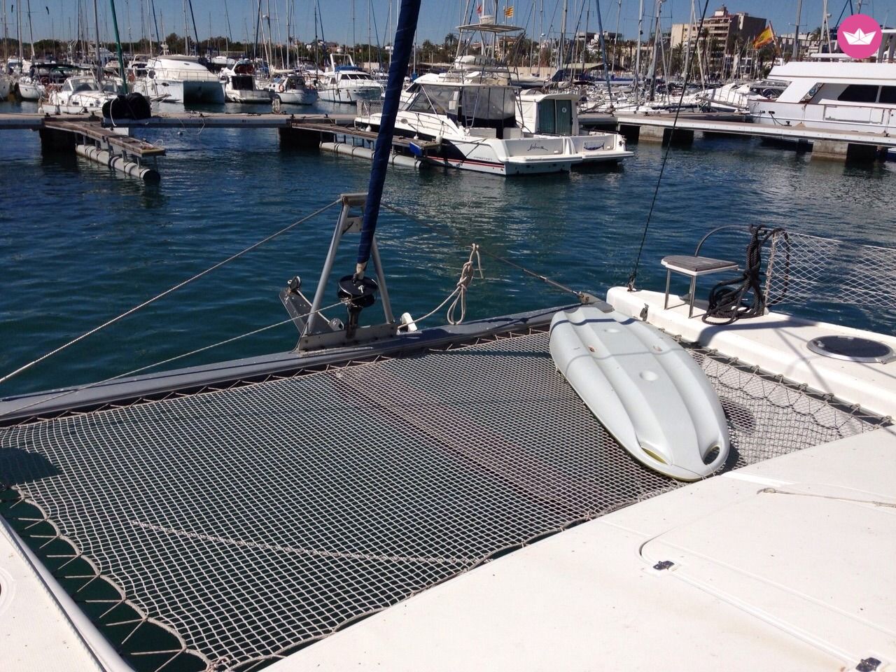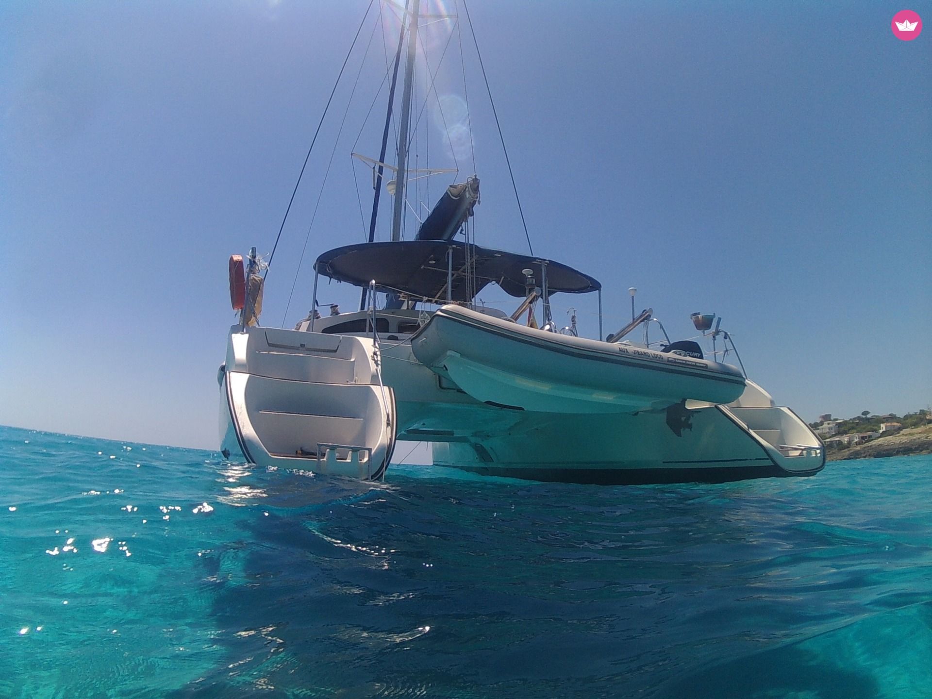 Description of Juan's catamaran Catamaran Belize 43, in excellent condition. Completely refurbished in January-March 2018 including new engines and new hull paint. 4 double cabins. 2 fully equipped bathrooms with electric toilets. Dinghy 3,40m & 20 Hp. Full nav electronics (GPS plotter, wind, etc.) Air conditioning, Watermaker/desalinator 90 liters/hour. Flat screen TV; DVD & CD player. 2 Fridges (freezer). Snorkel equipment. 2 underwater scooters. Paddlesurf. Outside cushions and backrests. Bow cushioned sun lounge, Very fast and comfortable. Ideal for families. The boat is rented with a professional, kind, thoughtful and knowledgeable skipper with more than 20 years of experience. Base Port: Vilanova i la Geltru (Barcelona). Prices with VAT included (except Skipper).