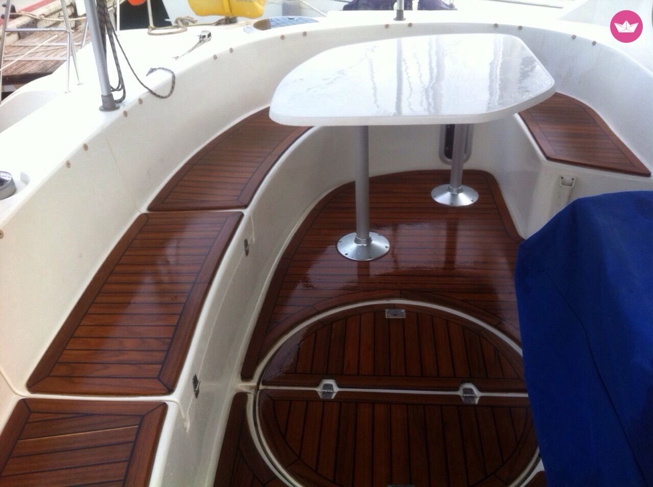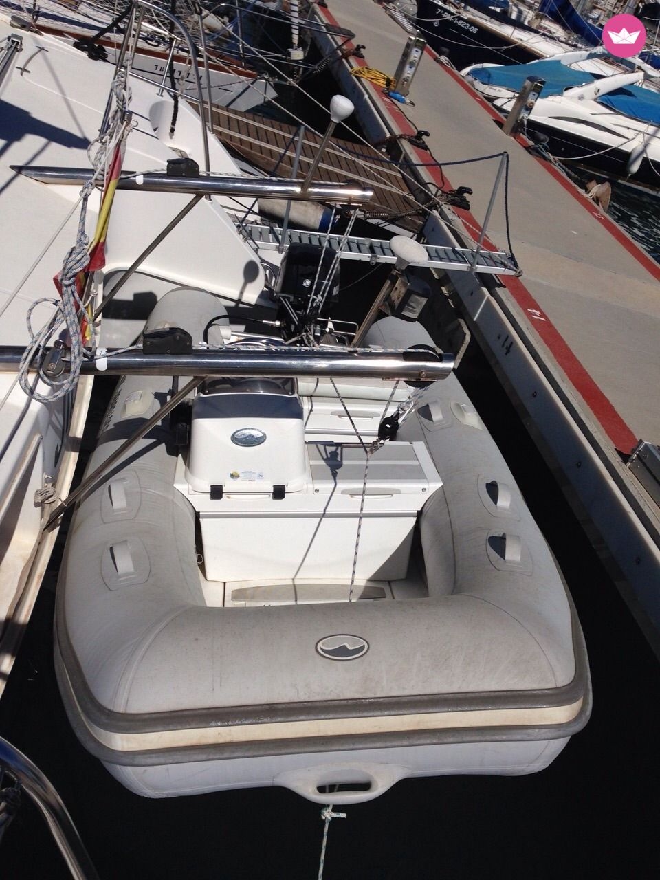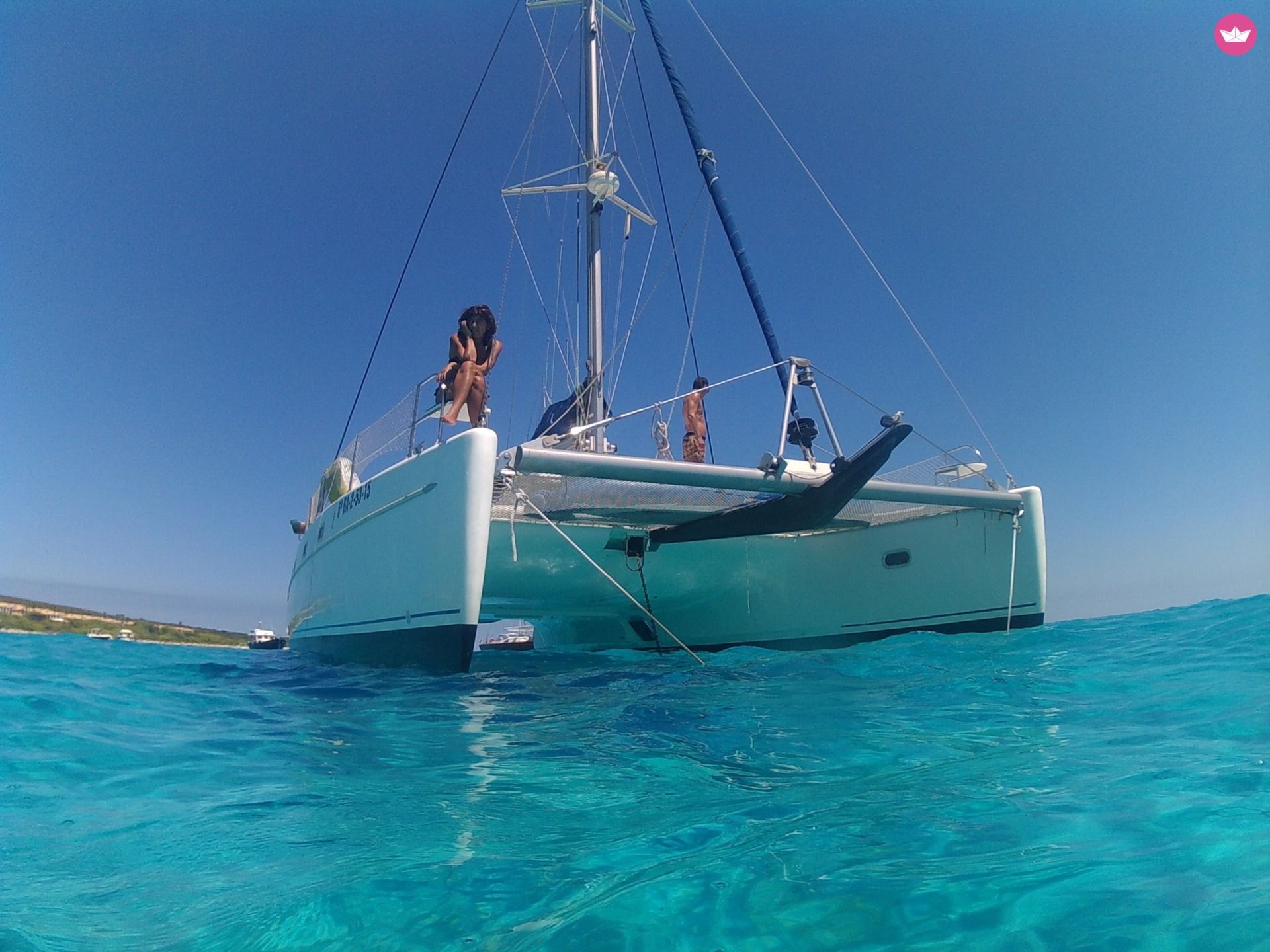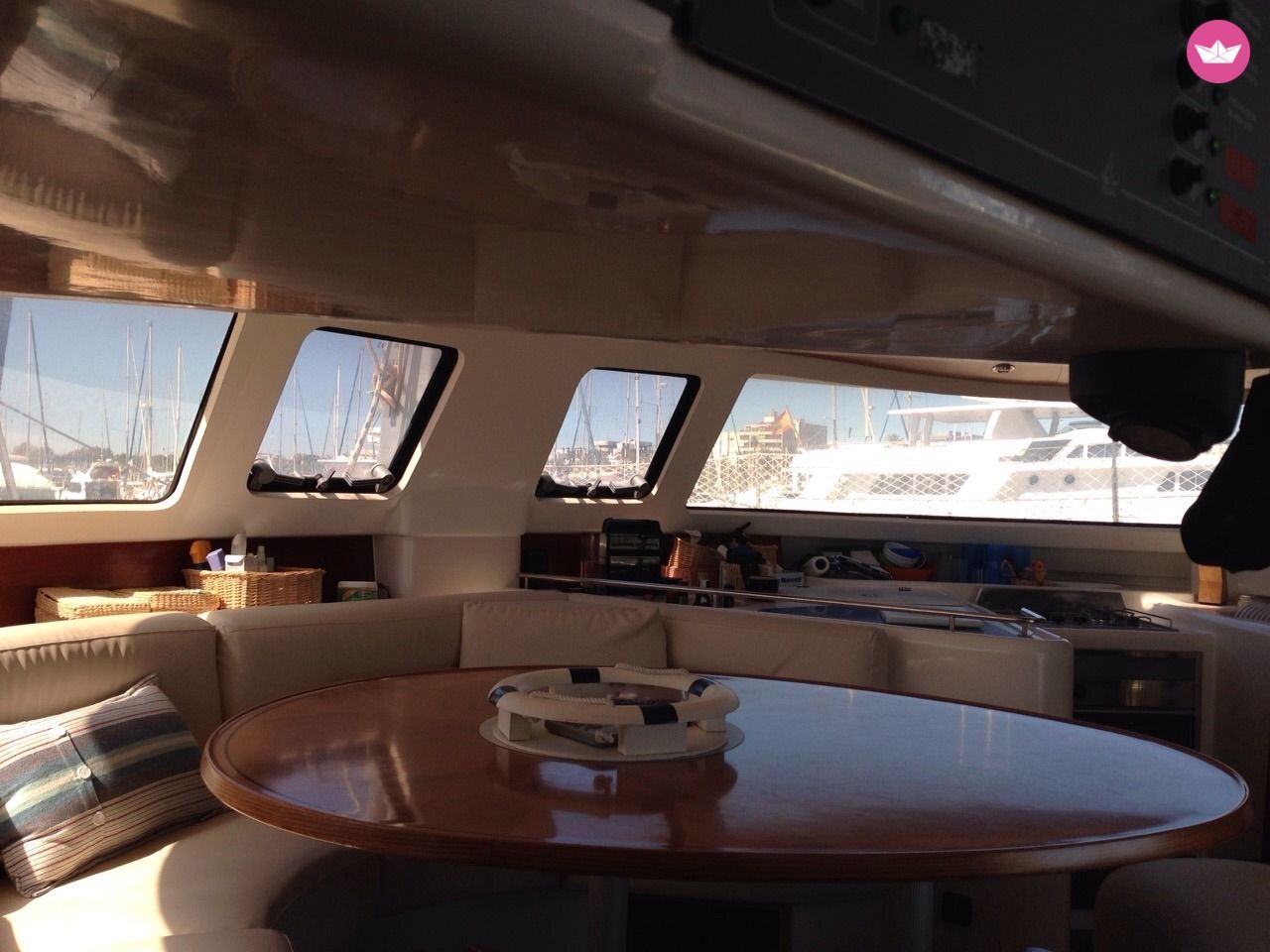 Description of Juan's catamaran Catamaran Belize 43, in excellent condition. Completely refurbished in January-March 2018 including new engines and new hull paint. 4 double cabins. 2 fully equipped bathrooms with electric toilets. Dinghy 3,40m & 20 Hp. Full nav electronics (GPS plotter, wind, etc.) Air conditioning, Watermaker/desalinator 90 liters/hour. Flat screen TV; DVD & CD player. 2 Fridges (freezer). Snorkel equipment. 2 underwater scooters. Paddlesurf. Outside cushions and backrests. Bow cushioned sun lounge, Very fast and comfortable. Ideal for families. The boat is rented with a professional, kind, thoughtful and knowledgeable skipper with more than 20 years of experience. Base Port: Vilanova i la Geltru (Barcelona). Prices with VAT included (except Skipper).
