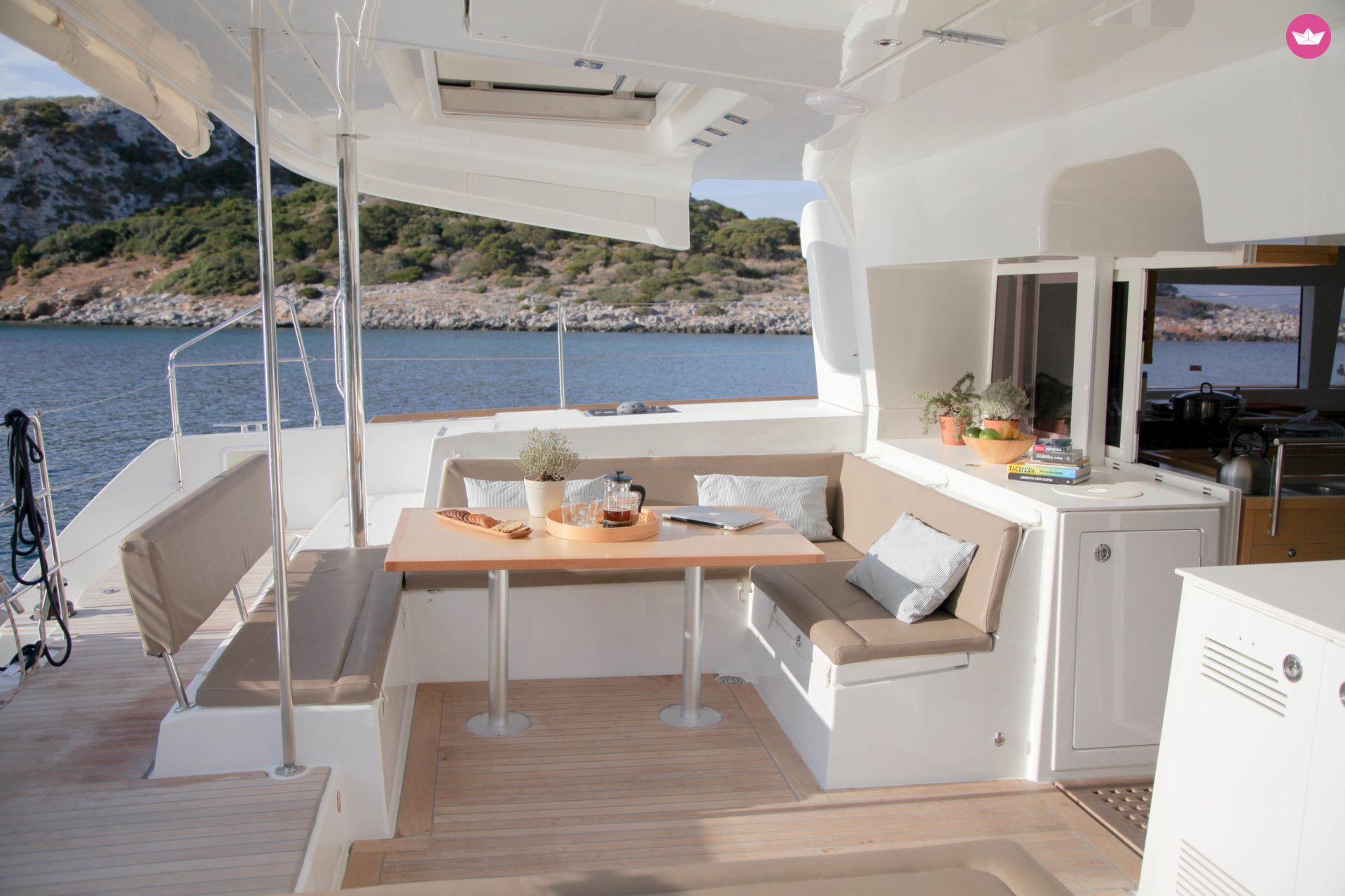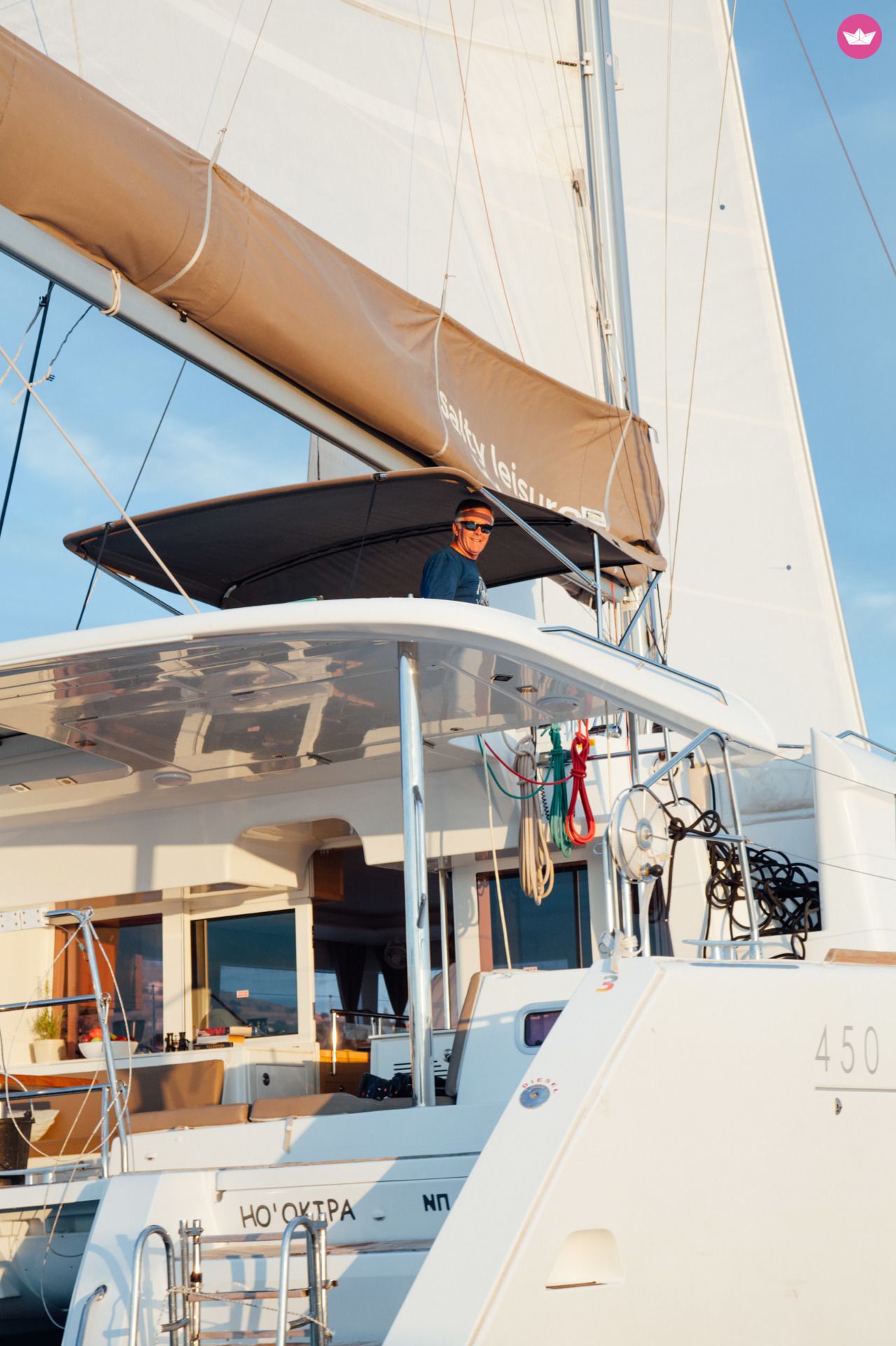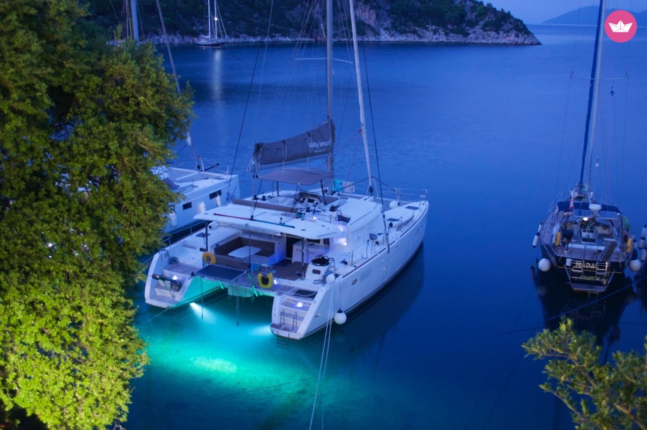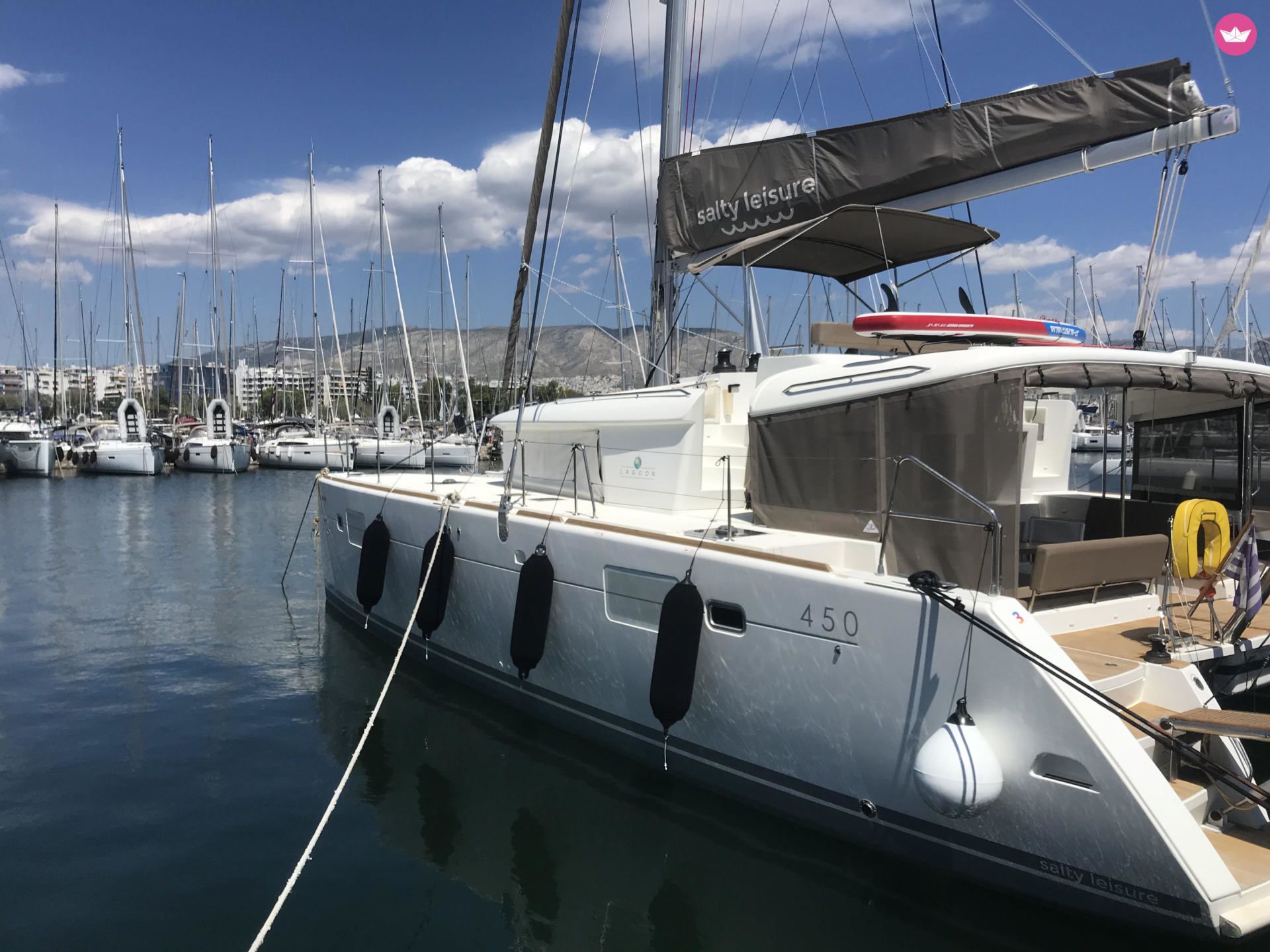 Description of Dimitris's catamaran Our Lagoon 450 is kept in immaculate condition throughout the season and has all the extras one could ask for including a beautiful teak deck, A/C, watermaker, generator, full enclosure aft deck to give you extra privacy and protection from the wind, underwater lights, electrical gangway and more. It has 4 double cabins with 4 bathrooms and can be equipped with paddleboards, windsurfing equipment, snorkelling gear, fishing gear etc.