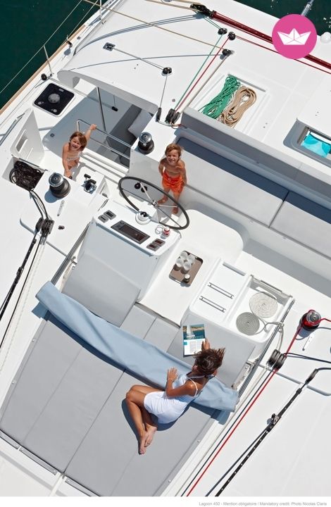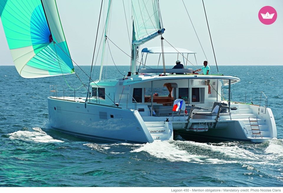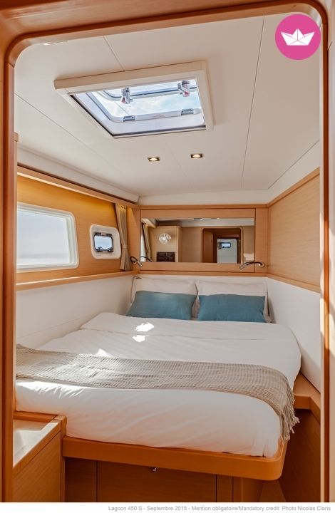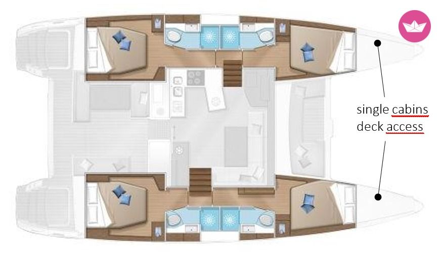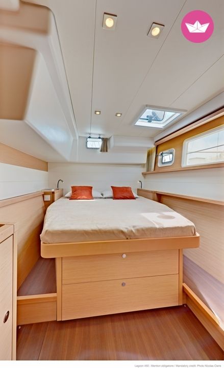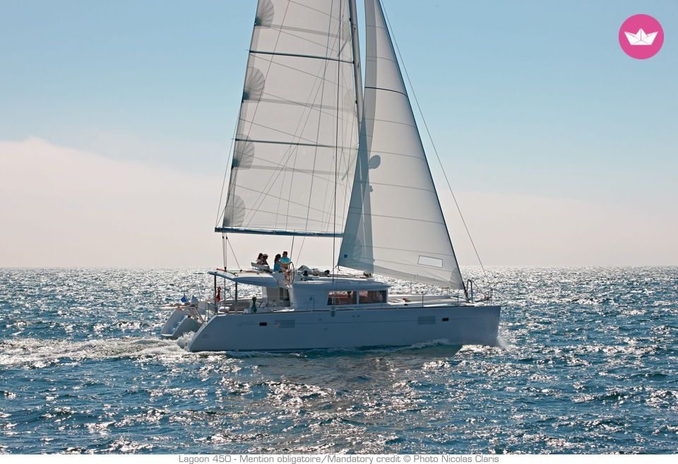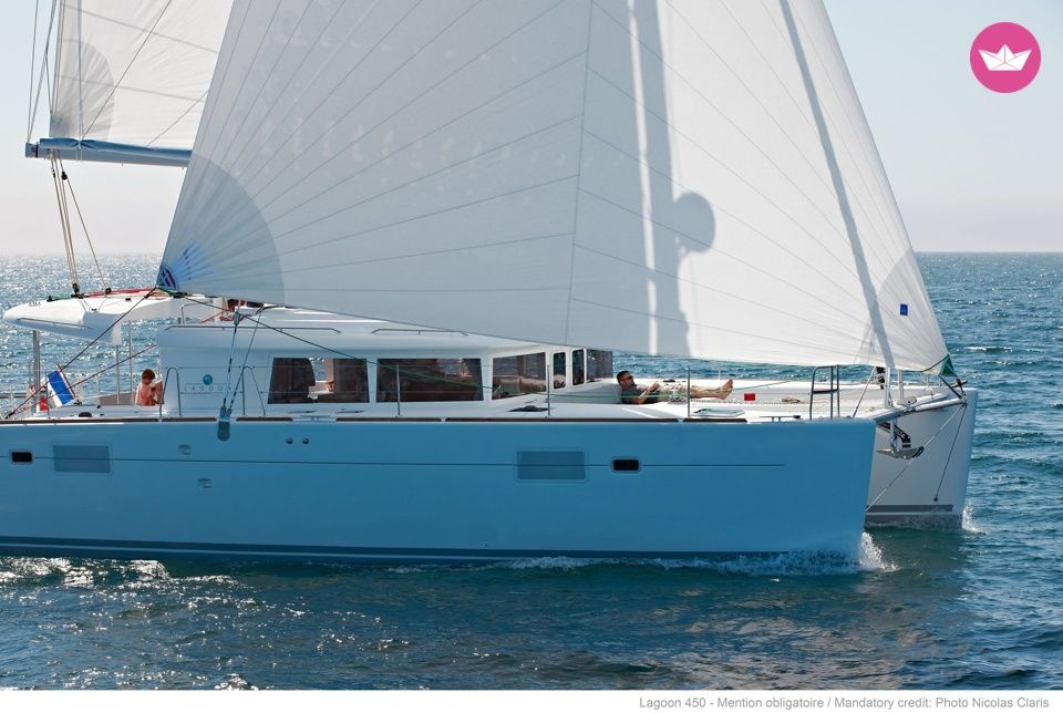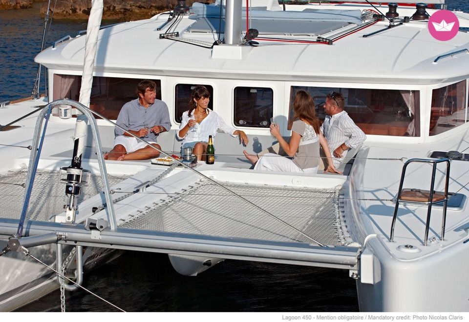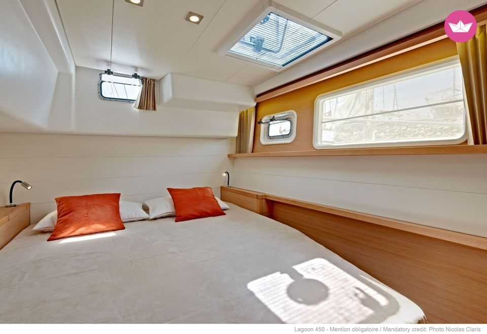 Description of Agnes's catamaran OUTER APPERANCE A steering station on the fly bridge of Lagoon 450 F has a safe access from both sides for perfect visibility and a large sunbathing area. A spacious cockpit, again ideal for sunbathing, on the same level as the galley, with a ventilation panel, with a second cockpit, making best use of the forward area. Particularly safe and effective transom platforms for coming aboard or accessing the dinghy. INTERIOR Interior design by Nauta: elegance and functionality saloon and cabins exceptionally well lit. Natural light in cabins thanks to large glazed panels on hulls. Comfortable guest cabins with a side access to the double bed. “U”-shaped galley for greater comfort at sea, equipped with large hot plates, broad work space and plenty of storage. Optimization of the access between the cockpit and the galley engine compartments remote from the living areas and perfectly insulated. Boat offers 4 double cabins nad 2 single cabins. Available for max 10 Guests.