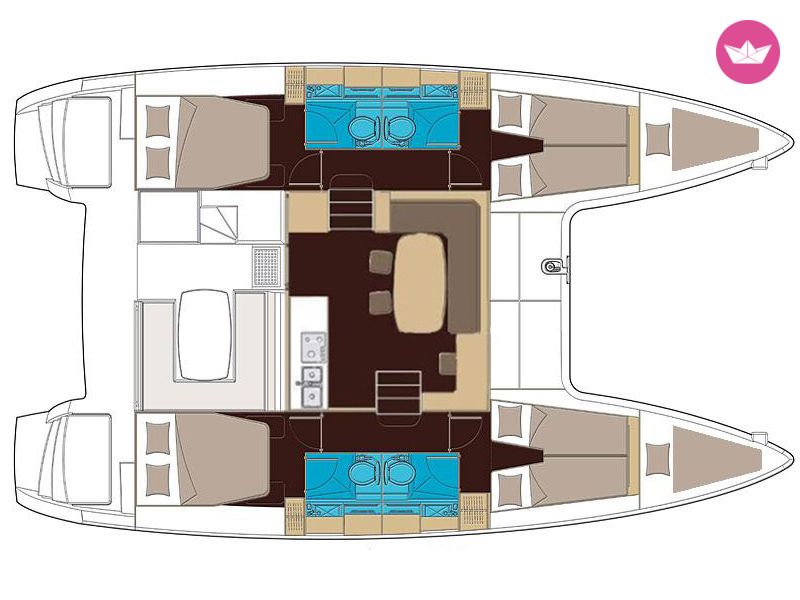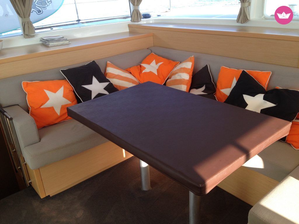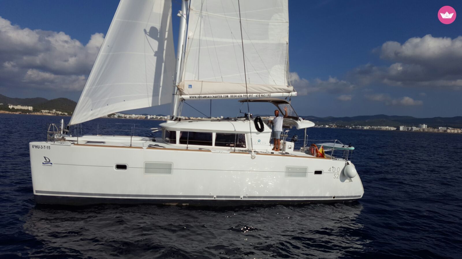 Description of Isabel's catamaran , El catamarán lagoon 400s2 combina confort excepcional con un excelente diseño . Sus máximas comodidades con generador 220 v para tener todo lo que necesites conectado y potabilizadora de agua del mar para no tener que ir a repostar a puerto hacen de Alquilar el catamaran Lagoon 4oo en Ibiza y Formentera un buen plan de vacaciones Este Catamaran cuenta con una amplia bañera con una mesa y sofá en u para 8 personas donde disfrutaras de momentos para recordar en Ibiza. Si lo que prefieres es descansar y disfrutar del sol y la brisa marina de Ibiza, este catamarán cuenta con un FlyBritge donde tomar el sol, también tiene unas colchonetas en la Red para relajarse ; Para leer recomendamos su Chaise Longe! Sus 4 cabinas dobles en suite con 4 Wc electricos dan cabida a 8 pasajeros con la mayor comodidad. En el salón el sofá se puede convertir en cama por lo que pueden dormir 10 pasajeros! Tiene extraordinarias cualidades de navegación, que permiten al barco arrancar rápidamente con una pequeña brisa y navegar a vela por Ibiza. Su manga generosa para un barco de menos de doce metros con cubierta alta y despejada ofrece a este Lagoon 400S2 una habitabilidad sorprendente, comparable a la de un barco con una longitud más larga. Su gran salón con vistas panorámicas de 360º y amplias cabinas interiores que permiten la entrada de luz, significa que es un barco para navegar y vivir. Cuenta con música buetooth con altavoces por todo el catamarán para escuchar tu música en un ambiente inmejorable! El Catamaran Lagoon 400 S2 “Nailah” cuenta con una zodiac auxiliar con motor de 6Cv con la que podréis explorar y desembarcar en los mejores restaurantes de Ibiza. Podrás disfrutar explorando las calas de Ibiza con el paddle surf que lleva a bordo! EL catamarán Lagoon 4oo s2 “Nailah” esta a tu disposición, alquila este catamarán y navega por Ibiza y Formentera!