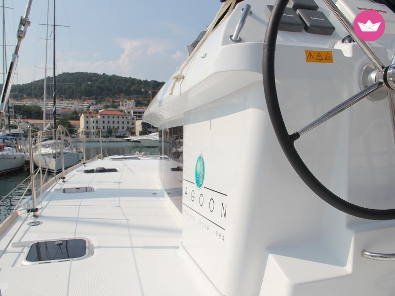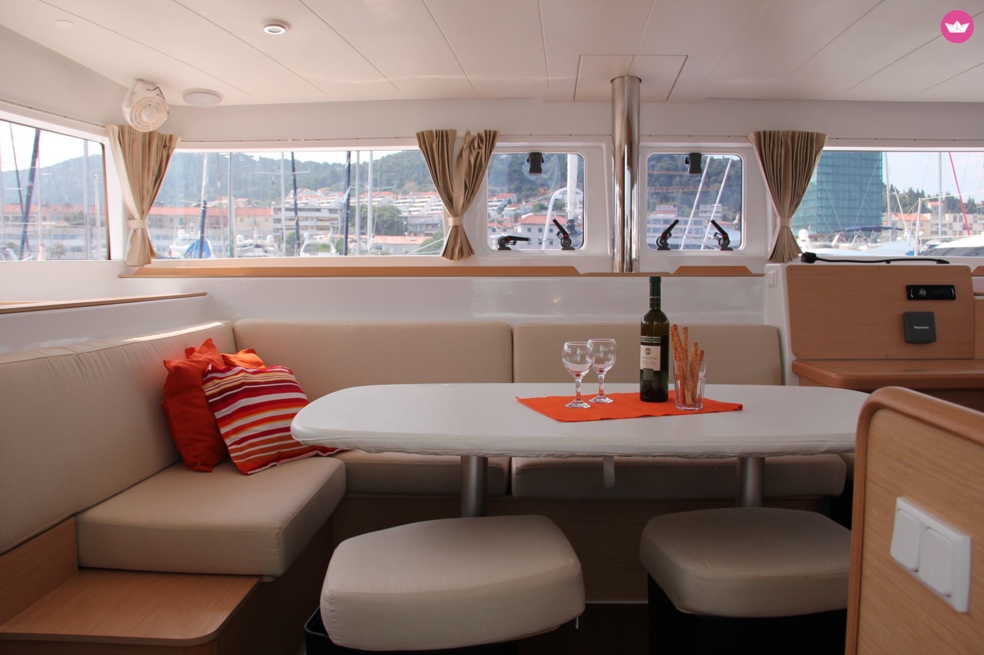 Description of Dragana's catamaran Explore magnificent Croatian coast with the most comfortable type of the boat - catamaran. My Lagoon 400 is moored in Split so after visiting Diocletian palace you will probably want to escape the crowded streets and beaches and my catamaran is ideal for that. You can explore nearby islands such Šolta or Drvenik. Or you can drop the anchor and take a tour through the old town of Hvar or check the most beautiful beach Zlatni rat on island Brač. The catamaran has 4 double bed cabins, two single cabins and spacious saloon where two more people can sleep.Each double bed cabin has an own toilet. For all questions write me the message via Catamaran Yacht Charter