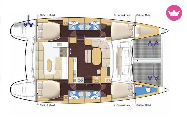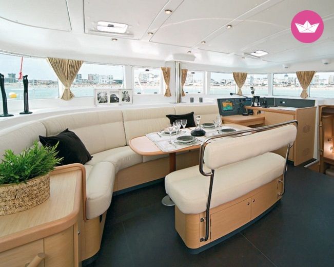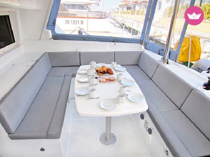 Description of Sophie's catamaran , Noleggio questo meraviglioso Lagoon 440 per trascorrere rilassanti giornate in compagnia della famiglia o degli amici. I catamarani sono particolarmente adatti a chi vuole godersi l'esperienza di una crociera a vele senza dover rinunciare al confort di casa. Questo catamarano dispone di quattro comode cabine doppie con letto matrimoniale ognuna fornita del proprio bagno privato con doccia. A prua c'è una quinta cabina con bagno per lo skipper. La dinette è molto grande e luminosa e dispone di un grande tavolo con divano circolare per mangiare all' interno. Ci sono anche una pratica cucina attrezzata per molteplici preparazioni e un tavolo da carteggio. All' esterno c'è un comodo pozzetto con una seconda zona pranzo coperto da hard top. La postazione di guida è posizionata sul fly garantendo una visione a 360 gradi. Il costo delle skipper è di 150€ al giorno. Con questo catamarano potrete godervi meravigliose veleggiate nell' arcipelago toscano o fare rotta per la Sardegna o la Corsica. Scrivetemi su Catamaran Yacht Charter per avere maggiori informazioni su questo meraviglioso Lagoon 440!
