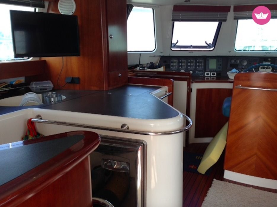 Description of Claude's catamaran , Bonjour, Je vous propose à la location mon Fontaine Pajot Maryland 37 au départ du port de Saint-Cyprien. Le bateau est disponible uniquement avec un skipper professionnel à bord ainsi qu'une hôtesse. Le Maryland est un catamaran propulsé par un moteur de 340 chevaux. Grâce à sa largeur, il est très stable en mer et très agréable à la navigation. A bord du bateau, vous trouverez 3 cabines double ( dont 1 pour l'équipage) ainsi qu'un carré convertible qui vous offre la possibilité de 6 d'y dormir jusqu'à 6. Pour une sortie à la journée, le bateau est homologué pour 10 personnes. Le bateau est très équipé et très agréable pour y vivre : vous trouverez une cuisine équipée, deux salles de bain ainsi qu'un salon spacieux et lumineux. A l'extérieur, il y a un large carré à l'arrière du bateau ainsi que de nombreux bains de soleil. Vous trouverez également un fly, idéal pour profiter du soleil. De nombreuses sorties s'offrent à vous au départ de Saint-Cyprien. Je vous conseille de prendre la direction de l'Espagne pour vous diriger vers Cadaqués en passant par El Port de la Selva. Il y a de nombreuses criques et de très beaux mouillages. Le prix comprend le skipper ainsi que l'hôtesse. A votre charge, le carburant. Pour plus d'informations, vous pouvez m'envoyer un message via le site Catamaran Yacht Charter, je me ferai un plaisir de vous répondre. A bientôt,