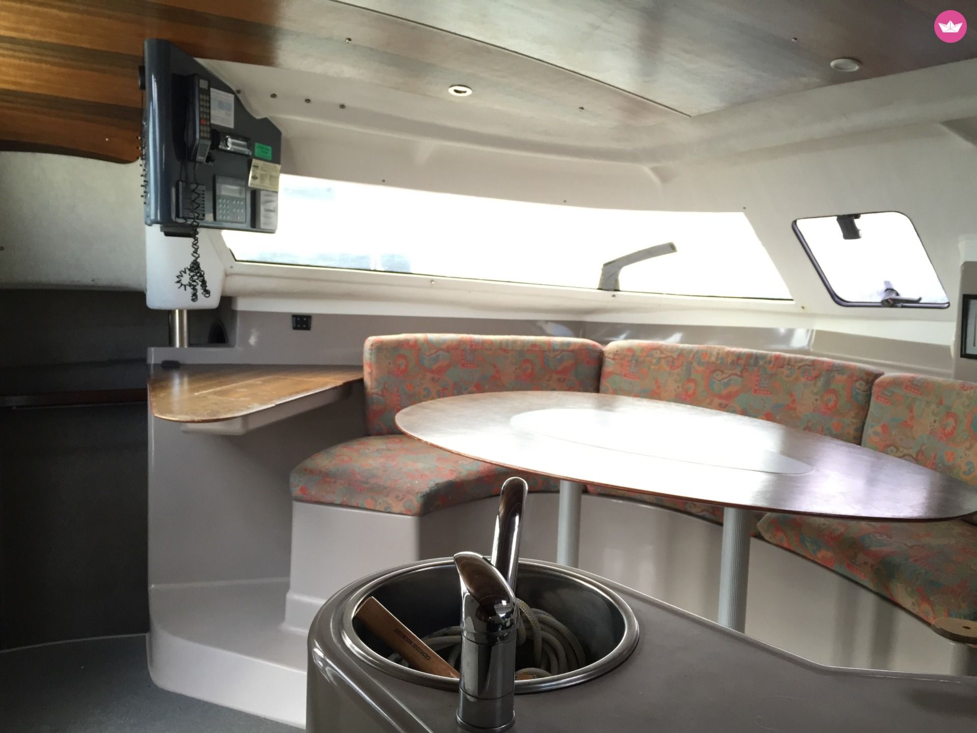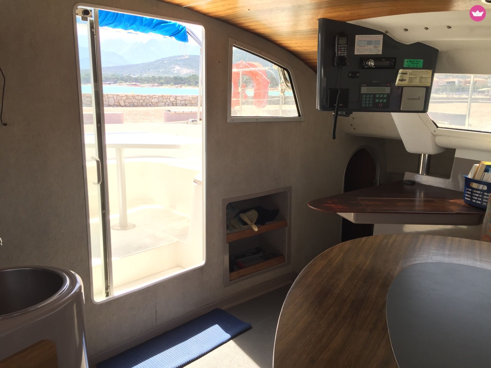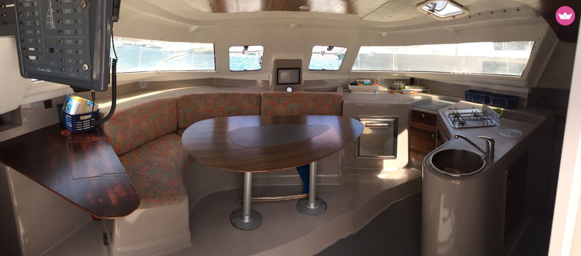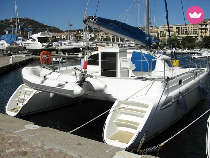 Description of Sabrina's catamaran , Le Tobago 35 de chez Fountaine Pajot est un catamaran à voiles très convivial qui peut accueillir jusqu'à 6 personnes (3 cabines doubles). L'embarquement se fait à Calvi à 10h le samedi, et le débarquement le vendredi à 16h. Parfait pour effectuer une belle semaine de navigation du côté du Cap Corse (Île Rousse, Golfe de Saint-Florent...). Ce catamaran est notamment équipé d'un génois sur enrouleur, genaker, lazy bag, et une annexe semi-rigide et motorisée est à votre disposition ! Réservoir fuel : 140L Réservoir eau : 250L À noter que deux options sont obligatoires avec la location de ce catamaran : le nettoyage (200€) et le règlement des consommables (pile, gaz) : 50€. Départ le samedi à 12h, retour le vendredi à 18H. Possibilité de quitter le bateau à 8h le samedi sous condition. Merci de compléter votre CV nautique ou de préciser vos expériences en mer dans votre demande de réservation. C'est le catamaran idéal pour naviguer avec des amis ou en famille. Le tarif de location est attractif et ce bateau est toujours très bien entretenu et vous permettra de profiter convenablement de vos vacances en Corse. Veuillez également noter qu'une fois la réservation confirmée, il n'y a pas d'annulation possible. Je vous recommande donc vivement de souscrire à une assurance annulation (i.e Mondial Assistance proposé par Catamaran Yacht Charter)