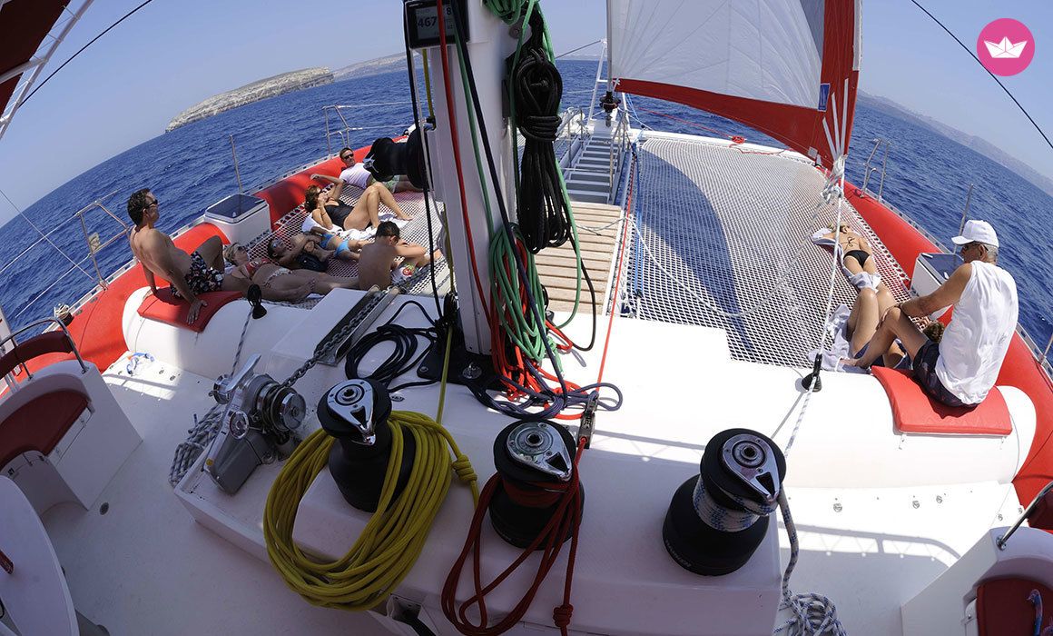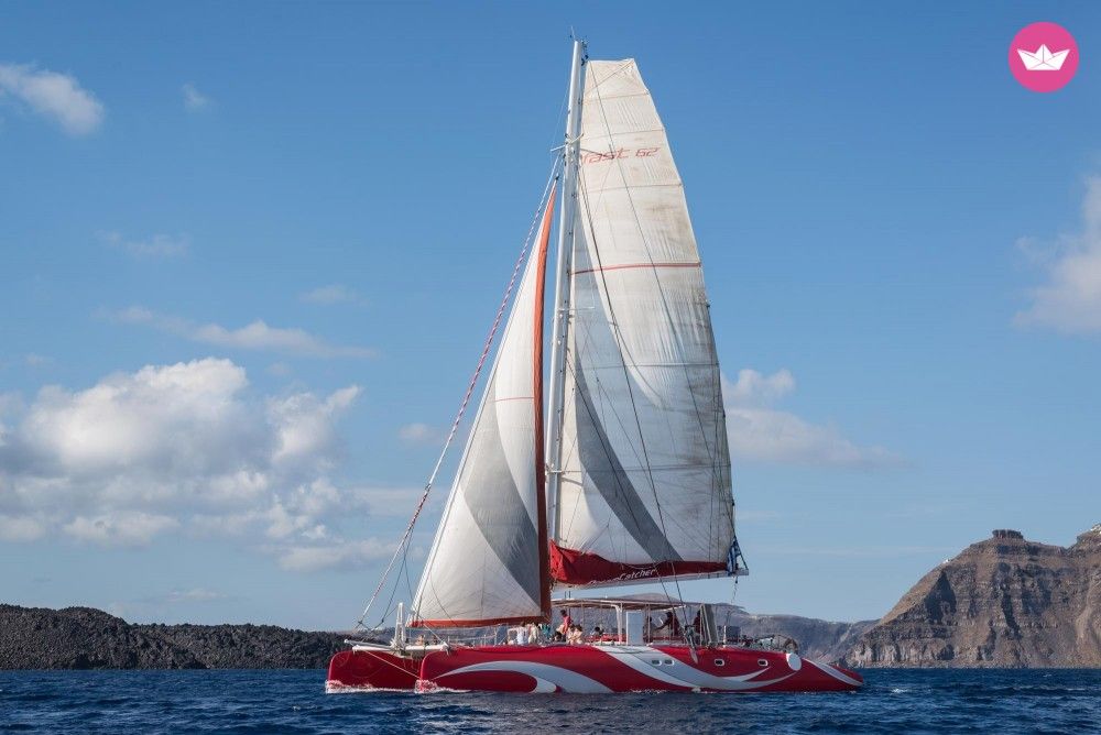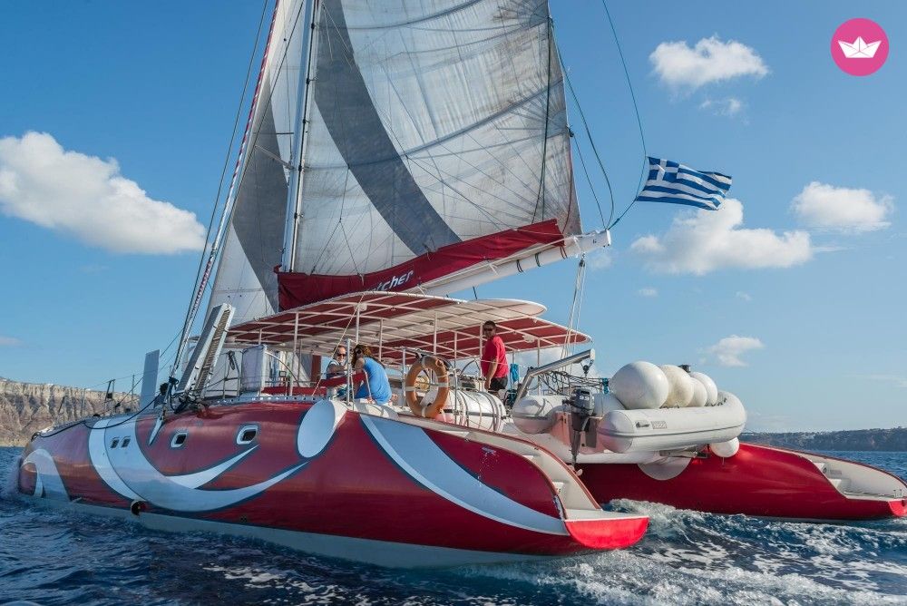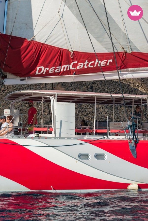 Description of Dina's catamaran **************************************************************************************************************************** DISPLAYED PRICE FOR 26 GUESTS | For each additional guest +80E 2 Cruises per day: - Day Cruise 10AM - 15PM - Sunset Cruise 15PM - 20PM Introducing you Santorini's fastest sailing yacht "Dream Catcher". Our catamaran is a 62ft yacht and the fastest one in Santorini! It will surely create the best memories out of your experience in Santorini. Its large spaces allow to you and your group of friends to spend together an unforgettable day, sailing to the breath taking spots of Santorini. In particular, this catamaran can take up to 34 people, making it one of the top choices for sailing in Santorini! It's not a coincidence that famous TV Shows have taken place in this boat, such as "The Kardashians"! We offer a luxury product in the price for any budget-conscious person! Many TV shows have been filmed on board, such as "The Kardashians"! Included in the price: - Roundtrip transfers from/to the hotelfor all semi private bookings - Full Greek BBQ lunch or dinner - Soft drinks, Water, Beer and Wine - Snorkeling Equipment - Windbreakers - Wi-Fi Access upon network availability Menu: - Grilled marinated chicken fillet - Grilled marinated steak cutlets - Freshly baked vegetables - Penne Santorini - Traditional Greek salad (Vegetarian) - Olive pate (Vegetarian) - Homemade Tzatziki (Vegetarian) - Freshly baked Bread Send us a message through Catamaran Yacht Charter and we hope to see you soon! ****************************************************************************************************************************