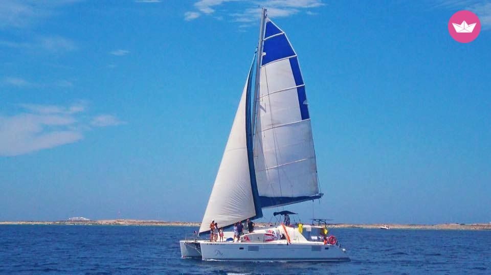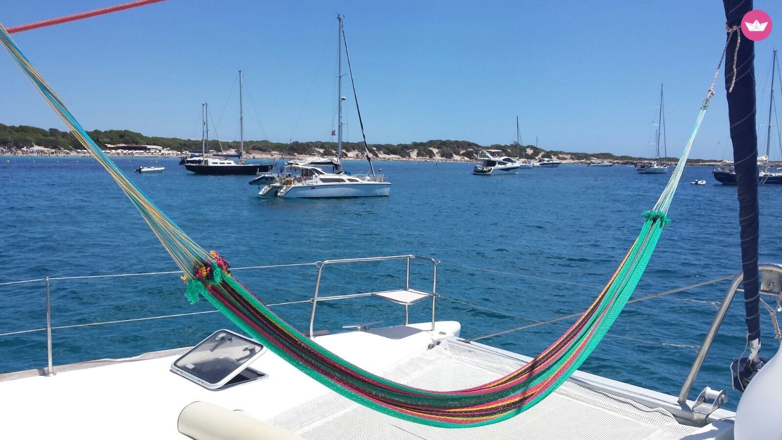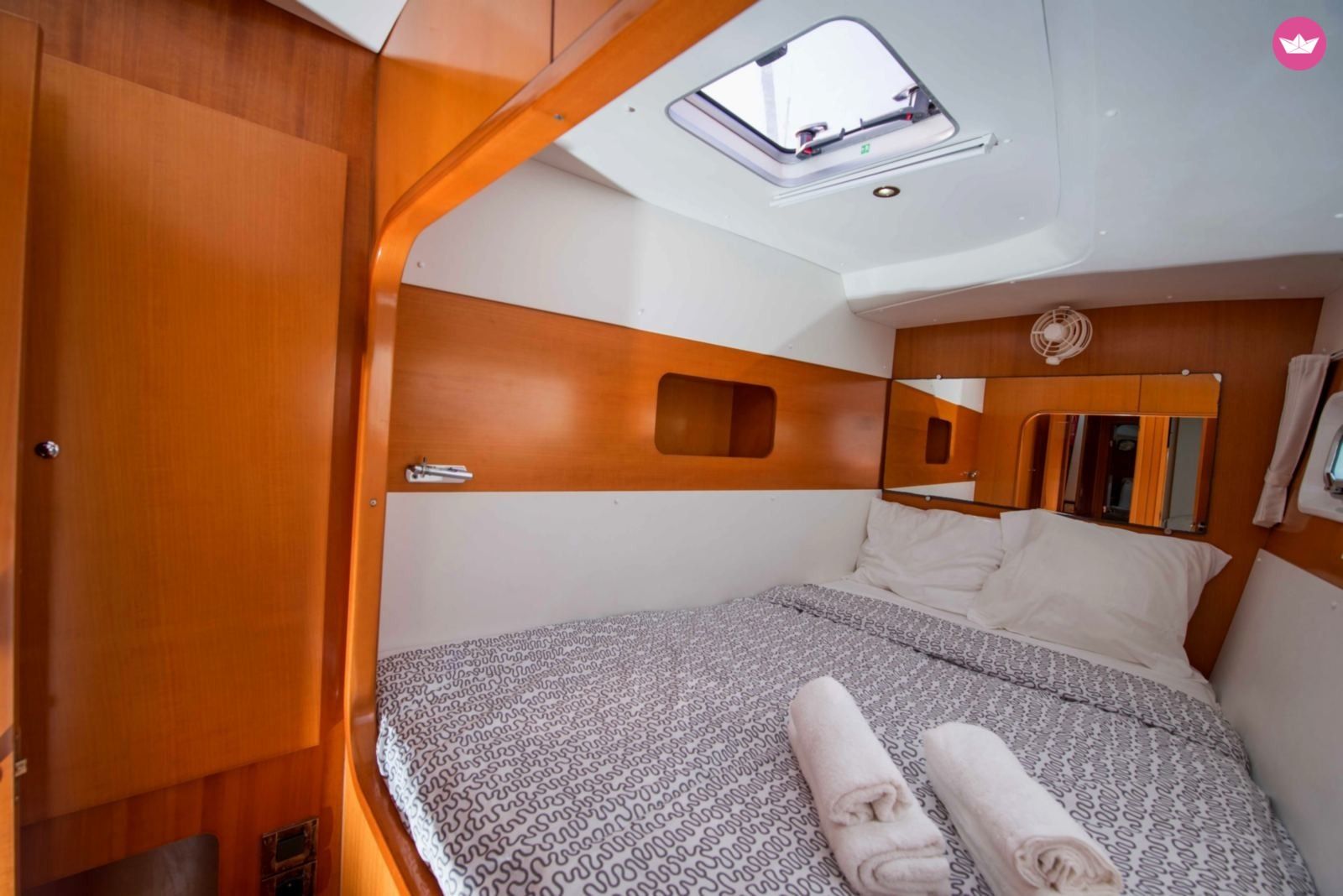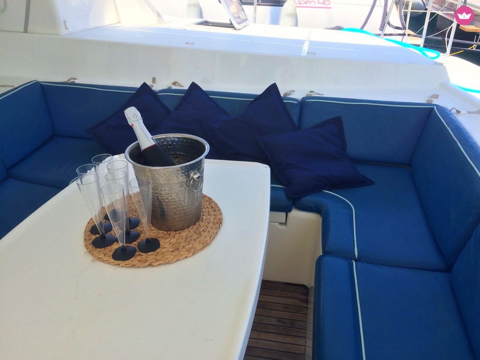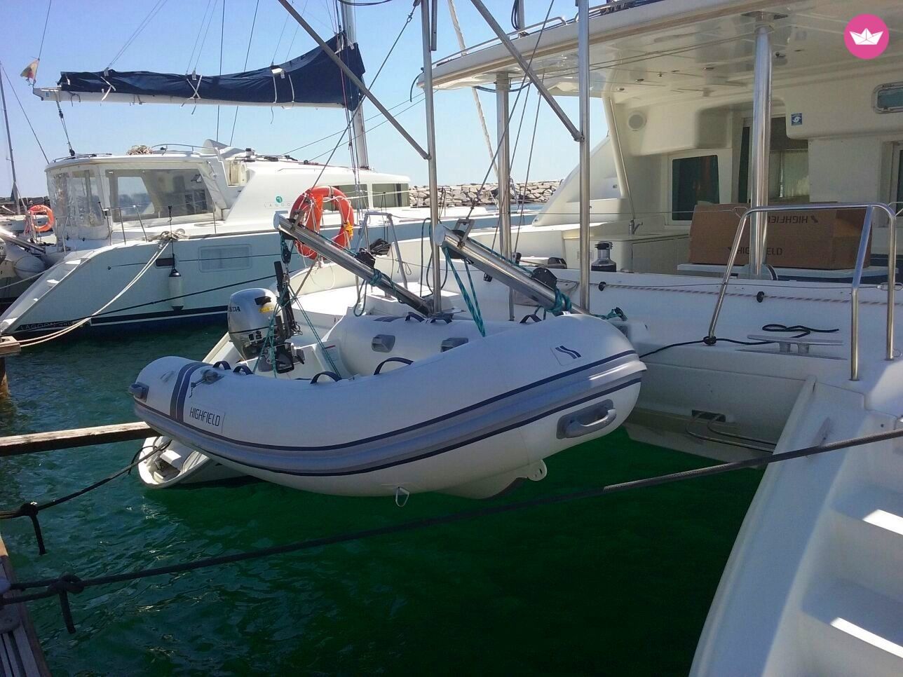 Description of Alejandro's catamaran Pia is well sorted for short or long stays. With a major refit in 2017 the experience is that of a new Lagoon 440 catamaran, the most comfortable for crewed vacations. There is full kitchen equipment that ensures best cooking experience. Also 2 brand new fridges and 1 freezer ensures you preserve your meal in perfect conditions in balearic summer. Comfort comes in the form of new exterior cushions, as well as comfortable bow net (can lie directly on it without marking yourself). Hot fresh water stern shower ensures you wipe off your salt after swimming. For entertainment you will enjoy floating cushions, as well as stand up paddle board, snorkeling equipment including finns, hammock. The underwater lights will help you enjoy the wandering fish at night. External amplified HiFi system which reads USB, Aux, or CDs make the most of the trip. Also there is a TV with chromecast to watch movies if needed before night rest. 900 litres of water are usually enough for a weeks' stay, but there is a watermaker that can help in case of shortage. 220V inverter will be usefull to charge cameras or other equipment, but also USB charging dock is available. There are 3 solar panels that will help reduce engine hours destined to replenish batteries (and avoid overheating the planet). The dinghy is a 1 year old Highfield ultralight 3,1m long, powered with a 10HP Honda engine. Scuba diving equipment can be rented also at an extra cost