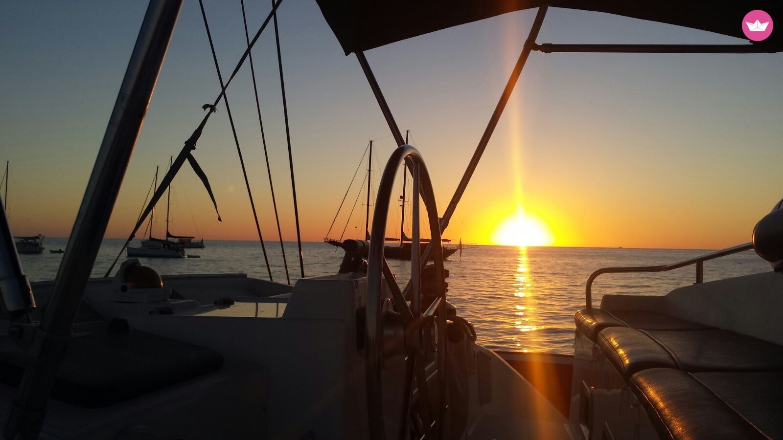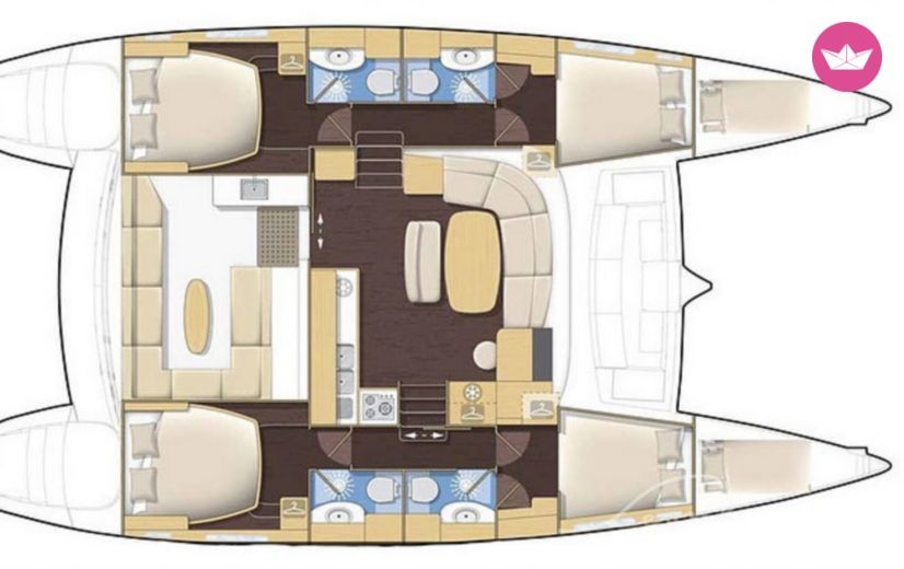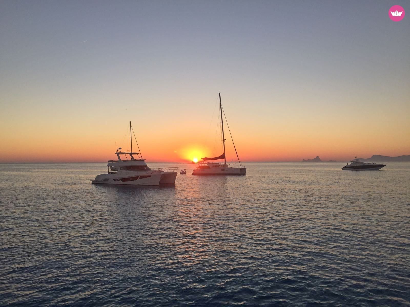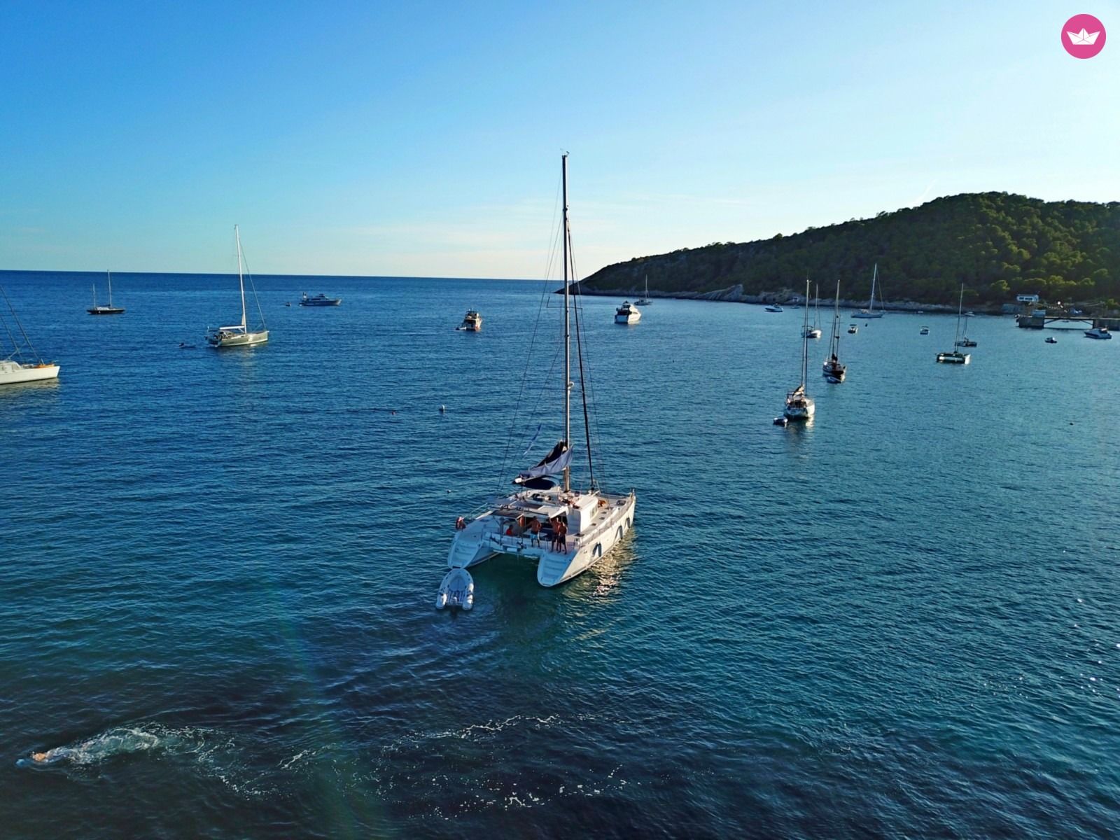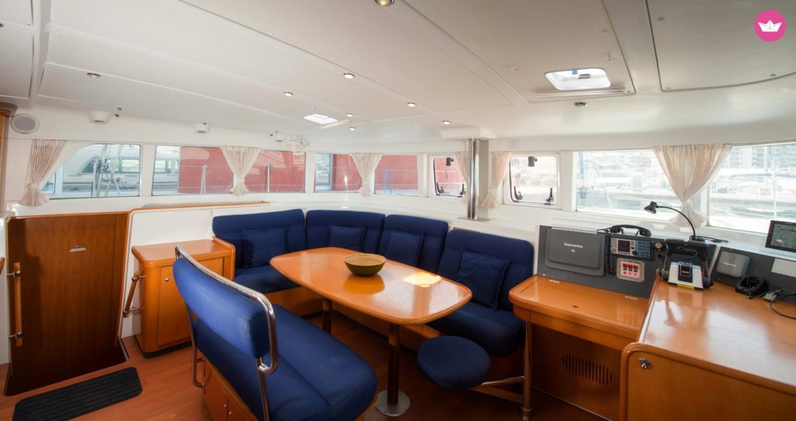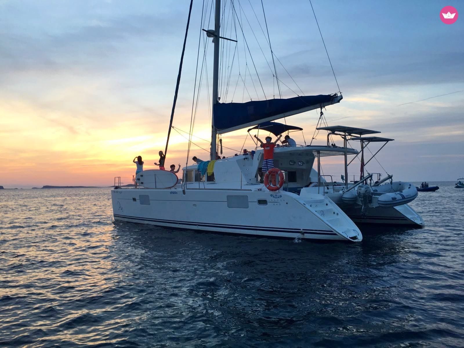 Description of Alejandro's catamaran Pia is well sorted for short or long stays. With a major refit in 2017 the experience is that of a new Lagoon 440 catamaran, the most comfortable for crewed vacations. There is full kitchen equipment that ensures best cooking experience. Also 2 brand new fridges and 1 freezer ensures you preserve your meal in perfect conditions in balearic summer. Comfort comes in the form of new exterior cushions, as well as comfortable bow net (can lie directly on it without marking yourself). Hot fresh water stern shower ensures you wipe off your salt after swimming. For entertainment you will enjoy floating cushions, as well as stand up paddle board, snorkeling equipment including finns, hammock. The underwater lights will help you enjoy the wandering fish at night. External amplified HiFi system which reads USB, Aux, or CDs make the most of the trip. Also there is a TV with chromecast to watch movies if needed before night rest. 900 litres of water are usually enough for a weeks' stay, but there is a watermaker that can help in case of shortage. 220V inverter will be usefull to charge cameras or other equipment, but also USB charging dock is available. There are 3 solar panels that will help reduce engine hours destined to replenish batteries (and avoid overheating the planet). The dinghy is a 1 year old Highfield ultralight 3,1m long, powered with a 10HP Honda engine. Scuba diving equipment can be rented also at an extra cost