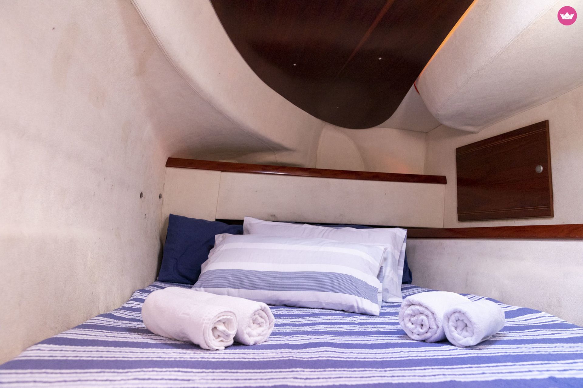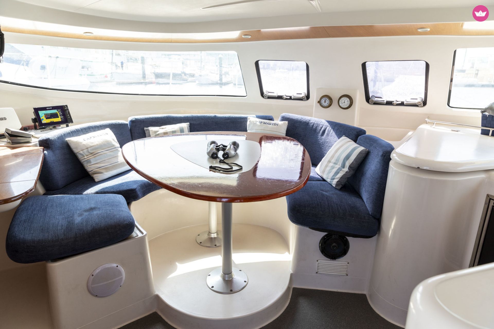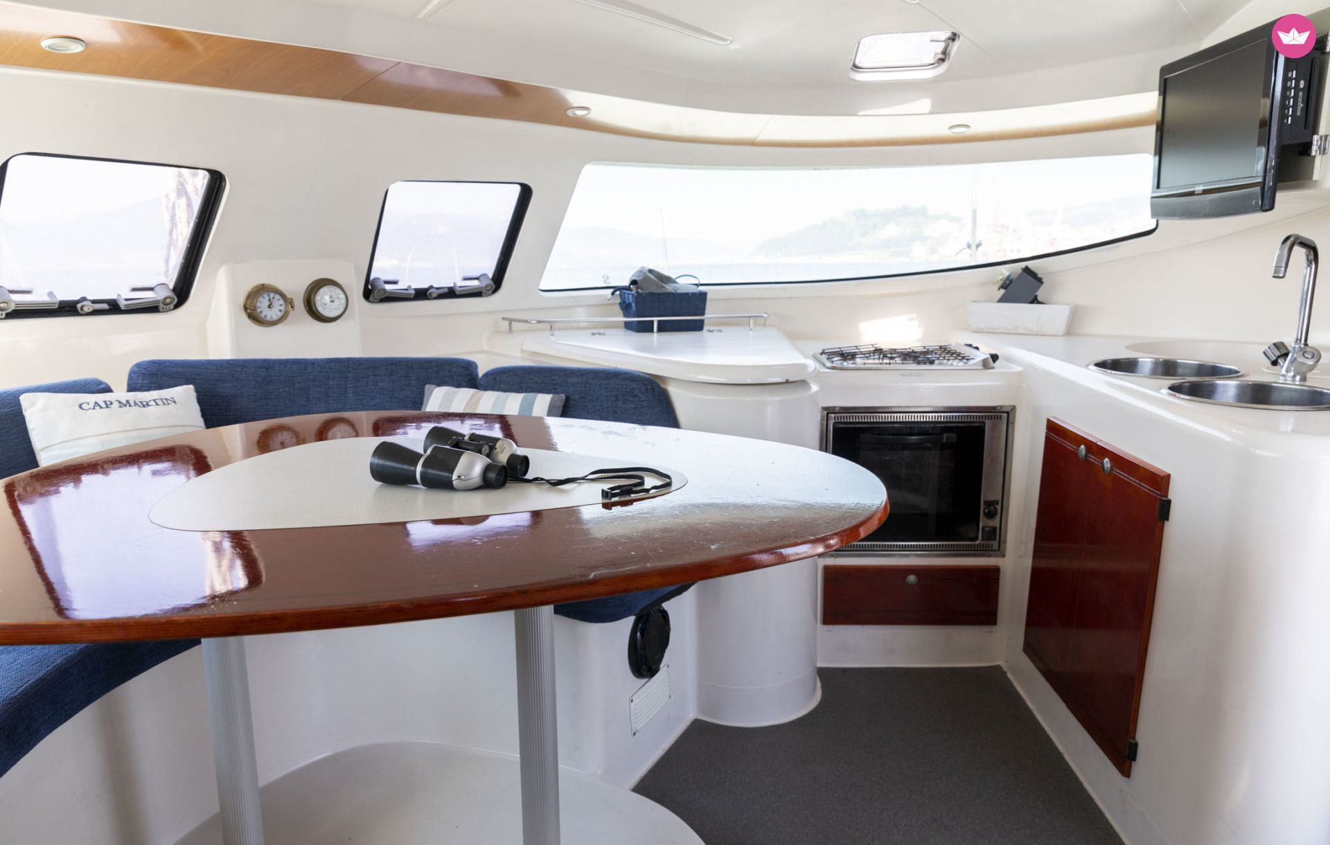 Description of Fernanda's catamaran MAKE YOURSELF AT HOME The catamaran Athena 38 is the best choice to enjoy a unique holidays in an intimate and family atmosphere. It has got 4 fully equipped cabins and 2 bathrooms, as well as two independent berths for the crew. Its inside cabin is spacious and comfortable, it has got a fully equipped kitchen with gas oven, as well as crockery and everything you need to enjoy lunch or dinner time as you want. The deck has got seats and a table in a bathtub, a solarium, bathing ladder and an outside shower in poop. In addition, it is completed with a pneumatic dinghy and multiple state-of-the-art electronic controls so safety is your travelling companion.
