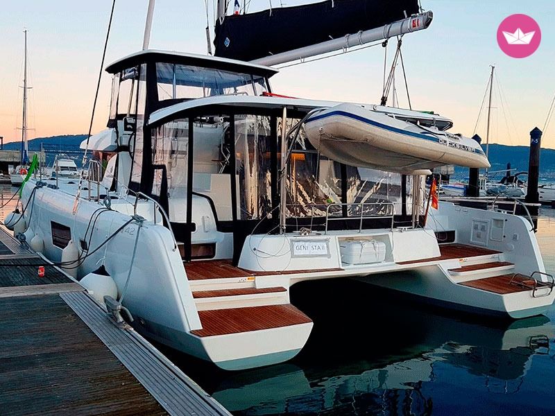 Description of Beatríz's catamaran , Hola! Están listos para experimentar una experiencia náutica diferente? Les presento el Catamarán que está preparado al más alto nivel para un total confort a bordo para 8 personas con un equipamiento en el interior de cuatro camarotes dobles con baño privado muy bien equipado y completo,conjunto de cama principal y una transformable completos completos de algodón importado desde Egipto, baños eléctricos. La distribución de los baños esta muy bien pensada para ocupar un espacio perfecto y no terminar siendo incómodos con enseres y textiles. Cabina y baño de patrón, con entrada independiente al resto de camarotes, ventiladores en todos los camarotes. Las costas en Denia son para aprovecharlas al máximo y nosotros queremos acercarte a poder recorrerlas rodeado de tus acompañantes, se puede adaptar a un viaje familiar, entre compañeros, etc. Catamaran Yacht Charter nos da la facilidad de hacer una reserva de una manera segura y muy fácil. Alquila ya a través de la plataforma. Te queremos a bordo capitán! EL PRECIO INCLUYE: - IVA - Seguros - Sábanas - Neumática con fuera borda - Amarre y suministros el en puerto base. EXTRA OBLIGATORIO: Limpieza final + neumática y fueraborda + pack confort: 350 €