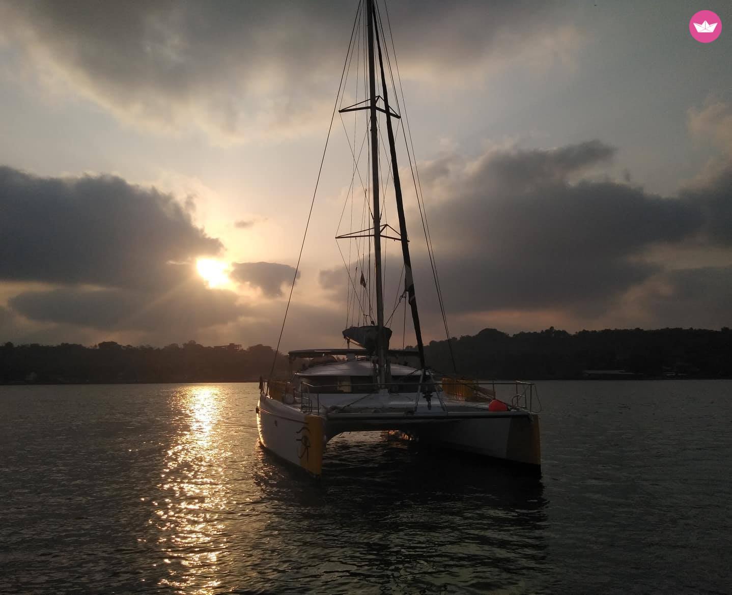 Description of Ingo's catamaran , Piratenhöhlen und Gefängnisinseln erforschen, gefährliche Haie und grasende Seekühe beobachten, untertauchen und klettern, aktiv oder gemütlich den Tag verbringen. Mit dem Katamaran durch die östliche Andamanensee zwischen Krabi und Langkawi. Ankern in einsamen Buchten, grillen am Strand oder thailändisch kochen auf der Fountaine Pajot Lavezzi 40. War da nichts für Dich dabei? Dann melde Dich gerne bei uns und sage was Dir fehlt. Wir sind Maya und Ingo (Mango Team). Wir haben den Katamaran aus der Türkei nach Thailand gebracht und wollen uns hier niederlassen. Profis sind wir nicht, aber immer offen für Kontakte, Ideen und Erfahrungen. Erfahrene Segler sind also herzlich willkommen, aber auch neugierige Nicht-Segler, die Gitarre spielen können oder offen für andere Kulturen sind. Platz haben nach Absprache wir für bis zu 6 Mitsegler. Wir starten unsere Touren jeden Dienstag und sind 6 Tage unterwegs. Pro Tag berechnen wir ab 79,-€ pro Person. Wir geben 5% Rabatt auf Frühbucher (90 Tage im Voraus), Studenten, Honeymoon und Jubilare. Wir sind selbstverständlich wetterabhängig. Sollten die Bedingungen gegen das Ablegen sprechen, so gibt es eine komplette Kostenrückerstattung. In dem Preis enthalten sind Kost und Logis an Bord, Eintrittsgebühren in die Nationalparks, Benutzung von sämtlichen Equipment. Es kommen keine versteckten Kosten auf Euch zu. Darüber hinaus ist für uns an der Waterkant nicht Schluss. Wir helfen und unterstützen gerne auf der Suche nach Shuttle, Boot-Shuttle, Flüge, Anmietung von Roller/Auto, Unterkünfte, Tipps für Reiseziele an und im Land usw. usw. - all inclusive. Wir freuen uns auf Eure Nachrichten – bis bald Maya & Ingo