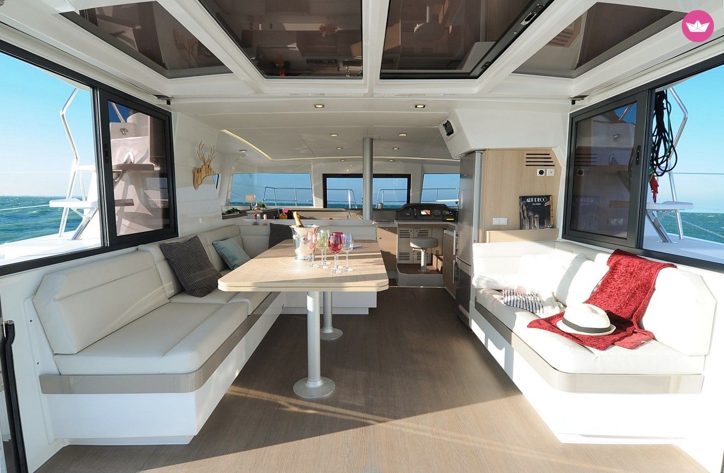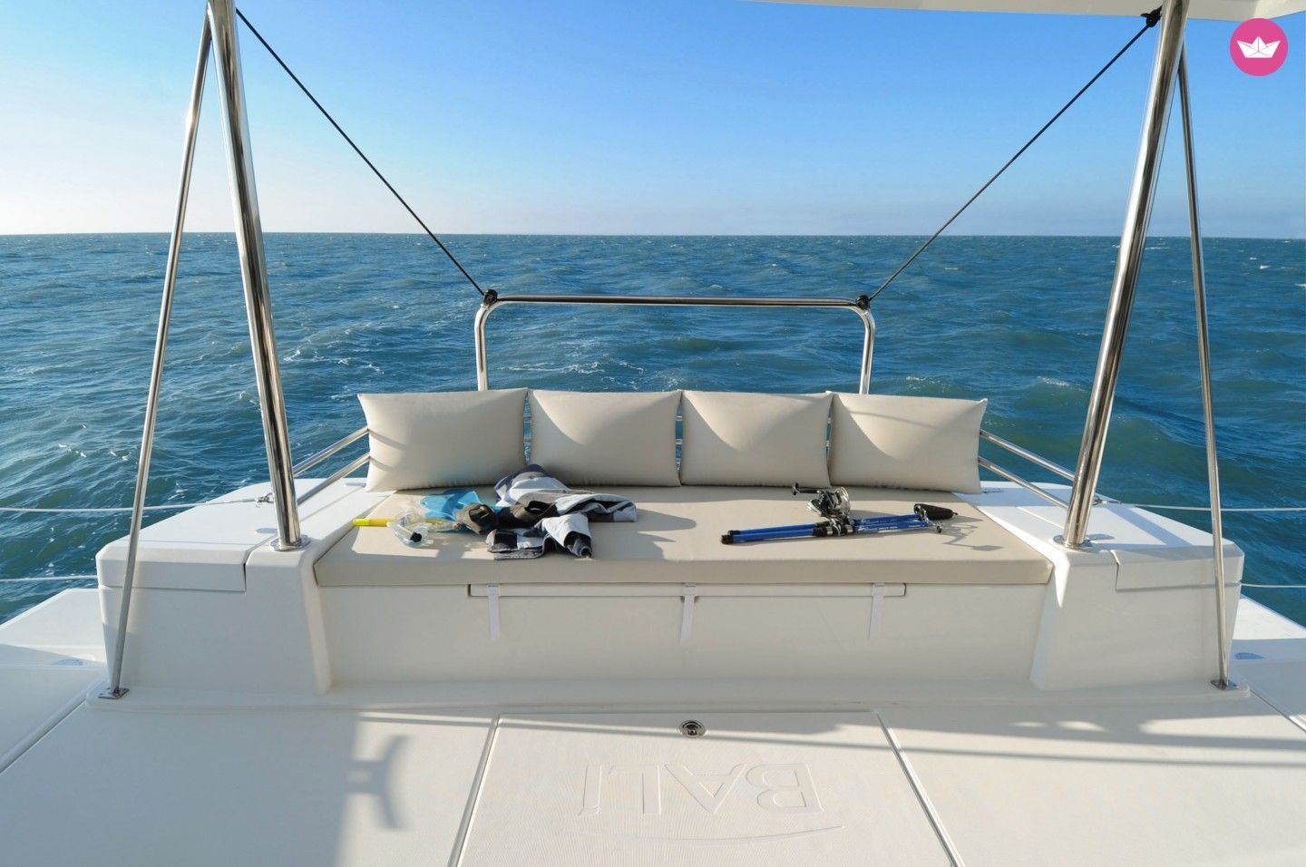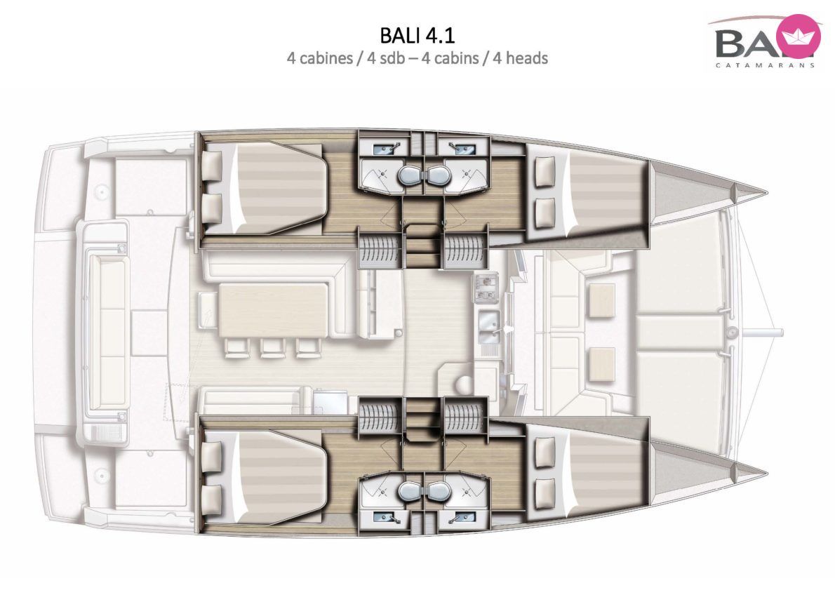 Description of Fabrizio's catamaran , Noleggio questo meraviglioso catamarano varato solamente nel 2019 per trascorrere rilassanti giornate in compagnia della famiglia o degli amici. Questo Bali 4.1 dispone di quattro comode cabine doppie con letto matrimoniale e di quattro bagni con doccia. La dinette é grande e spaziosa ed é fornita di un comodo tavolo con divano trasformabili in letto matrimoniale e che quindi possono ospitare ulteriori due ospiti per il pernottamento. All' esterno il catamarano dispone di un comodo prendisole di prua oltre ad un divano con cuscini sempre a prua. A poppa invece troverete un secondo comodo divano con cuscini. Extra obbligatori: Pulizia finale/acqua/1 bombola di gas/batterie/lenzuola e asciugamani per ogni membro dell’equipaggio 4 cabine 190,00€ / 5 cabine 200,00€ Extra: Skipper 185,00 € al giorno + vitto Hostess 150,00 € al giorno + vitto Railing net 100,00 € a charter Spi 155,00 € a settimana Motore f/b 90,00 € a settimana 15,00€ per ogni set extra di biancheria Con questo catamarano potrete navigre lungo la meravigliosa costa di Amalfi o anche fare rotta per Capri e Ischia. Scrivetemi su Catamaran Yacht Charter per avere maggiori informazioni!