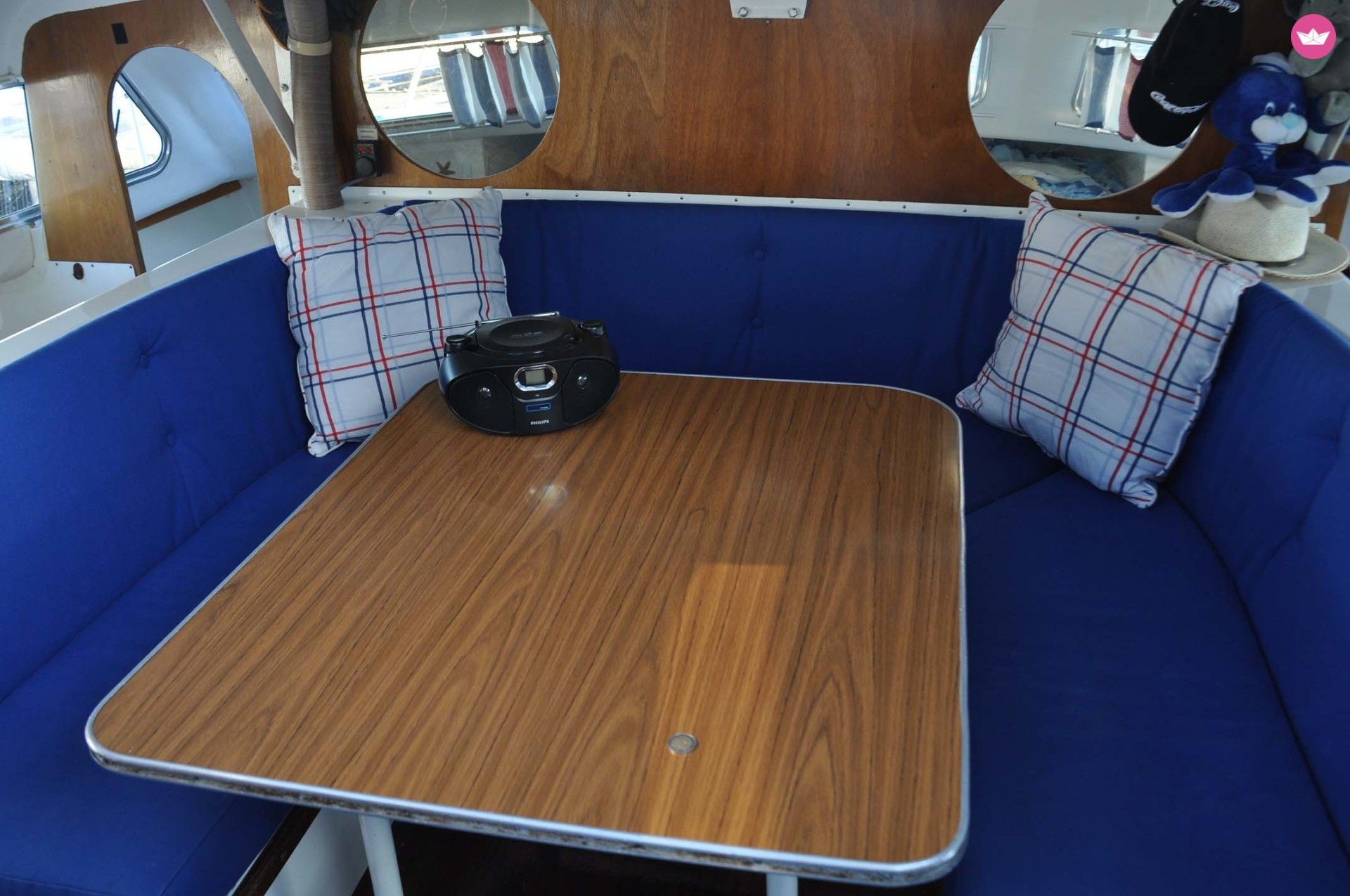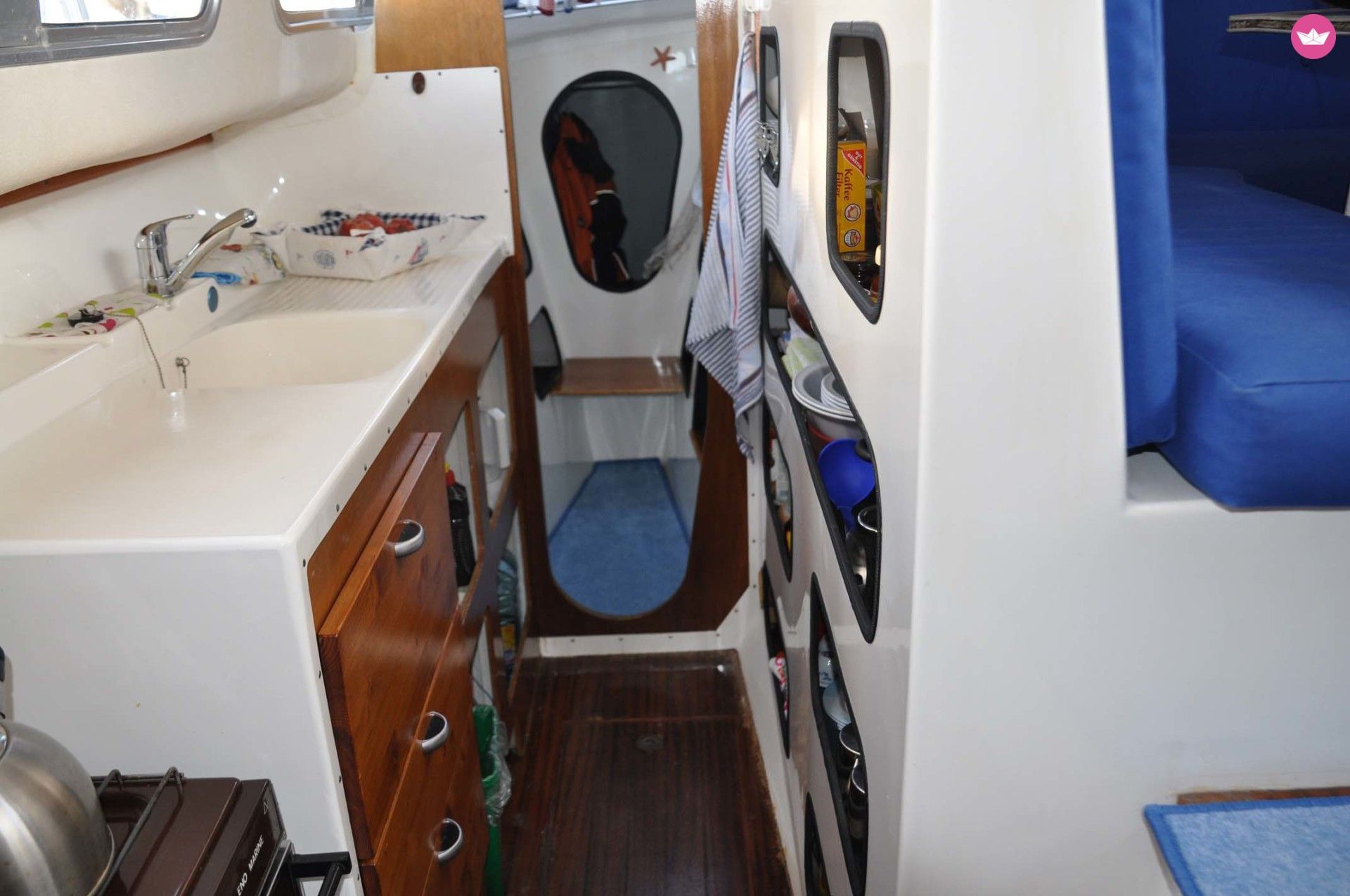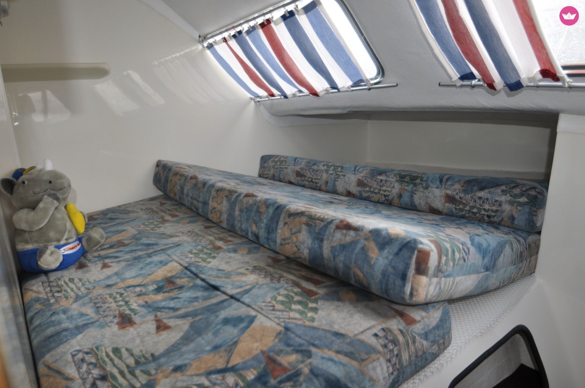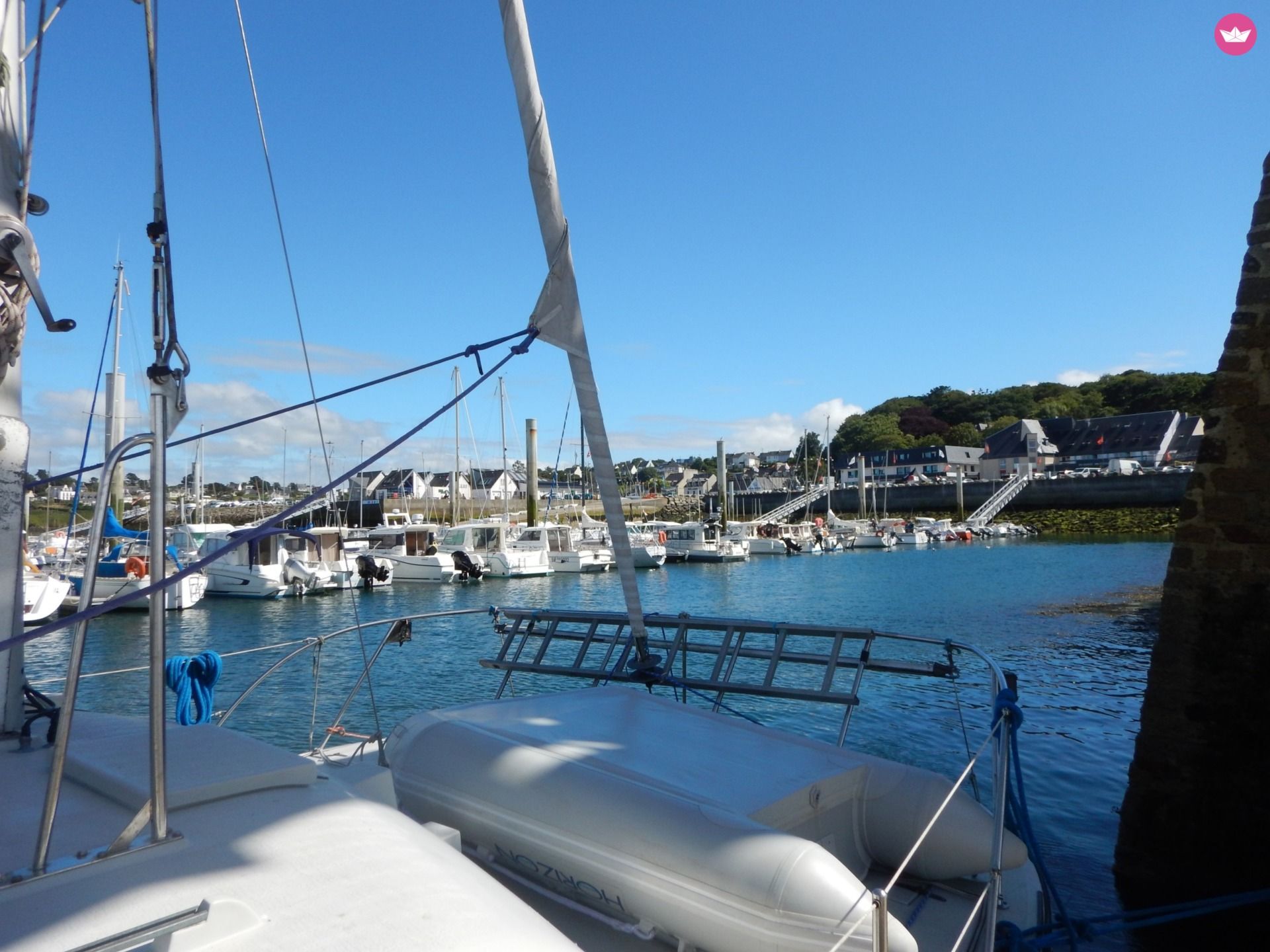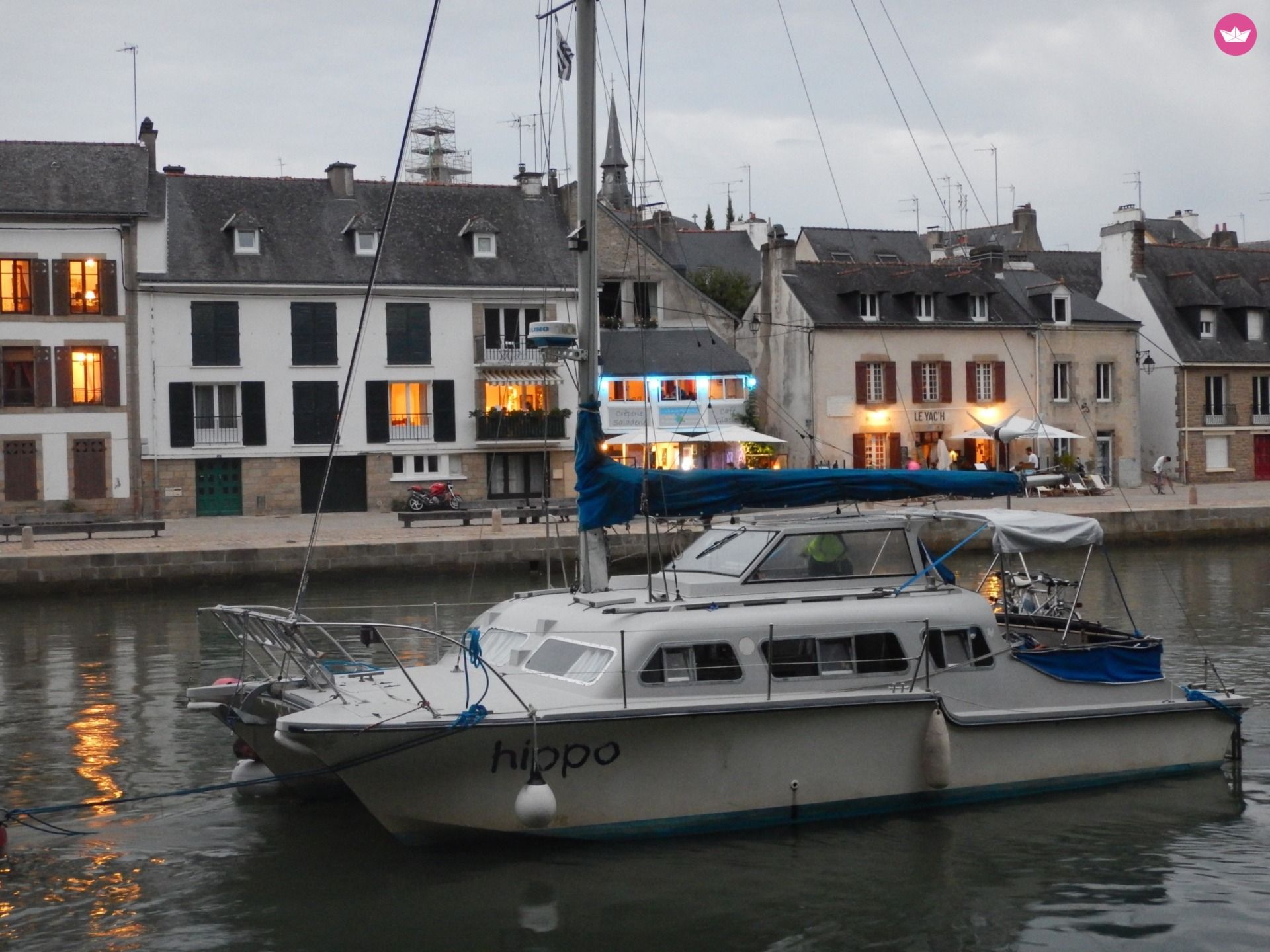 Description of Ilya's catamaran I bought this catamaran in 2013 and we use it for family cruising every Summer. Cumulatively 1609 NM - long trip from Kröslin (Germany) to Auray (France) was performed during vacations in 2013-2018. The boat can be rented with or without a skipper. The price does not include a skipper. In the case you would like to hire me as a skipper, it will cost extra 50 Euro/day. In 2019 I plan to stay aboard of "Hippo" to accompany you as a skipper from June to end of July (perhaps also in August). Other time the boat can be rented without skipper Catalac 9m "Hippo" is a safe cruiser boat proven by time. The model was designed by John Winterbotham of MG Duff LTD in 1968 and has a similar reputation among multihull cruisers as VW Bus among the fans of camper cars. It is not designed to reach speed records but it is very strong, seaworthy and comfortable boat perfect for family cruise. It is very safe model of catamaran. Accordingly to information from the Internet, no cases of capsize were recorded for Catalac catamarans, most likely due to the lacking of the keels. Deep "V" shape of the hulls plays a role of the keel and prevents leeway, but lets the boat to "slide" before it will capsize. "Hippo" is equipped with Main sail, Genoa 2 on furling (can be replaced with Genoa 1 on request) and Gennaker. "Hippo" has a close steering cabin, 6 berths in 3 sleeping areas and saloon which can be transferred into "king-syze" bed. It can comfortably accommodate a family with two kids (in saloon) + family couple (in double cabin) + one person (in single cabin). One extra berth is also available mid starboard hull, but it is not very comfortable and usually is occupied by suitcases, bags etc. There are many lockers inside the cabin and in cockpit with plenty of space. Catalac 9m has large (about 2x4m) cockpit and Bow sundeck (with no trampolines). Cockpit is equipped with bimini top and plastic cockpit enclosure (for anchorage at rainy day). Inflatable boat with 2,5 outboard motor is included into the price. There is an equipment for snorkeling for 4 persons and 2 sets of neoprene suits (7+5mm) of L and XL size. I have also 2 sets of diving gear and diving compressor on "Hippo". However, if you want to go for diving we should discuss it separately. Two sets of fishing gear are also available. 2 bicycles are available for those who like to explore the land around (no extra payment). "Hippo" can be even used as "floating hotel" to spend some time in this beautiful and rich with culture area of France. Bed linens + towels are available for 10 € per person. Final cleaning 50 €. Boat is located in Auray at Gulf of Morbihan in Southern Brittany (France). The Gulf of Morbihan has been described as one of the most beautiful bays in the world. The are other true "gems" of nature located around, like: Belle Île, Île-d'Houat, Glénan Islands. From Auray it is possible to perform a 3 days-long "One Hop" to cross the Biscay and reach the Spanish coast. If you are interested in renting this Hippo, please contact me via Catamaran Yacht Charter messaging. See you soon!