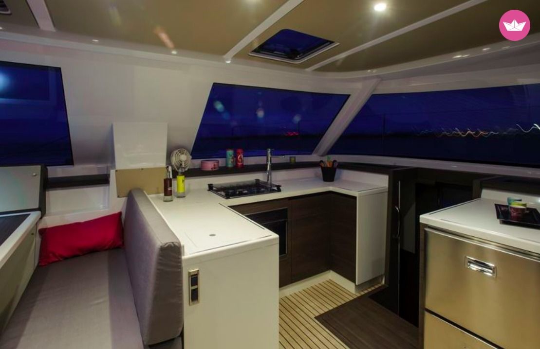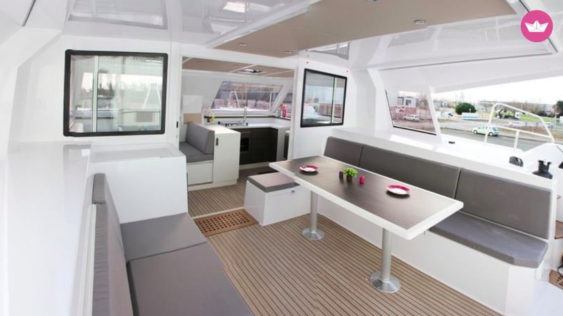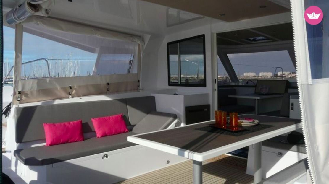 Description of Alex's catamaran , Bonjour, Nautitech 40 Open, grand catamaran, disponible à la location au départ de Saint-Mandrier-Sur-Mer. Embarquez jusqu'à 12 personnes en navigation pour un séjour mémorable, en famille ou entre amis. A bord, on retrouve évidemment tous les équipements de navigation (GPS, sondeur, VHF, guindeau électrique...) ainsi qu'une annexe avec moteur. Côté confort, c'est un modèle 6 cabines : 4 doubles et 2 simples. Vous pourrez donc séjourner à 10 dans un grand confort. On retrouve bien évidemment un grand salon et une cuisine tout équipée. Au départ de Port Pin Rolland, vous pourrez profiter pour une semaine ou plus des joies de la navigation en Méditerranée. N'hésitez pas à nous joindre sur la messagerie Catamaran Yacht Charter, nous serons ravi de vous y répondre. A bientôt ! **********************TARIFS********************* Options Obligatoires : - Nettoyage : 250€ - Frais de dossier : 20€ - Starter pack : 25€ Extras : - Filet de protection pour enfants : 230€ - Rachat de franchise : 40€/jour - Hôtesse/cuisinier : 200€/jour - Skipper : 230€/jour - Stand up paddle : 25€/jour - Wifi : 50€/semaine - Transferts : sur demande *************************************************