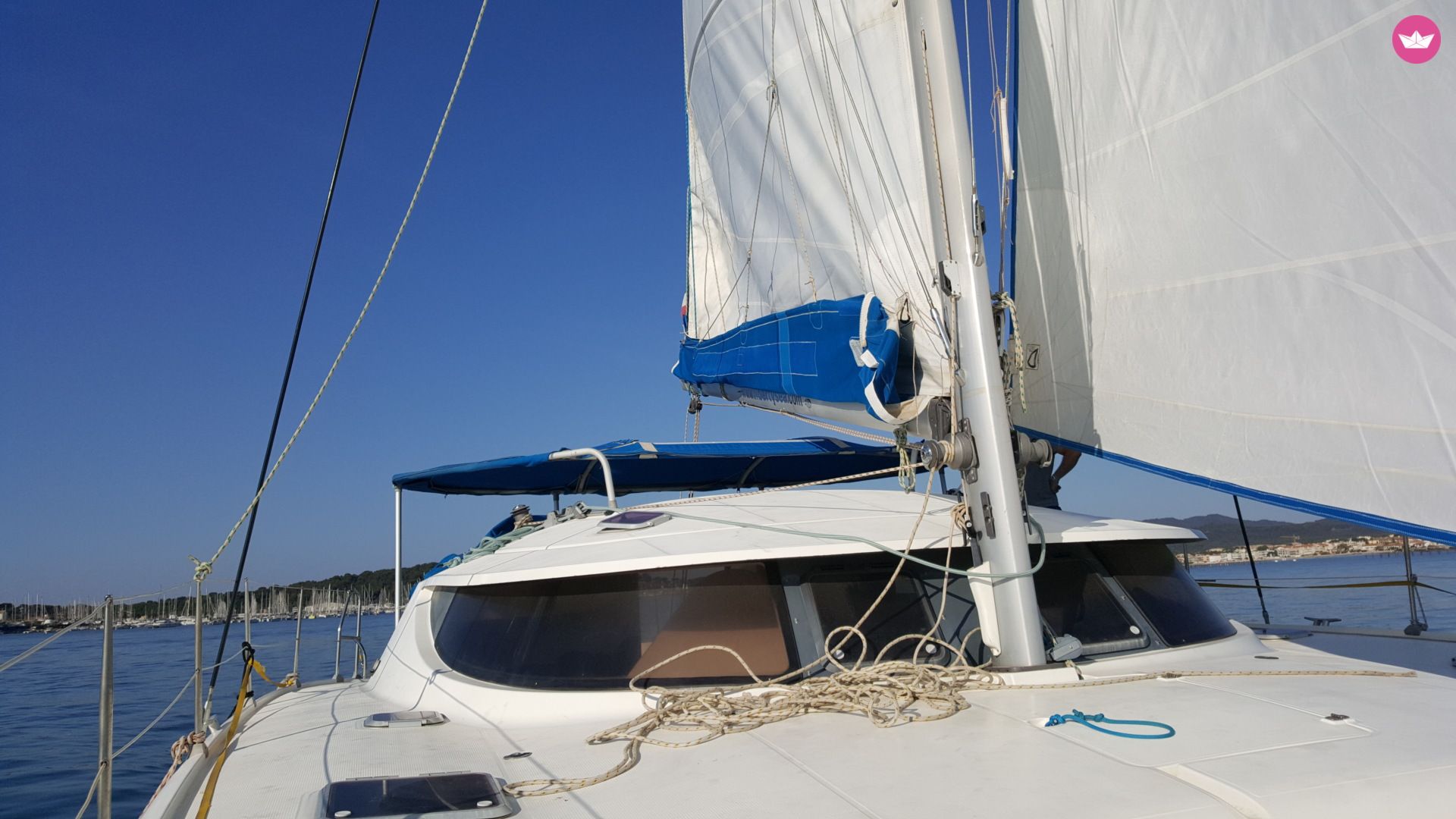 Description of Bruno's catamaran , Catamaran Equipement hauturier 4 cabines doubles 2 SdB Eau chaude et froide sous pression Bateau confortable et marin, facile dans les manœuvres Electronique (VHF, VHF portable, convertisseur, traceur carte électronique, pilote automatique,...) Bateau de propriétaire entretenu... Equipé réservoir eaux noires Réserves eau douce 380 litres Gasoil : 180 litres Annexe 3.20 HB Yamaha 4cv Frigo, Gaz 3 feux, Four,...