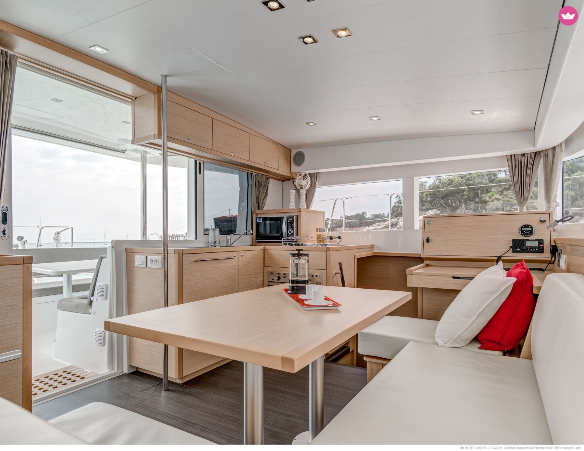 Description of CORINNE's catamaran , Bonjour, Je vous propose de louer ce superbe catamaran à moteur Lagoon MY 40 avec skipper au départ de toute la côte d'Azur et la Corse. Ce catamaran moteur de type Trawler, est idéal pour un séjour ou une sortie à la journée en famille ou entre amis. Il possède tous les avantages d'un catamaran voile, et tout le confort d'un yacht à moteur, sans le bruit et le coût du carburant. Ses espaces de vies volumineux et lumineux sont idéaux pour une croisière de rêve dans un confort maximal. à bord, vous trouverez 4 cabines avec salles de bain, wc et 2 cabines équipage. **** Option obligatoire **** - Skipper : 200€/jour **** Options facultatives **** - Hôtesse : 200€/jour - Linge de bain, de toilettes, de lit : 45€/cabine Le carburant est facturé 30€/heure, mais un forfait peut vous être proposé en fonction de l'itinéraire prévu. Un paddle est à votre disposition sur le bateau. N'hésitez pas à le contacter via la messagerie Catamaran Yacht Charter pour de plus amples informations. À bientôt !