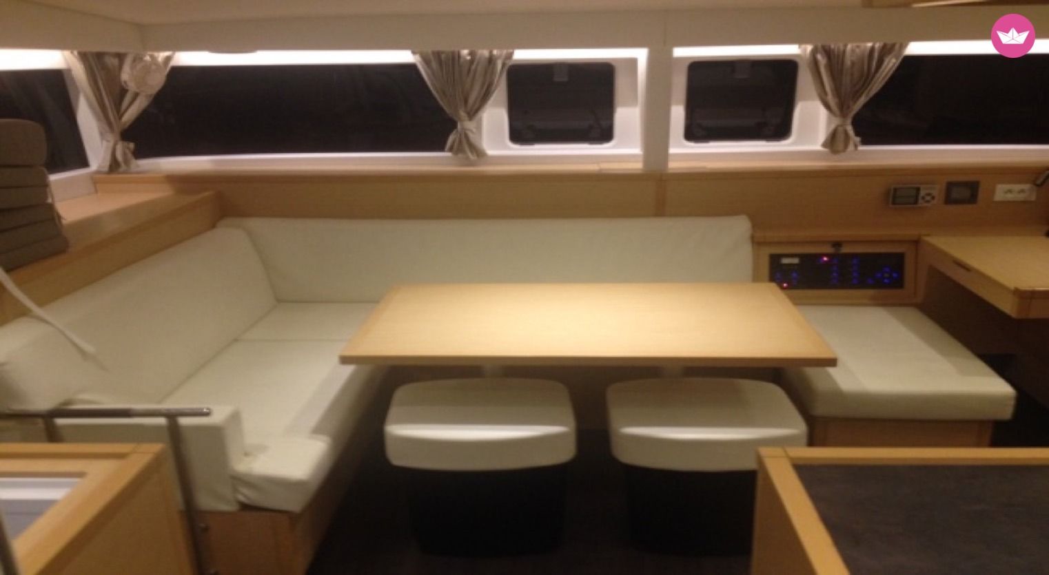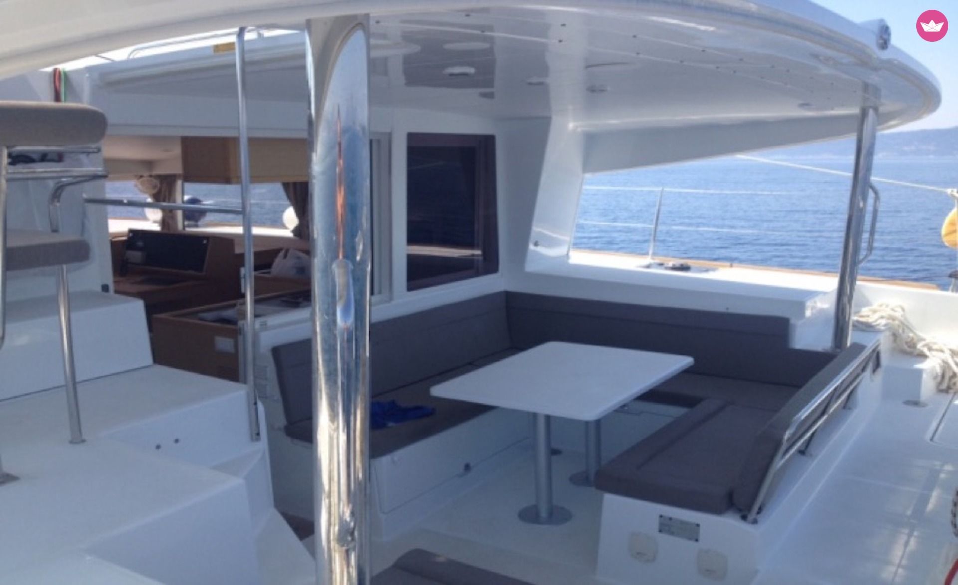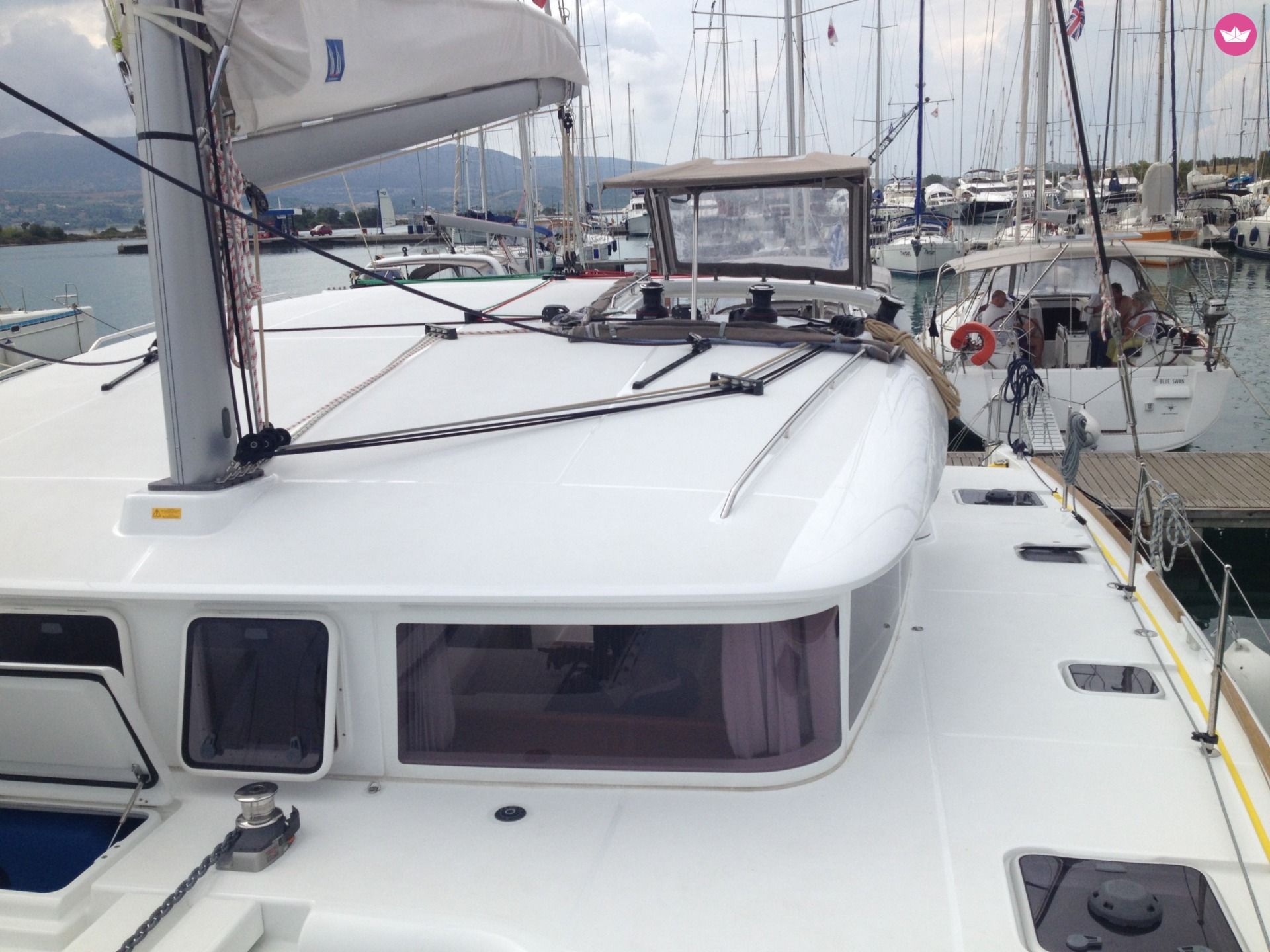 Description of Thanos's catamaran To rent a catamaran is a perfect option for a comfortable, spacious and organized boat. Designed from the manufacturer Lagoon, this catamaran is perfection in both construction and manufacture. Utopia, the Lagoon has a very cosy layout, with 4 double cabins and 4 bathroom. It can welcome up to 8 persons in cabins and has new sails from 2015. The exterior is solid and wide; with new design of flat windows that provide a comfortable sun deck, and cosy trampoline. You will love to start your cruise in Rhodes, perfect to discover the Dodecaneses islands.