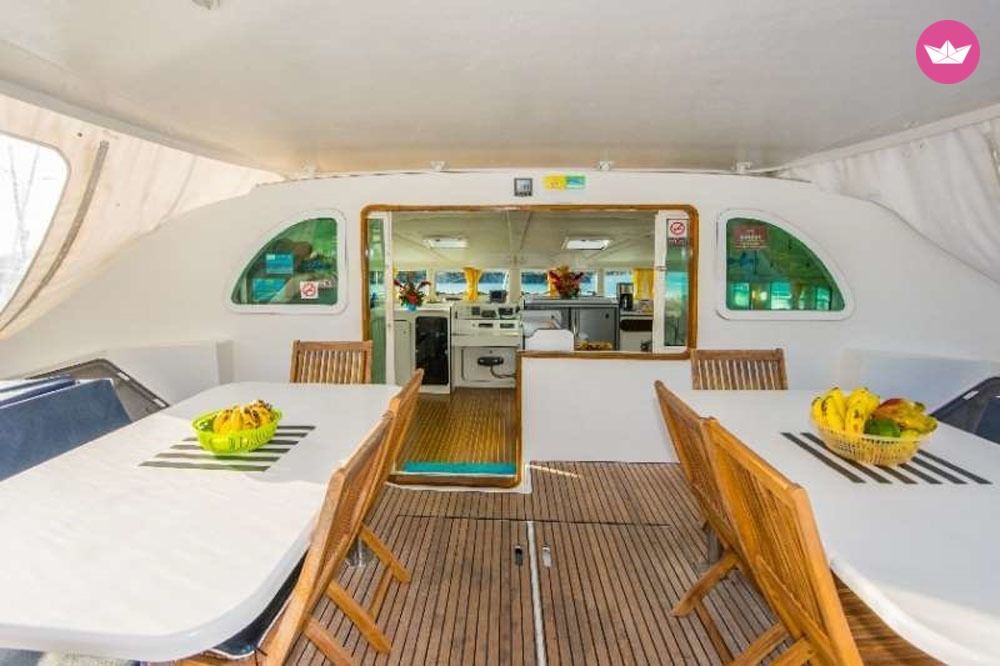 Description of Kenneth's catamaran This Catamaran was designed for world cruising. It is powerful, fast and easily manageable. It takes up to 20 guests on board and is available for daily charters. The Lagoon 570 is completely equipped and has 2 bathrooms.
