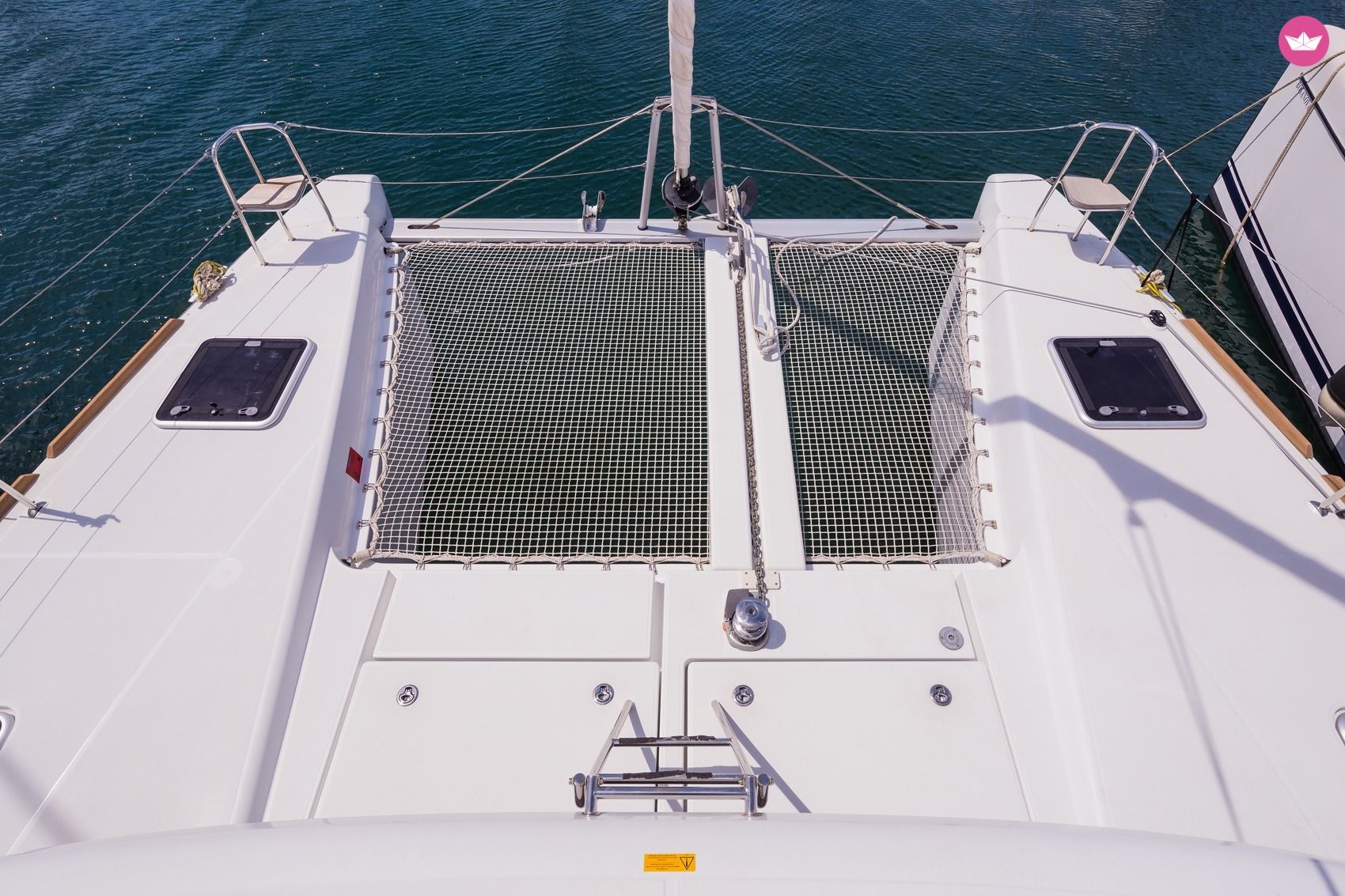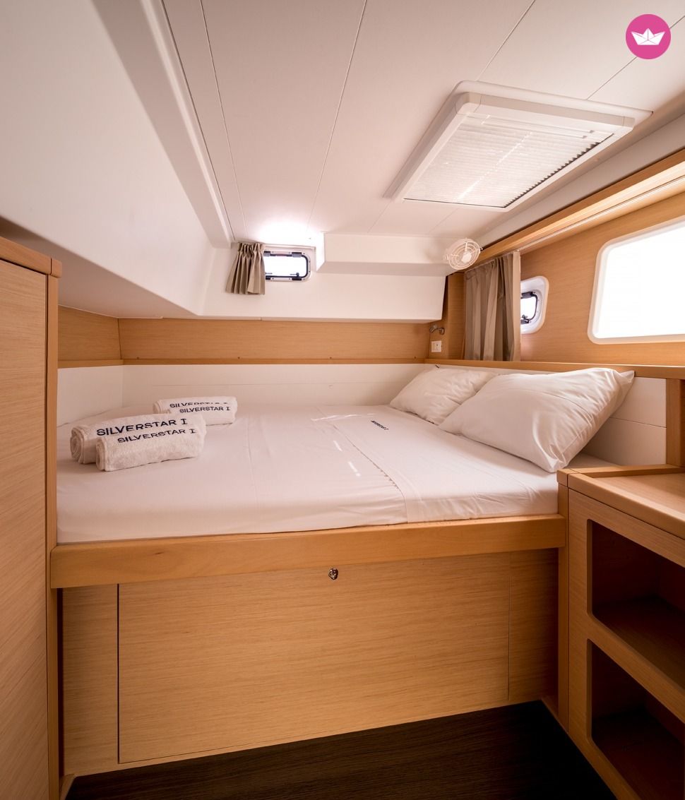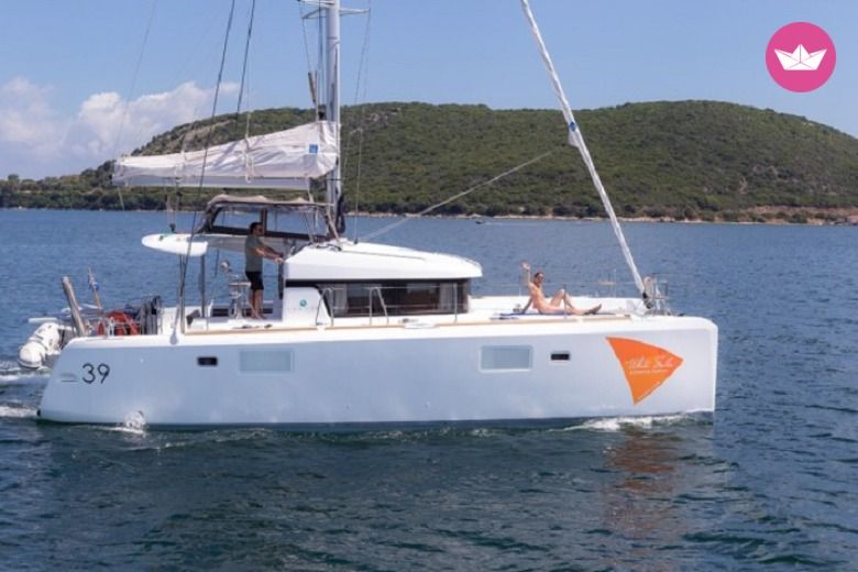 Description of Marilena's catamaran Discover the Greek islands aboard catamaran sailing boat "Silverstar I" and live you ideal sailing vacations. A 11,5-meter luxury catamaran, built by Lagoon, she can accommodate up to 10 guests in 4 en suite cabins. This catamaran lagoon has a large forward triangle that allows a larger foresails choice: a promise for great performance. The shorter boom makes the mainsail much easier to maneuver. The cabins have incomparable natural lighting thanks to the fixed hull windows, together with excellent ventilation thanks to the deck hatches and portholes that open out to the hull-side. The saloon includes a large dining area forward to starboard, a chart table with a panel for navigation electronics and a small desk with a flap. Aft to port, the L shaped galley has direct access to the cockpit for a better usability and conviviality..