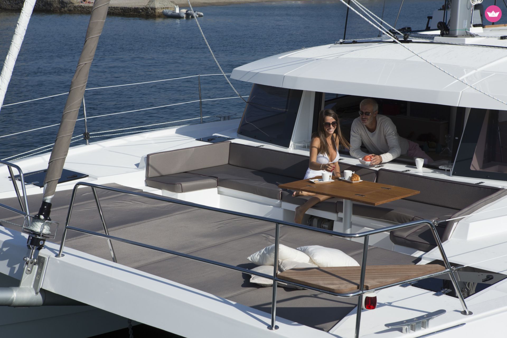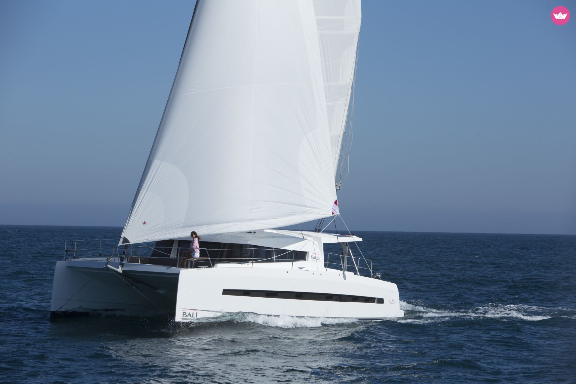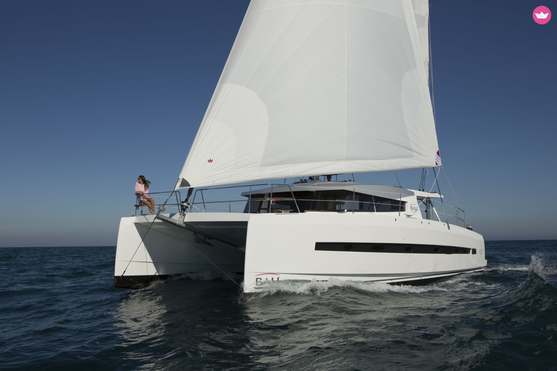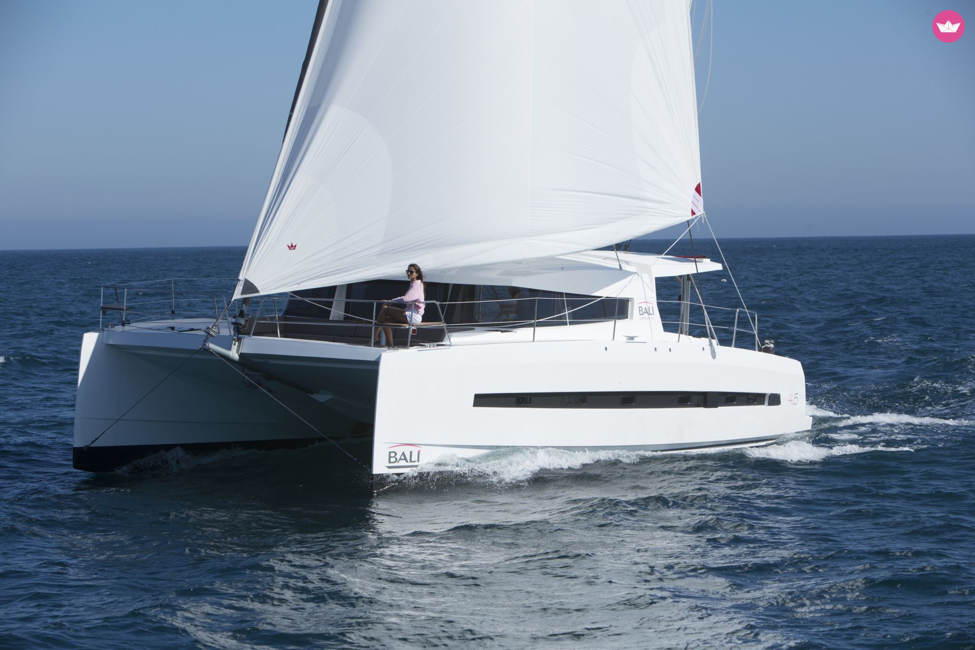 Description of Françoise's catamaran , Superbe catamaran tout neuf, nouvel model Bali 4.5 PREMIUM, version trés équipé de 3 cabines dont 1 suite et 2 couchettes individuelles ( dont 1 pour le skipper) . Confort à bord, comodité avec lave linge, lave vaisselle, dessalinisateur et générateur. Pas besoin d´aller dans les ports, autonomie totale. Ideal pour vos vacances et unique avec son solarium avant , ses bains de soleil ou sa zone lounge à l´avant où vous pourrez boire un verre ou manger grace à ses 2 tables. Location à la journée hors haute saison, ou location à la semaine au départ de Barcelone ou d´Ibiza pendant l´été.