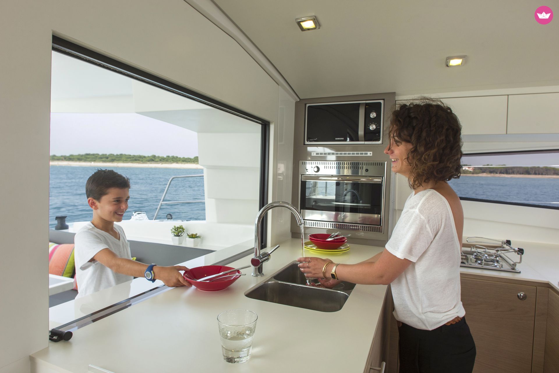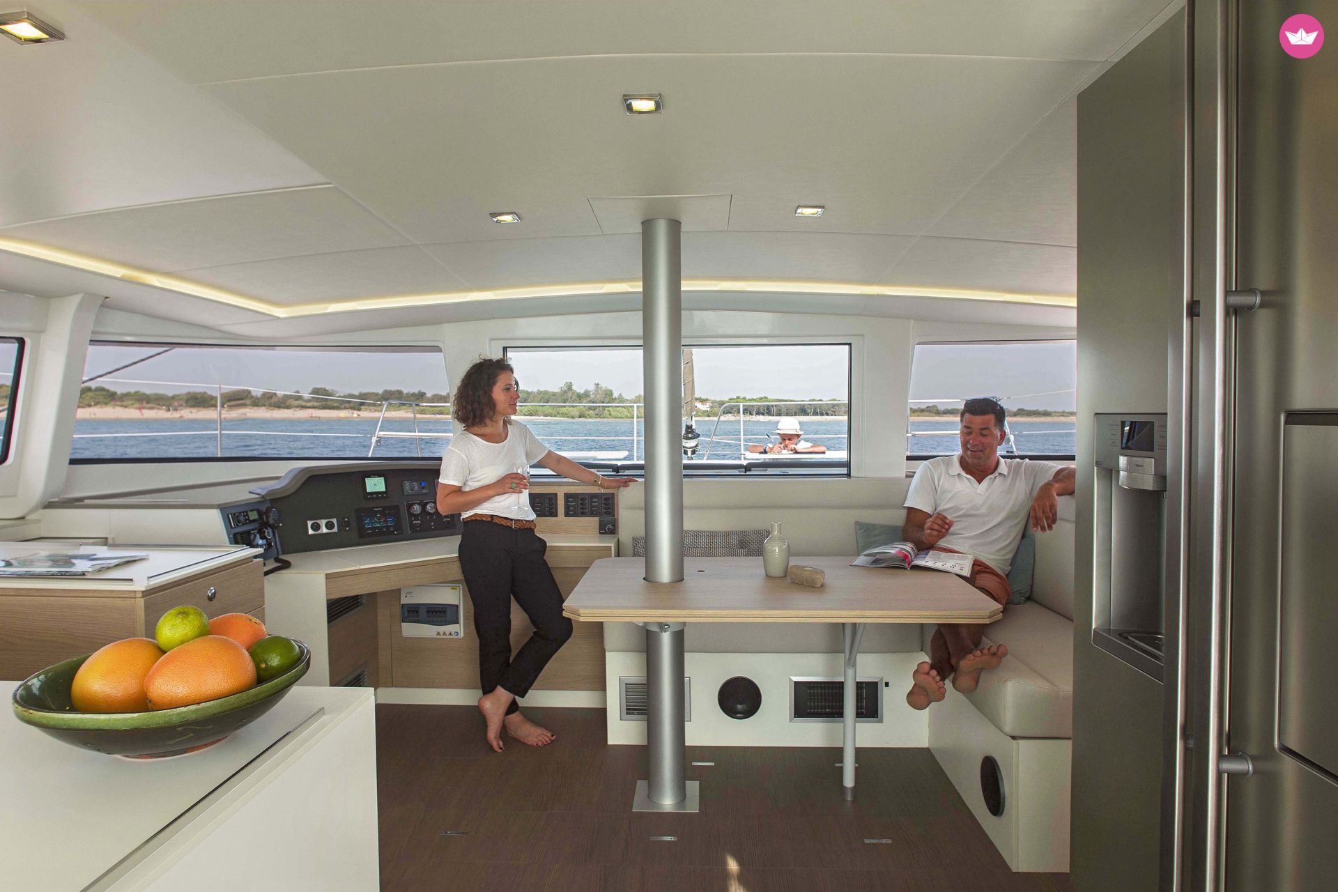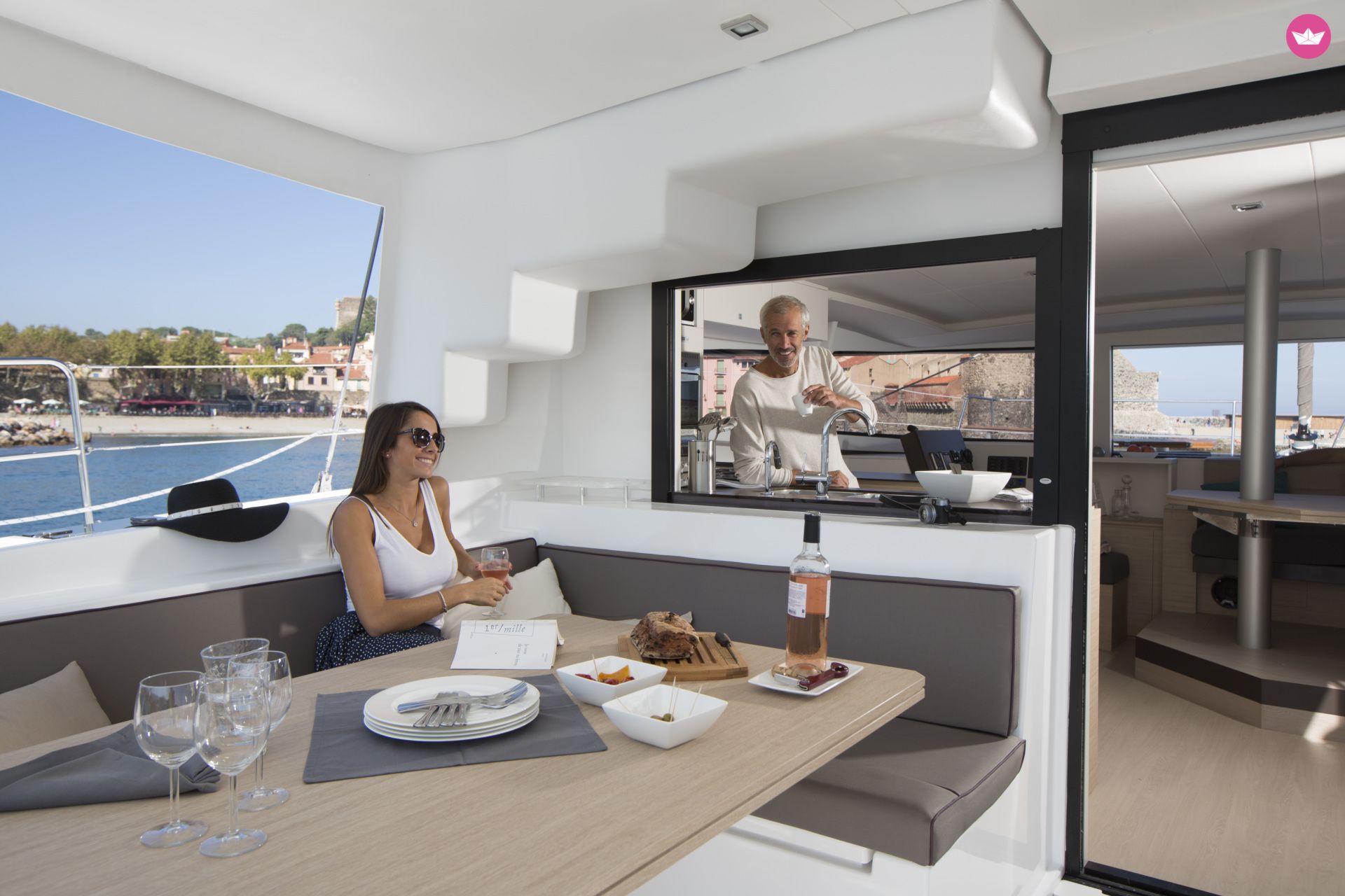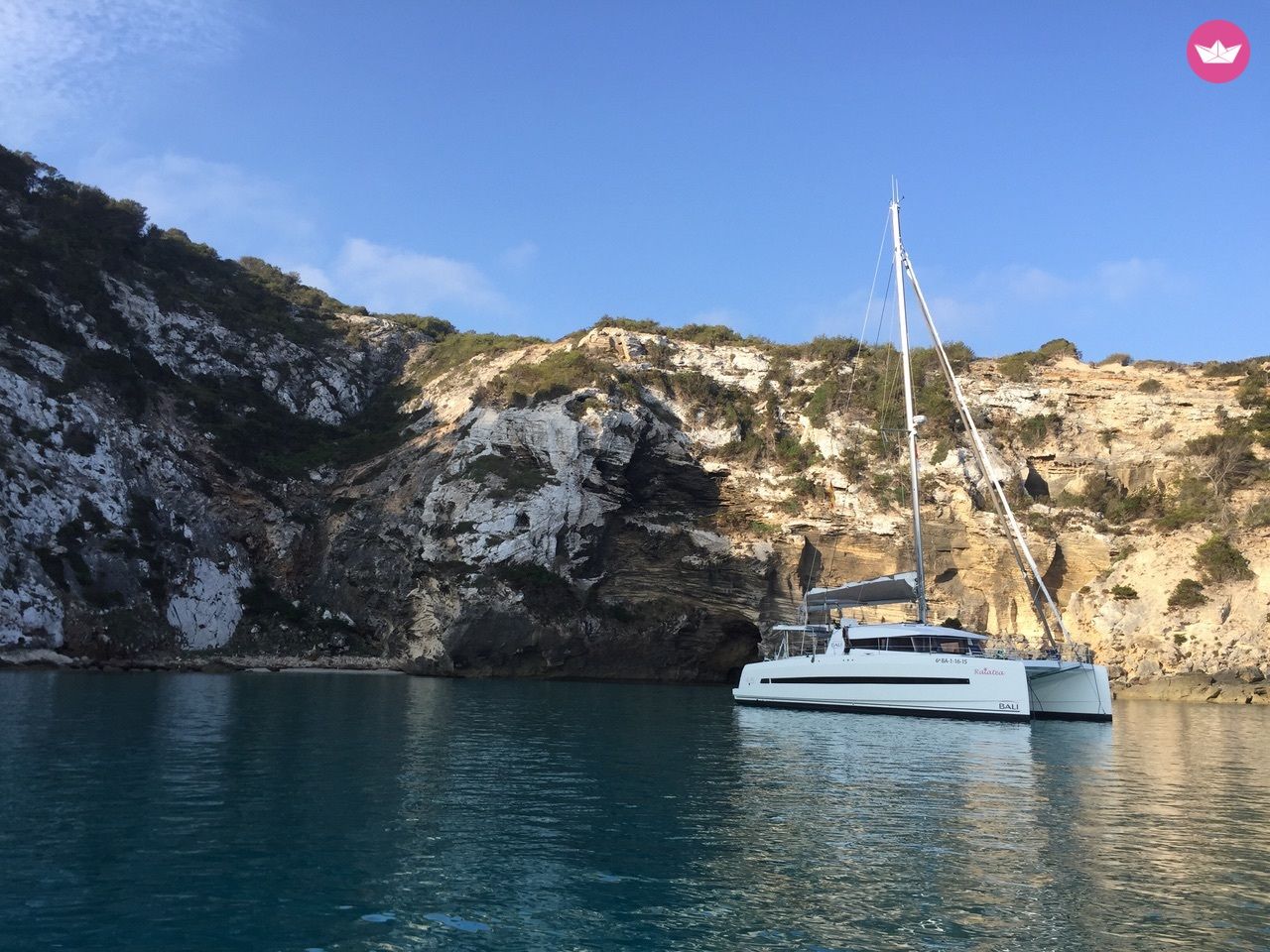 Description of Françoise's catamaran , Superbe catamaran tout neuf, nouvel model Bali 4.5 PREMIUM, version trés équipé de 3 cabines dont 1 suite et 2 couchettes individuelles ( dont 1 pour le skipper) . Confort à bord, comodité avec lave linge, lave vaisselle, dessalinisateur et générateur. Pas besoin d´aller dans les ports, autonomie totale. Ideal pour vos vacances et unique avec son solarium avant , ses bains de soleil ou sa zone lounge à l´avant où vous pourrez boire un verre ou manger grace à ses 2 tables. Location à la journée hors haute saison, ou location à la semaine au départ de Barcelone ou d´Ibiza pendant l´été.