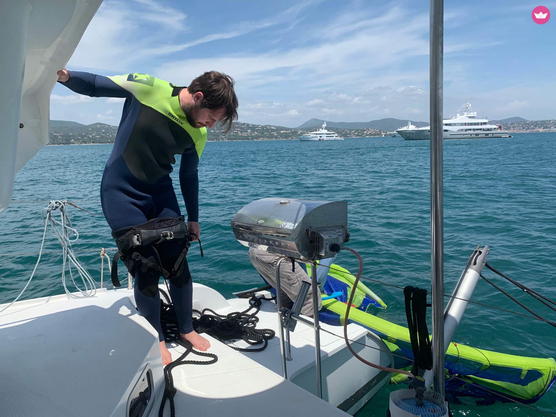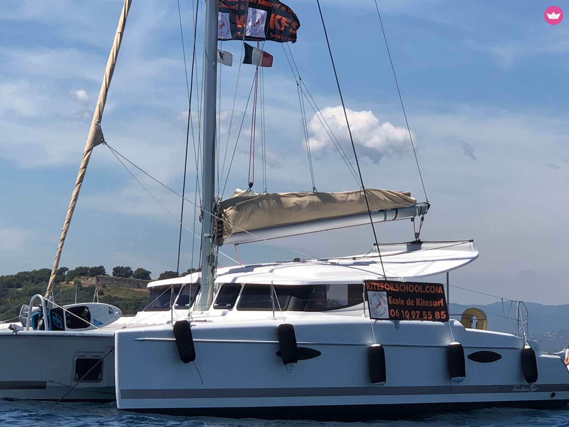 Description of SEB's catamaran Mahé 36 is a boat very pleasant to live in cruise or in the day. It is possible to be 14 persons on board for exits(releases) in the day. For the cruise weekly(to the week), the boat is ideal for 6 adults. (4 in cabins + 2 in the convertible square) 2 points before are convertible(flexible) for Teenagers. The boat is in a state close to the New. Include in the price(prize): a Semi-stiff of 5 meters equipped with an engine of 50 CV to make of Wake, 4 Paddles, 4 sticks for the big-game fishing and if you wish courts(courses,prices,yards) of Kitesurf (rent of the material(equipment) in more). Not inclusive: the box(cash register) of edge (gasoline(essence) wake, diesel oil, place(square) of port(bearing), restaurants, etc.) Failed cleaning 230 € compulsory for the rents week with night on board Price(Prize) off season day: 500 euros + skipper 300 € - Price(prize) a day in July and August: 900 euros + skipper 300 € - Price(prize) off season week: 3 600 € inclusive skipper - Price(prize) week July and August: 4500 € inclusive skipper. Rent minimum 3 Days in high season.