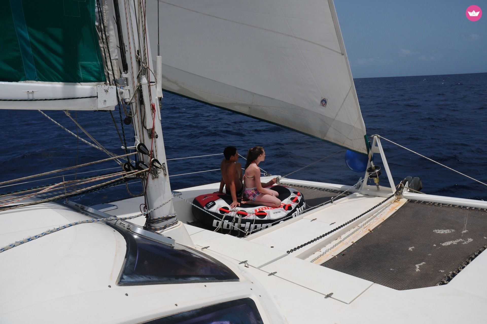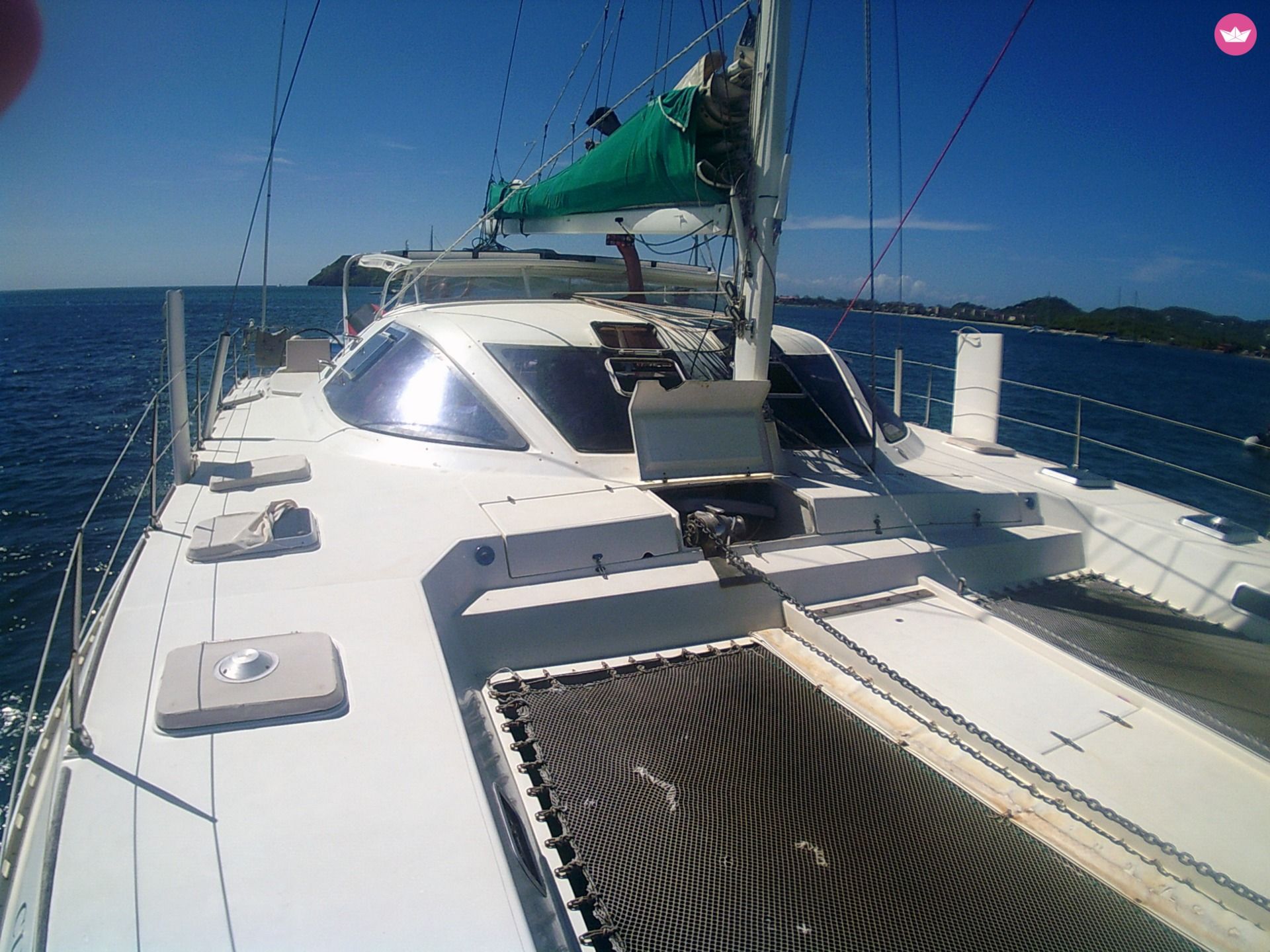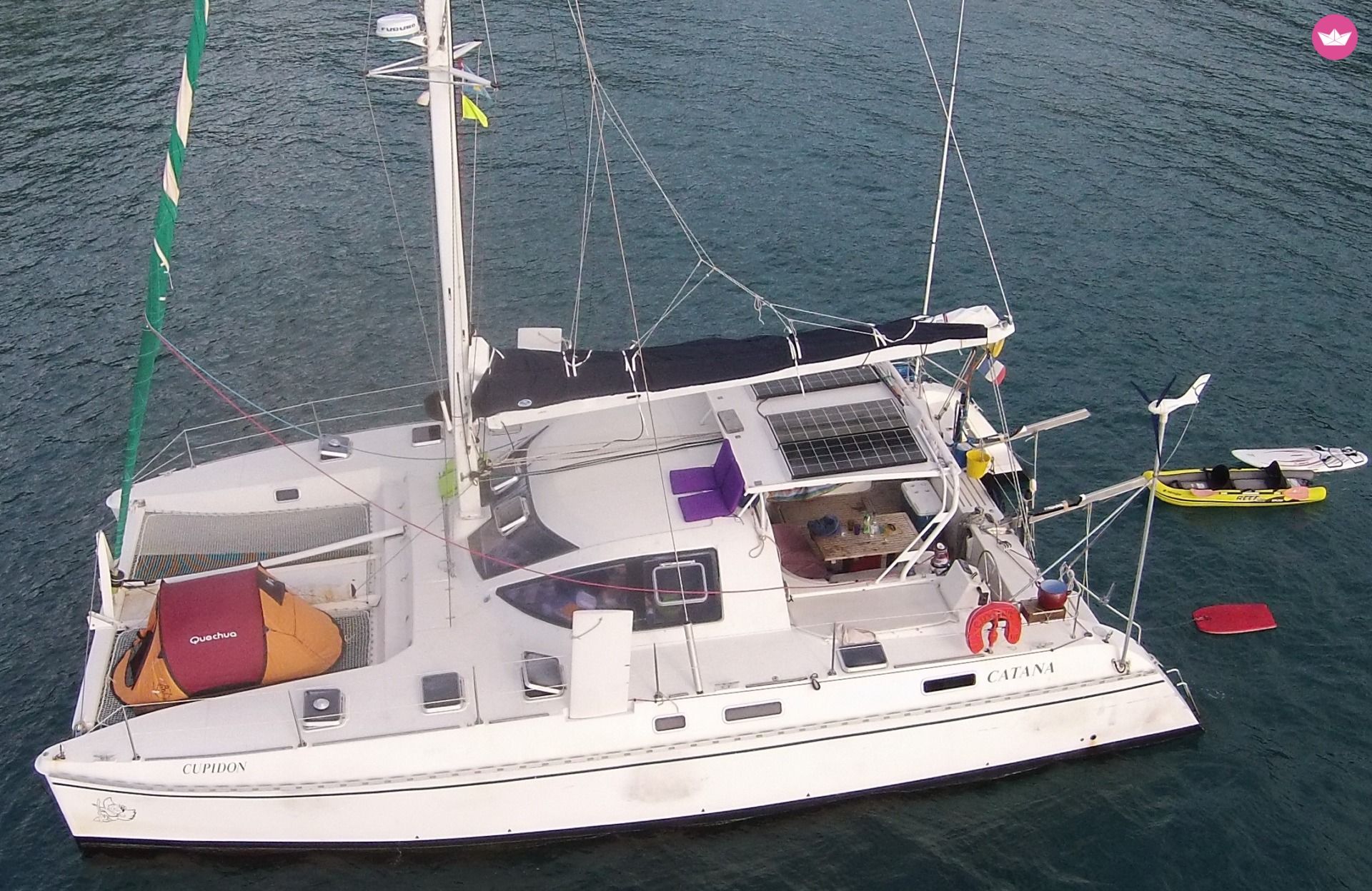 Description of Francis's catamaran , Calendrier mis à jour regulièrement et réponse rapide Le catamaran est un Catana 42S rapide et confortable . Son équipement est très complet (4 cabines doubles pour 8 passagers panneaux solaires, convertisseur, geenaker, paddle board, kayak, etc.) et son tarif attractif qui démarre à 2 600 € la semaine en font une des meilleures offres du moment. Cupidon se loue avec skipper ou marin-guide, de préférence. Cela vous laisse la possibilité de skipper vous même le catamaran accompagné d un équipier confirmé et discret ou de vous laisser mener pour votre croisière Cupidon est disponible au départ de la Martinique ou moyennant un supplément, de n'importe quelle île de l'arc . A votre demande nous pouvons organiser votre transfert Aéroport/Marina. Si vous avez des demandes particulières, faite le nous savoir, nous ferons de notre mieux pour les satisfaire. TARIFS Nos périodes de tarification sont décalées par rapport à celles proposées par le site. Du 21 décembre au 5 janvier : 4 400 €/semaine ( com incluse ) et 4800 avec skipper ou équipier guide du 6 janvier au 1 mai : 3 400 €/semaine et 3800 avec skipper ou équipier guide Du 2 mai au 20 décembre : 2600 €/semaine et 3300 avec skipper Vous réglerez la différence entre le prix payé sur le site et le tarif avec skipper/marin directement sur place. Durant votre croisière, la caisse de bord est à votre charge Elle est destinée à payer les repas, les boissons, le gasoil, les taxes douanières ainsi que les bouées. Comptez 15 à 30 euros/jour/personne selon votre appétit et le parcours. Elle est à ajouter au tarif de location et sera gérée par vos soins. Pour information : Gasoil : Comptez en moyenne deux heures de moteur par jour = 2X6 litres = 12€/jour Les Taxes de douanes, elles varient suivant l'île visitée (de 0 à 80€) pour l'équipage entier à chaque entrée sur un territoire étranger. Les bouées : lorsque le mouillage d'une ancre est impossible, il convient de payer une bouée pour la nuit. Comptez 15 à 20€/nuit. Repas et boissons : tout dépend de votre appétit et des restaurants envisagés durant votre croisière. Un budget de 15€/jour/personne est raisonnable. Merci de nous interroger nous nous adaptons au mieux de votre programme : one-way, organisation des transferts Francis le propriétaire et skipper pro se fera un plaisir de vous accueillir à bord pour vous faire découvrir les Caraïbes et sa passion des mammifères marins Cupidon est spécialement équipé pour la recherche de mammifères marins ( dauphins, baleine, cachalot ) hydrophone, go pro d étrave, matériel photos, annexe de 15cv ... Ce sera assurément une belle croisière ! Possibilités de combiner votre séjour avec une villa situé au Morne vert dans le nord Caraïbe de la Martinique véritable petit coin de paradis N hésitez pas à me contacter, je peux vous aider à organiser votre séjour combiné dans le nord de la Martinique en vous mettant directement en relation avec des prestataires de qualités A très bientôt Francis