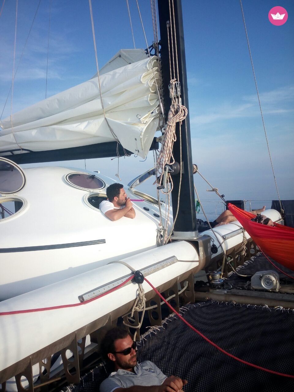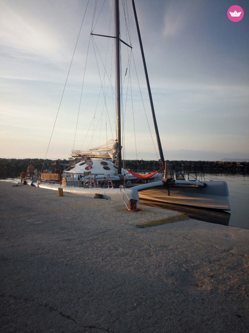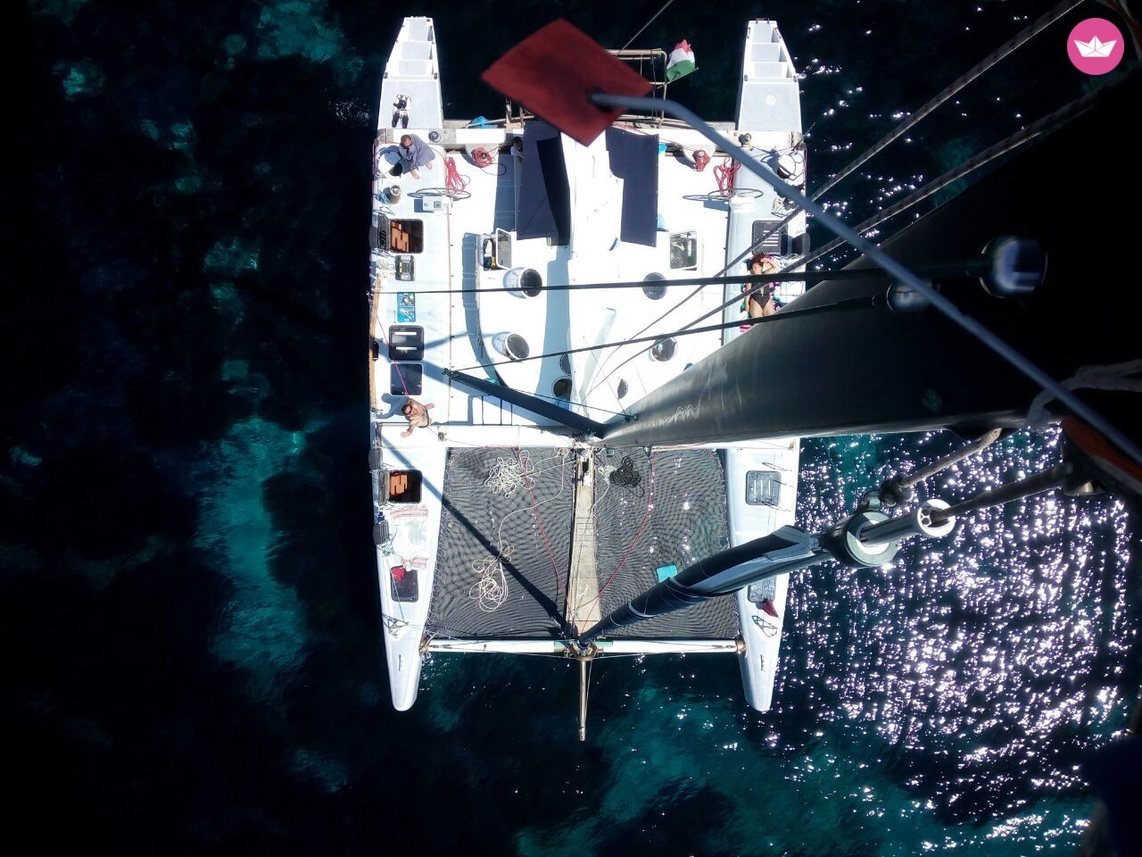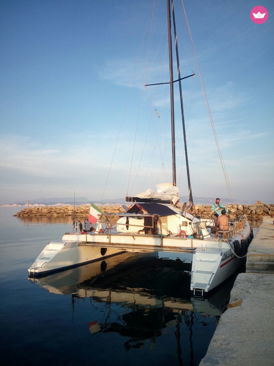 Description of Davide's catamaran Very large and spacious boat 14 meters long and 8.5 meters wide equipped with 4 double cabins each of which has a private bathroom plus two berths for sailors. The entrances for the cabins are autonomous and detached from the dinette in order to guarantee privacy to guests. Dinette habitable and equipped with kitchen, refrigerator oven etc. Perfect for weekly trips but also for group days.