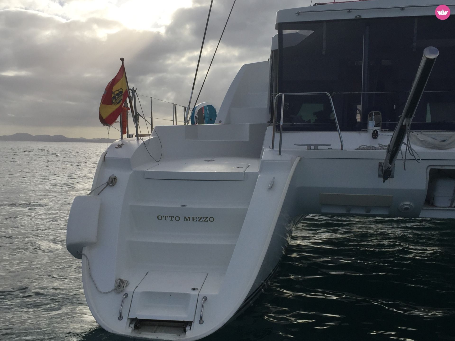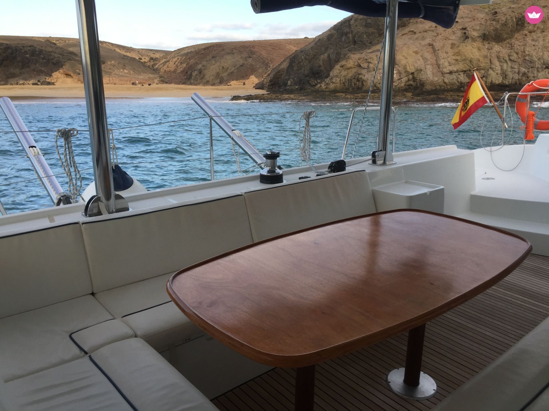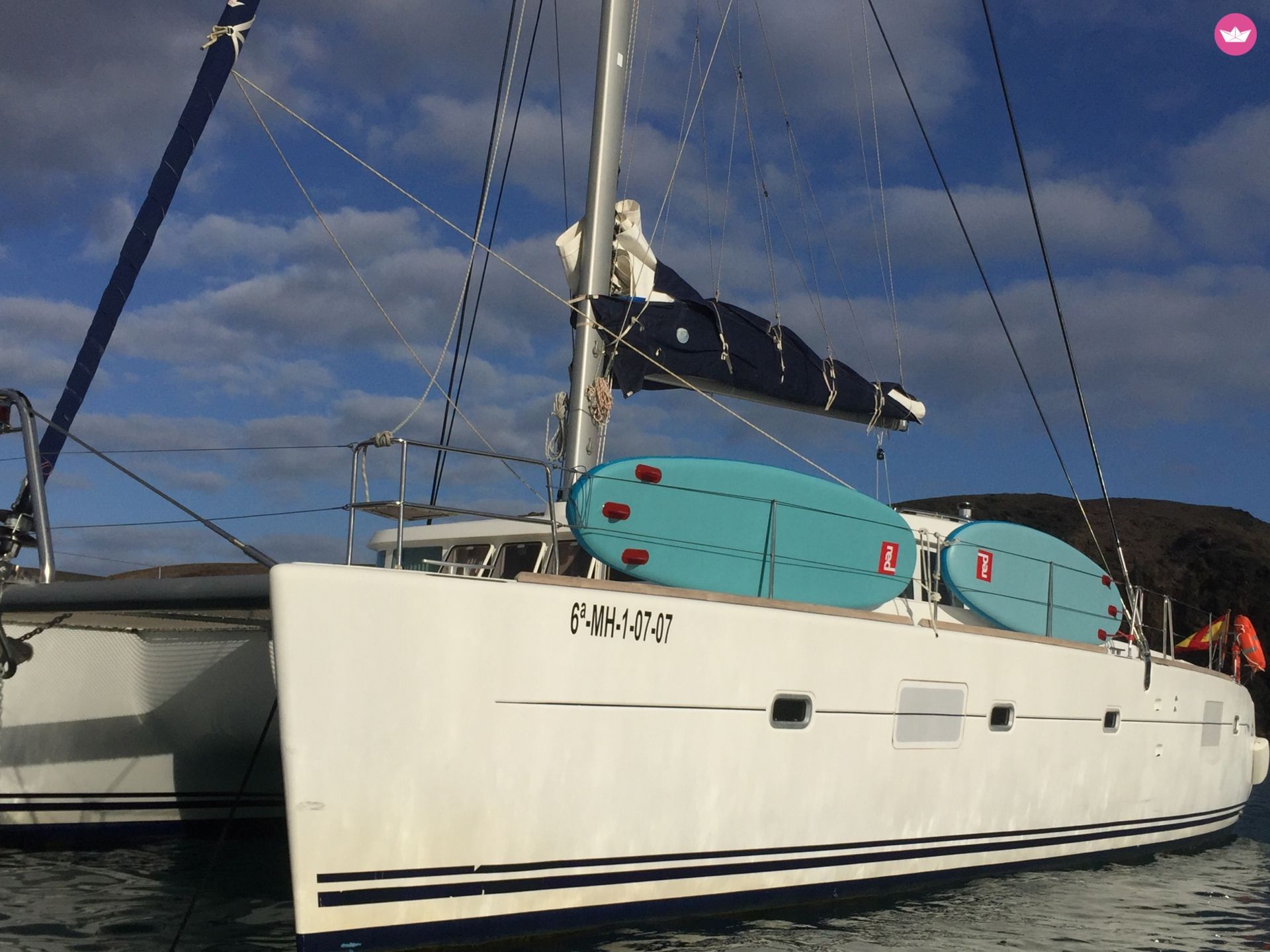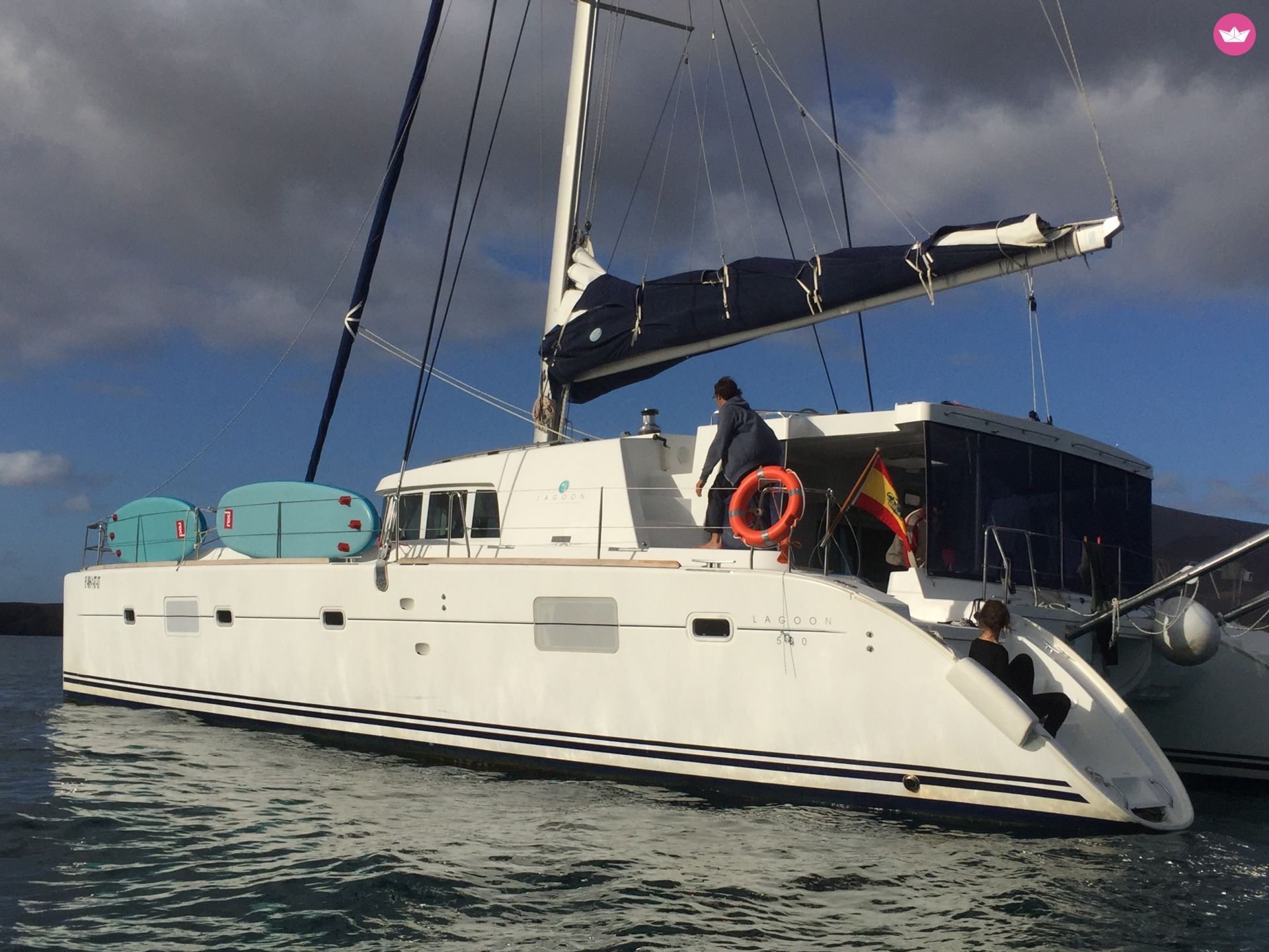 Description of Nacho's catamaran , Ofrecemos un Lagoon 500 del 2007 totalmente remodelado y equipado en el 2017. A bordo dispondrá de lugar para hasta 10 pasajeros mas la tripulación (obligatorio). La embarcación se ofrece en Lanzarote durante la temporada baja (Enero a Mayo; Noviembre a Diciembre). Durante el resto del año podrá adquirir la misma en las Islas Baleares. En cuanto al interior, contara con 4 cabinas dobles con baño en suit, 1 cabina con literas con baño en suit, y una cabina para la tripulación. A lo largo de los 15,54 metros de largo encontrara todo lo que necesita para un máximo confort a bordo: Equipo de música con altavoces en interior y cubierta, TV en Salon , tabla Padel Sup, neumática de 4m con motor fueraborda, todo el equipo de seguridad, mesa interior y exterior para 10 invitados, Generador, potabilizadora, convertidor 220v, ventiladores, cocina de gas y horno, Microondas, Lavadora, 3 Frigorífico y 1 congelador. Debe notar que contamos con los siguienter extras obligatorios que no están incluidos en el precio en lista: - Tripulación: 220€ / día; 1.540 € / semana. - Confort Pack: 420€ / semana; incluye gas, limpieza final, sabanas y toallas. También disponemos de los siguientes extras opcionales: - Azafata/cocinero: 100€ / día; 700 € / semana. - Tabla de Pádel Surf: 100€ / semana. - Equipos de Snorkel: 10 € / semana. - Internet Wifi a bordo: 50€ / semana. No duden en enviarnos sus dudas o consultas! Estaremos a su total disposición para resolverlas.
