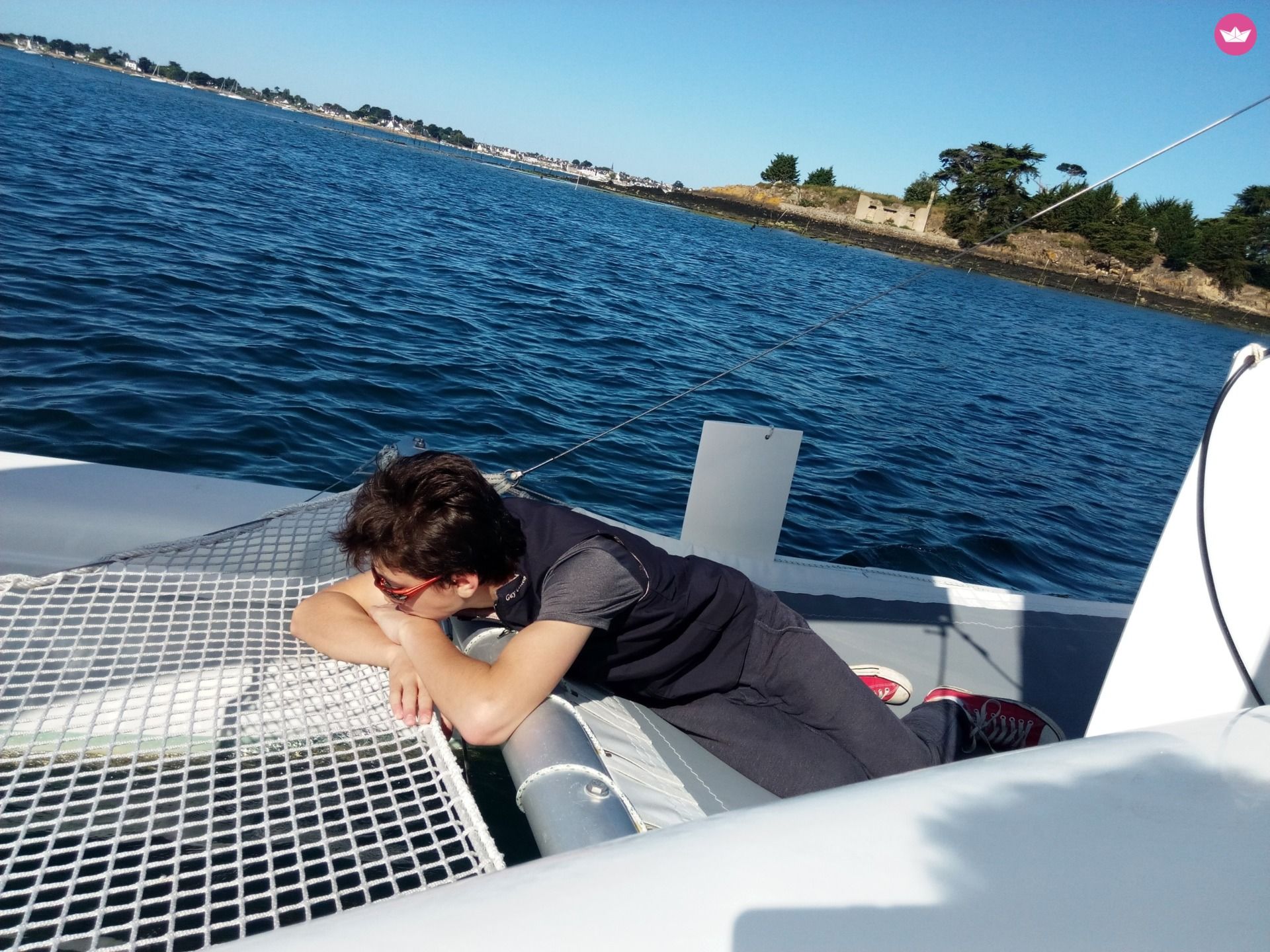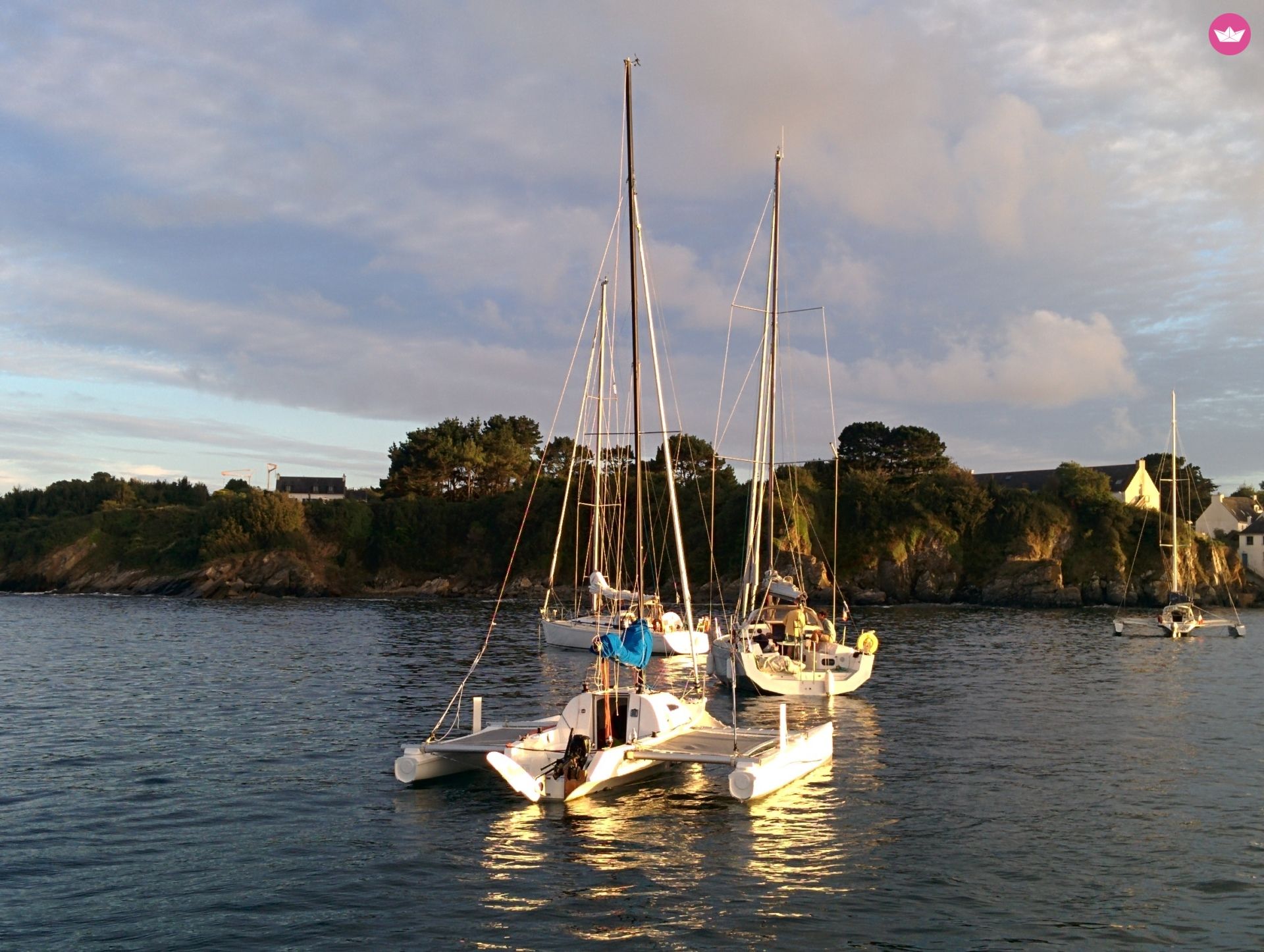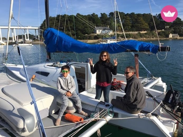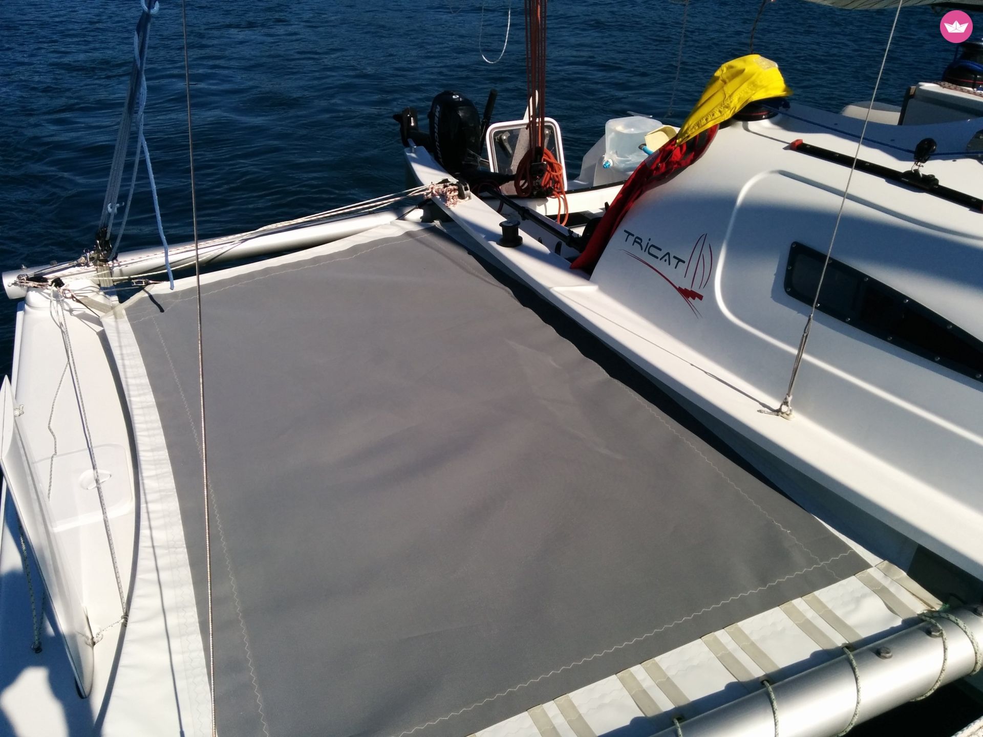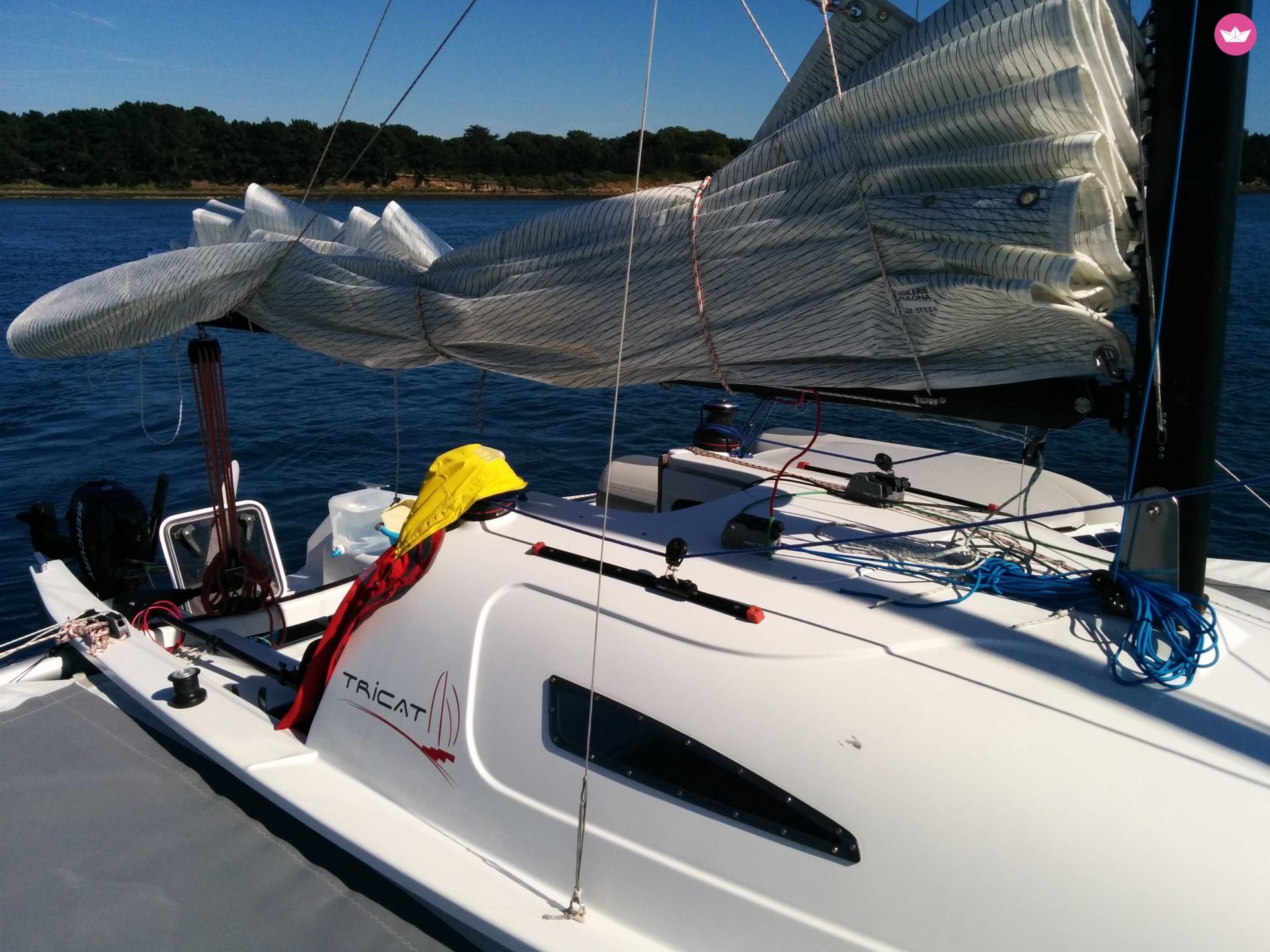 Description of Thierry's catamaran , => Le bateau n'est disponible qu'en COlocation, c'est à dire que le propriétaire est présent à bord pendant les navigations. => Location à la journée uniquement. « LouBay » est un TRICAT 25, Trimaran de 7m70 : - Spacieux : le grand cockpit de la coque principale permet d’accueillir confortablement 4 à 6 personnes et les deux grands trampolines autorisent des moments de détente agréables en navigation ou au mouillage. - Stable : Trois coques c’est mieux qu’une ! Alors que les monocoques gitent naturellement, les trimarans conservent un angle de gite très faible. Ce point permet aux personnes peu aguerries de prendre contact avec la navigation en toute sérénité. - Rapide: Il est beaucoup plus véloce qu’un monocoque de taille équivalente. Cet avantage le rend ludique et très performant. Sa vitesse, facteur de sécurité, permet de gagner rapidement un abri si nécessaire. - Sécurisant : le bateau est insubmersible, imaginé comme tel dès sa conception. De multiples caissons isolent toute voie d’eau éventuelle. Par ailleurs de la mousse préserve une réserve de flottabilité suffisante même en cas d’avarie sévère. Ludique, sécurisant pour les enfants et confortable pour les séniors le trimaran vous permettra de partager en famille une balade en mer ou chacun trouvera son intérêt. Une video est disponible sur ( chercher : TrimaranPourTous ) => Le concept: Un bateau est toujours assez grand pour pouvoir être partagé. Les navigations sont toujours plus enrichissantes lorsqu’elles se font au rythme des rencontres. Je vous propose d’embarquer sur un voilier ou je mettrai tout en œuvre pour vous faire partager ma passion. En baie de Quiberon les possibilités sont nombreuses et variées, l'Ile de Houat une perle, Belle-Ile en Mer encore plus belle que la chanson, et le golfe du Morbihan magique. A nous d’établir le programme…! Les départs peuvent se faire depuis La Trinité, Le Crouesty, Port Haliguen, ou tout autre endroit disposant de quai qui permette un embarquement facile. La participation aux frais demandée couvre l'équipement individuel de sécurité, une part de l’entretien du bateau, les collations éventuellement consommées à bord (prévoir polaires, baskets, lunettes et crème solaires). Capacité standard 4 personnes (jusqu'à 6 personnes avec un supplément de 30€ par personne au dessus des 4 en standard). Prévoir des sacs de couchage pour les nuits à bord. Location à la journée uniquement.