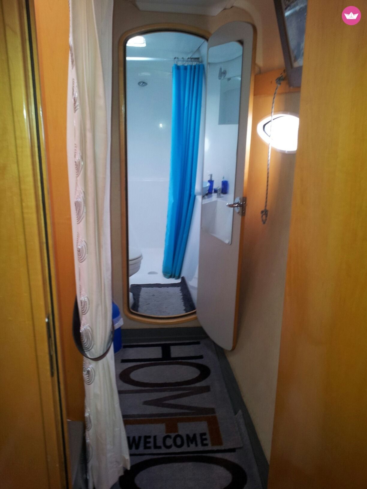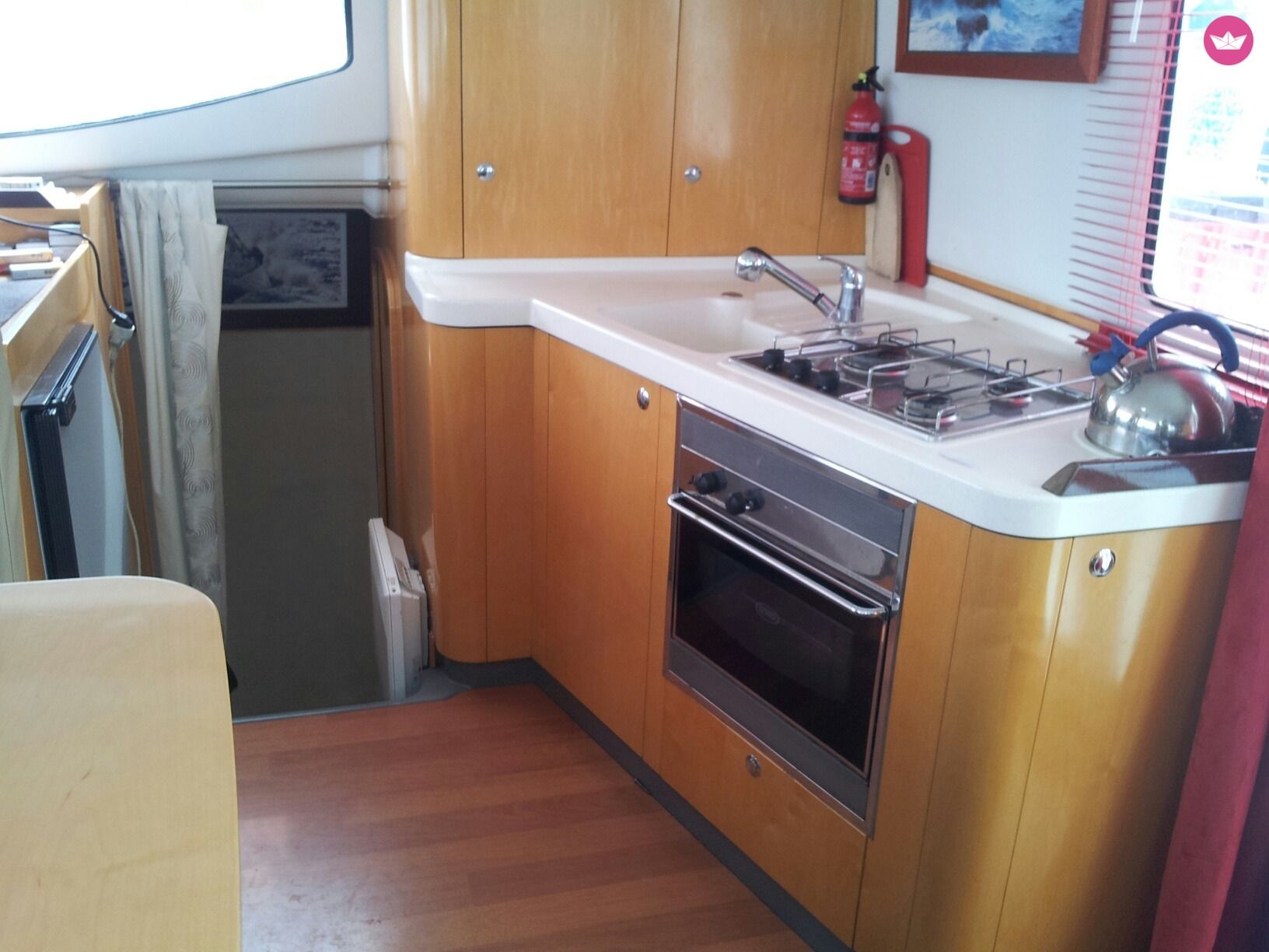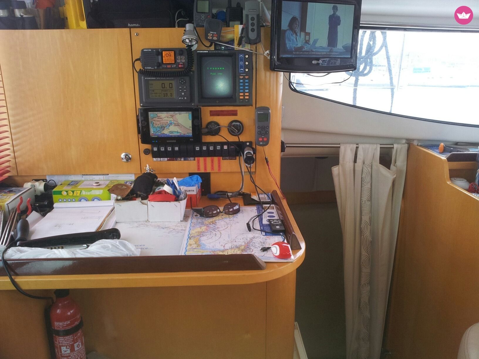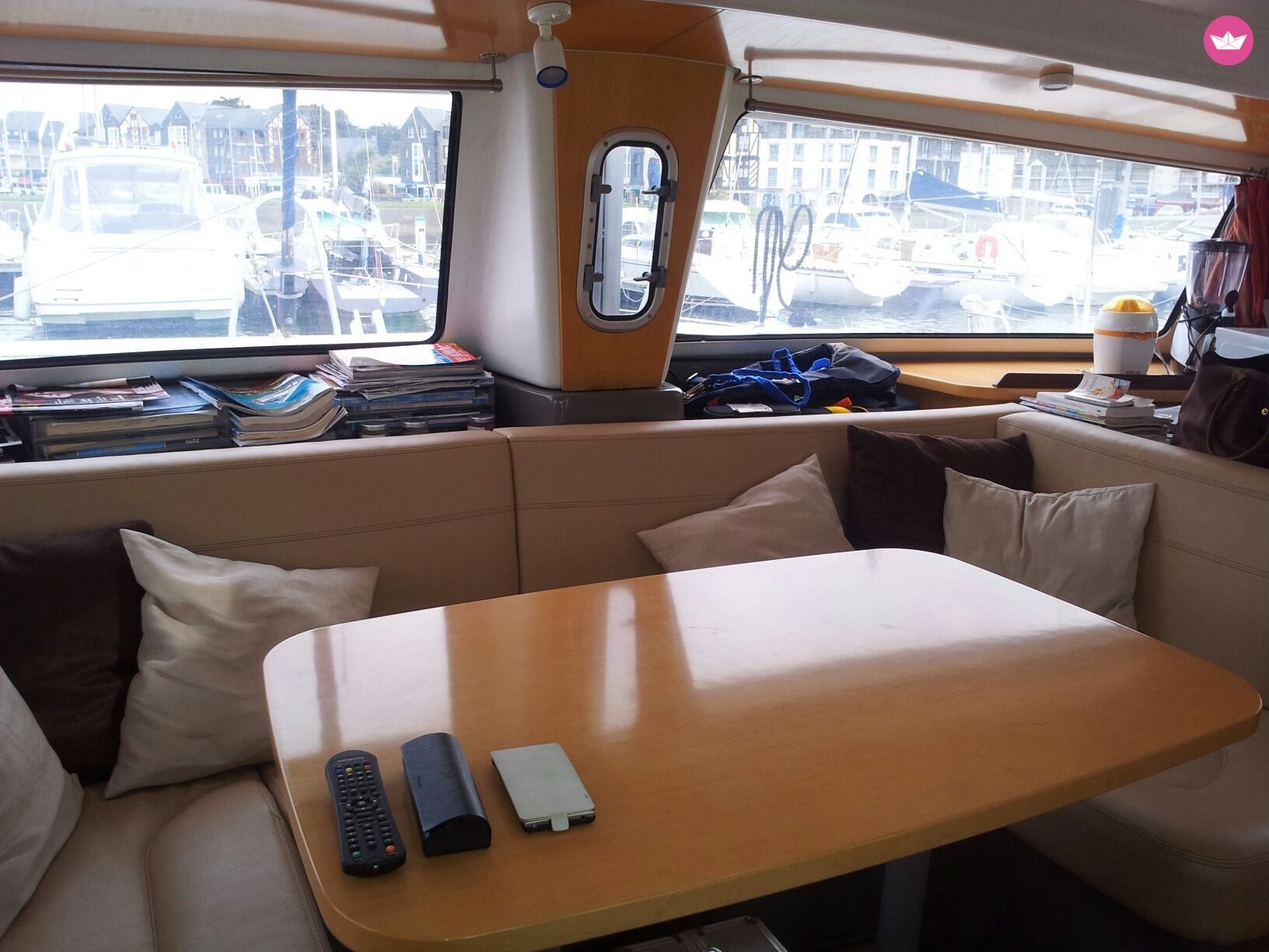 Description of Christine et Pascal's catamaran , Location avec capitaine en CO-NAVIGATION = -50% Beau Mahe 36 ultra équipé winch électrique, gps, radar, télécommande sans fil des : guindeau, pilote auto, phare, mouillage report instruments, vhf, ais, etc.... four gaz + micro-ondes, 3 tv écrans plats, chaine hifi, etc... Nous partons avec Notre MAHE, en toute sérénité quelle que soit la destination, et quelle que soit la saison, il est ultra marin et reste très agréable, même en mer formée. Il est d'une facilité étonnante a conduire seul, grâce au regroupement et l'automatisation des commandes face au skipper. Ses nombreux espaces intérieurs bien séparés préservent l'intimité et le confort a bord, et son carré convivial, décoré chaleureusement permet un repas avec vue imprenable sur la mer, idem pour l'extérieur, ou l'apéritif peut être servi agréablement dans le spacieux cockpit, pendant que les enfants se décontractent sur le pont avant ou sur le trampoline. Et pourquoi pas, pour d'autres une petite sieste sur un bain de soleil posé sur le roof ! Au port, c'est un véritable appartement, toujours avec vue imprenable, et même l'hiver, il fait 22° dans tout le bateau !