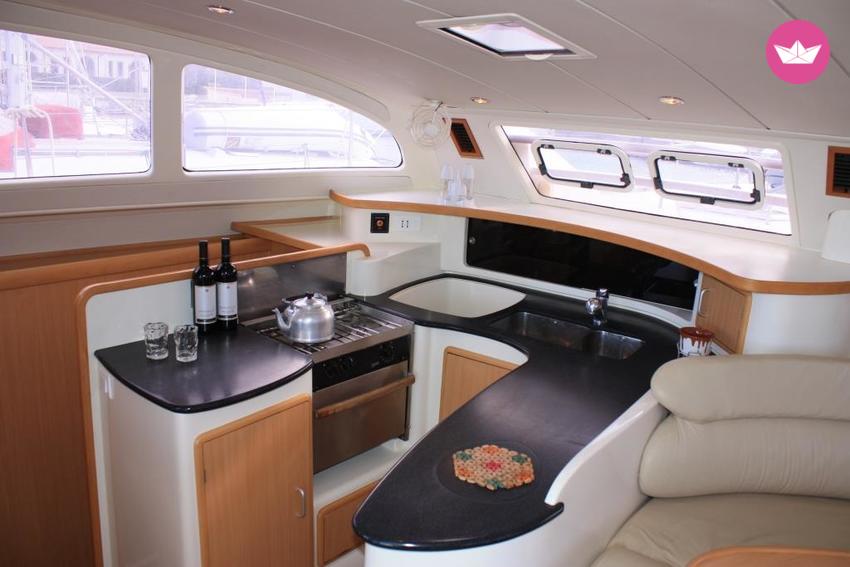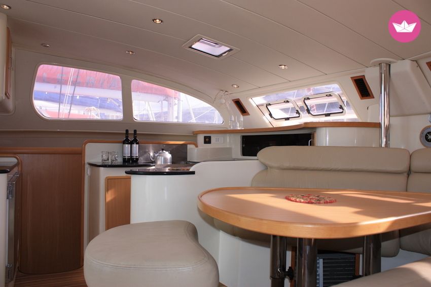 Description of Giuseppe's catamaran , Noleggiate questo splendido catamarano per trascorrere indimenticabili vacanza a bordo in compagnia della vostra famiglia o dei vostri amici nelle meravigliose acque della Calabria! Il nostro catamarano Maranto offre tutte le comodità ed i comfort per solcare le cristalline acque del Tirreno: 14 metri, 2 cabine matrimoniali e 2 matrimoniali più singolo ciascuna con proprio bagno privato e box doccia, cucina attrezzata con saletta interna, lounge esterno al coperto ed ampio trampolino prendisole a prua con cuscini. Vivere un esperienza esclusiva ed al confine con la realtà può diventare un sogno realizzabile: solcare i mari meridionali dalla Calabria fino alla Sicilia, approdare sulle Isole Eolie, scoprire questi luoghi in modo così esclusivo, tuffarsi in baie dalle acque cristalline, vivere, mangiare e dormire cullati dal mare e dal suo dolce rumore. Il prezzo del noleggio non include i costi aggiuntivi di carburante, cambusa ed eventuali porti, skipper (160 euro/giorno) e Pulizie finali (120 euro/giorno). Non esitate a contattarmi su Catamaran Yacht Charter per maggiori informazioni!