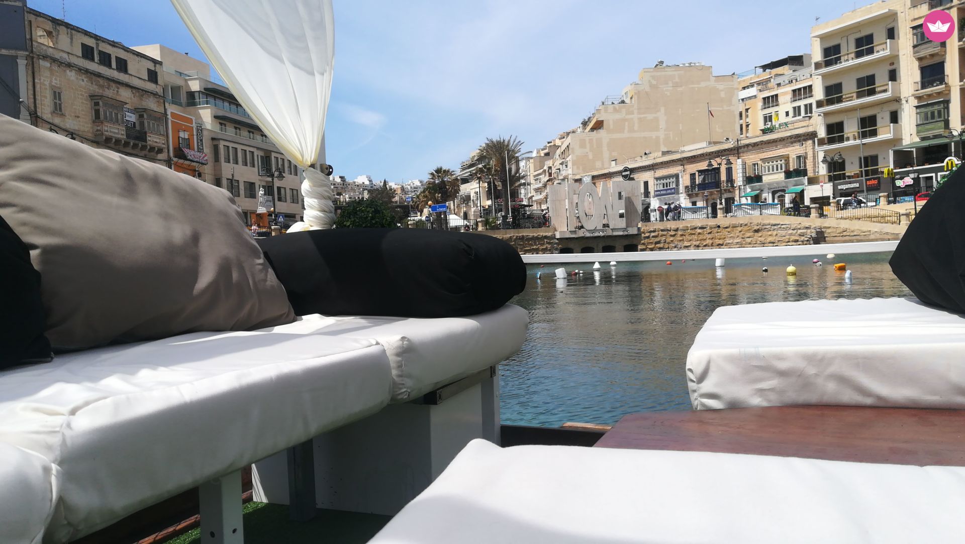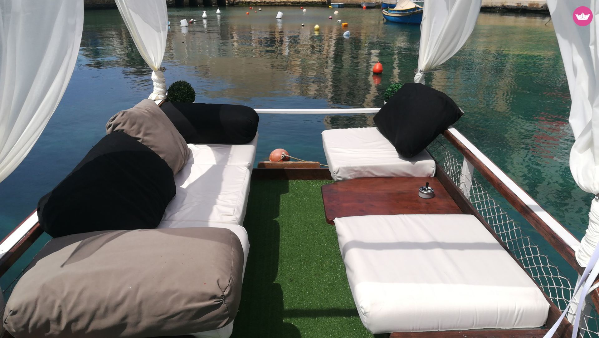 Description of Jeff's catamaran Flounge is an exclusive floating lounge docked by the LOVE sign in the blissful Spinola Bay of St. Julians. Experience the benefits of the yachting lifestyle, without the stresses or expenses of a yacht. Jump onboard the Flounge and float in style whilst lounging in the living room style set up. Chill, play tunes, beat the heat, have a few drinks and entertain your guests on your very own “private island.” Enjoy Spinola Bay a whole new way… The Flounge fits up to 6 people and comes equipped with: -Fairy lights -Sofa Seating -Side Table -Mood Lighting -Private Dingy to get to and from the Flounge as you please CONTACT THE FLOUNGE TEAM Get in touch and ask us any questions about the Flounge.