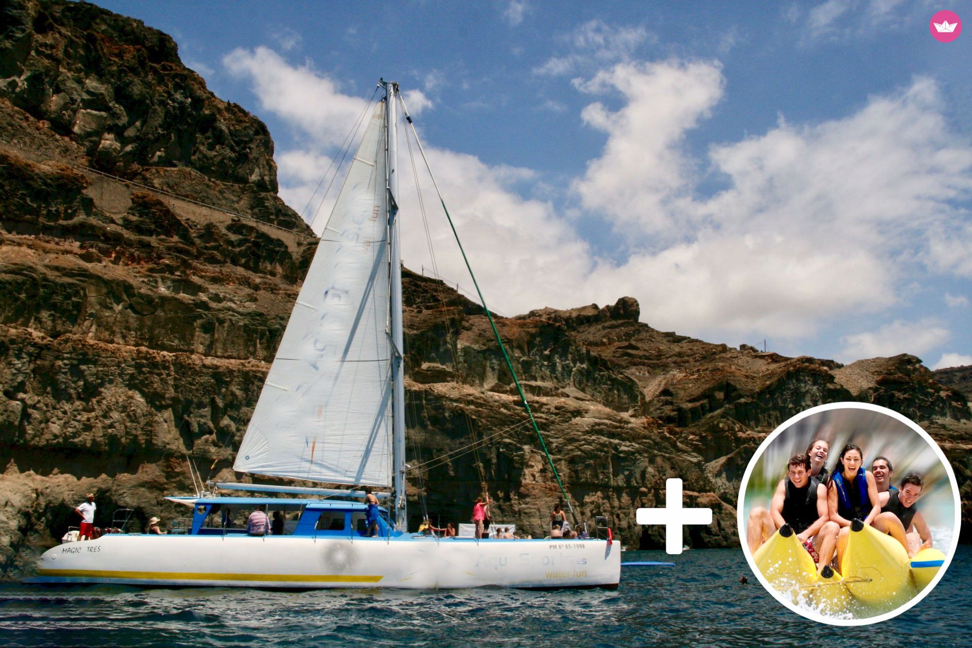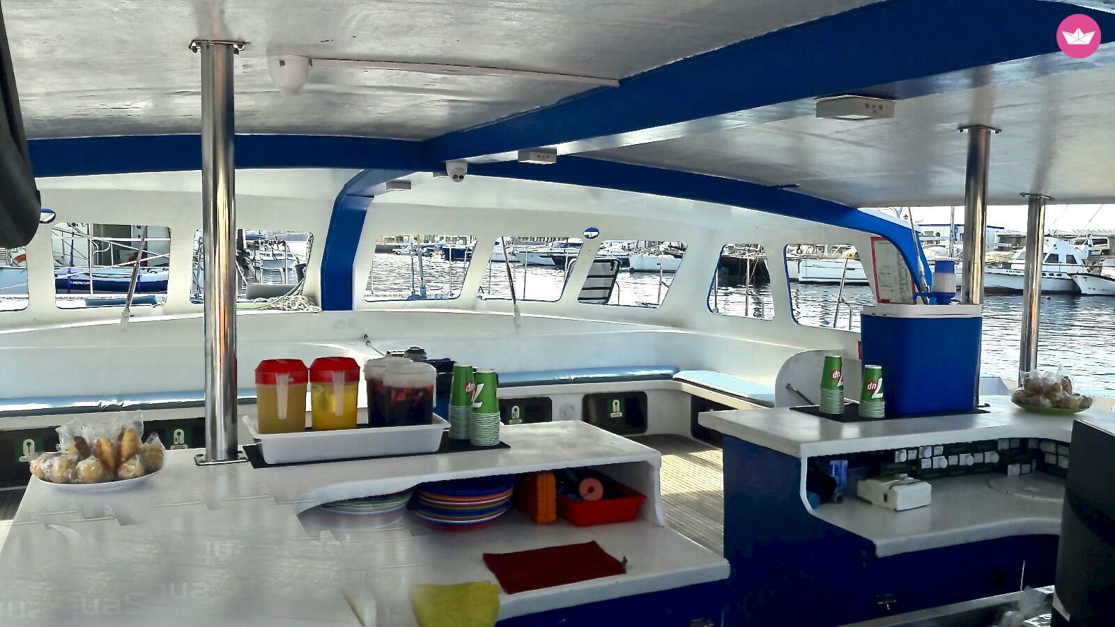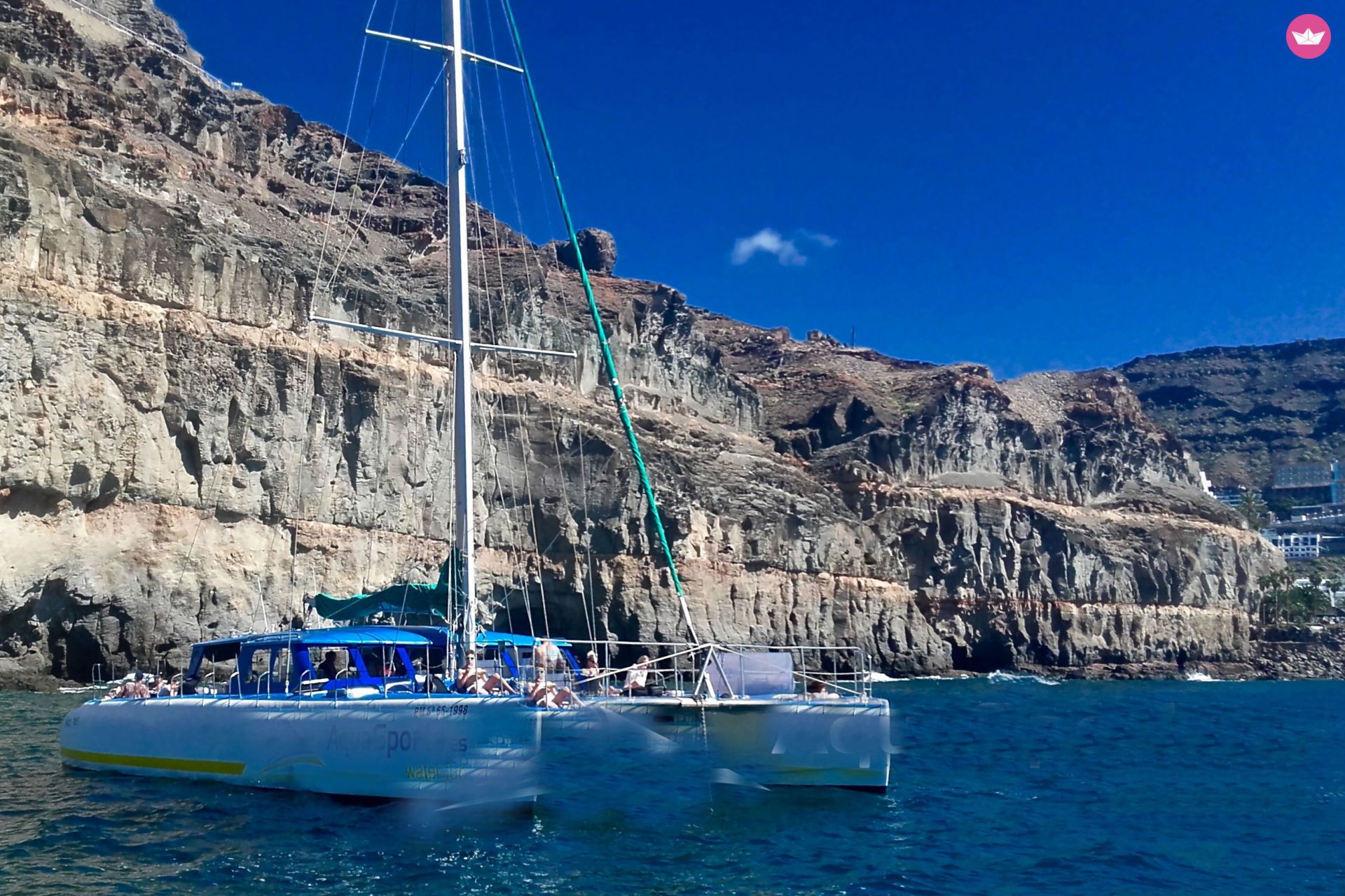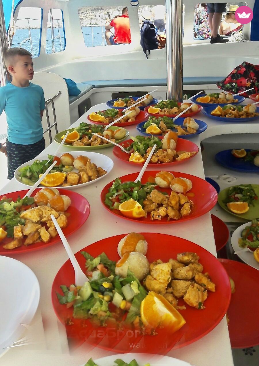 Description of Juan Jose's catamaran , PRECIO DE ALQUILER CERRADO PARA 20 PAX - Cada persona extra tendrá un coste de 50€ Bienvenido! Su a bordo de nuestro Gran Catamarán, donde disfrutarás de tu espacio de confort; podrás tomar el sol durante la navegación y observar el paisaje de cuevas marinas, enormes acantilados y playas vírgenes y naturales. Además, ocasionalmente podrás ver delfines (80%), tortugas y peces voladores. También disfrutarás de nuestro bar a bordo, donde podrás degustar un delicioso almuerzo, y refrescarte en nuestra barra libre. Realizamos salidas diarias desde Puerto de Mogán, donde al finalizar la excursión, fondearemos para que te puedas dar un baño en el mar, pudiendo ver el fondo haciendo snorkeling y practicando diferentes deportes náuticos. También lo alquilamos para celebraciones, grupos de amigos y salidas privadas. Pasarás un día fantástico e inolvidable, experimentando una experiencia única en la cálida costa del sur de Gran Canaria. Os esperamos a bordo navegantes!!