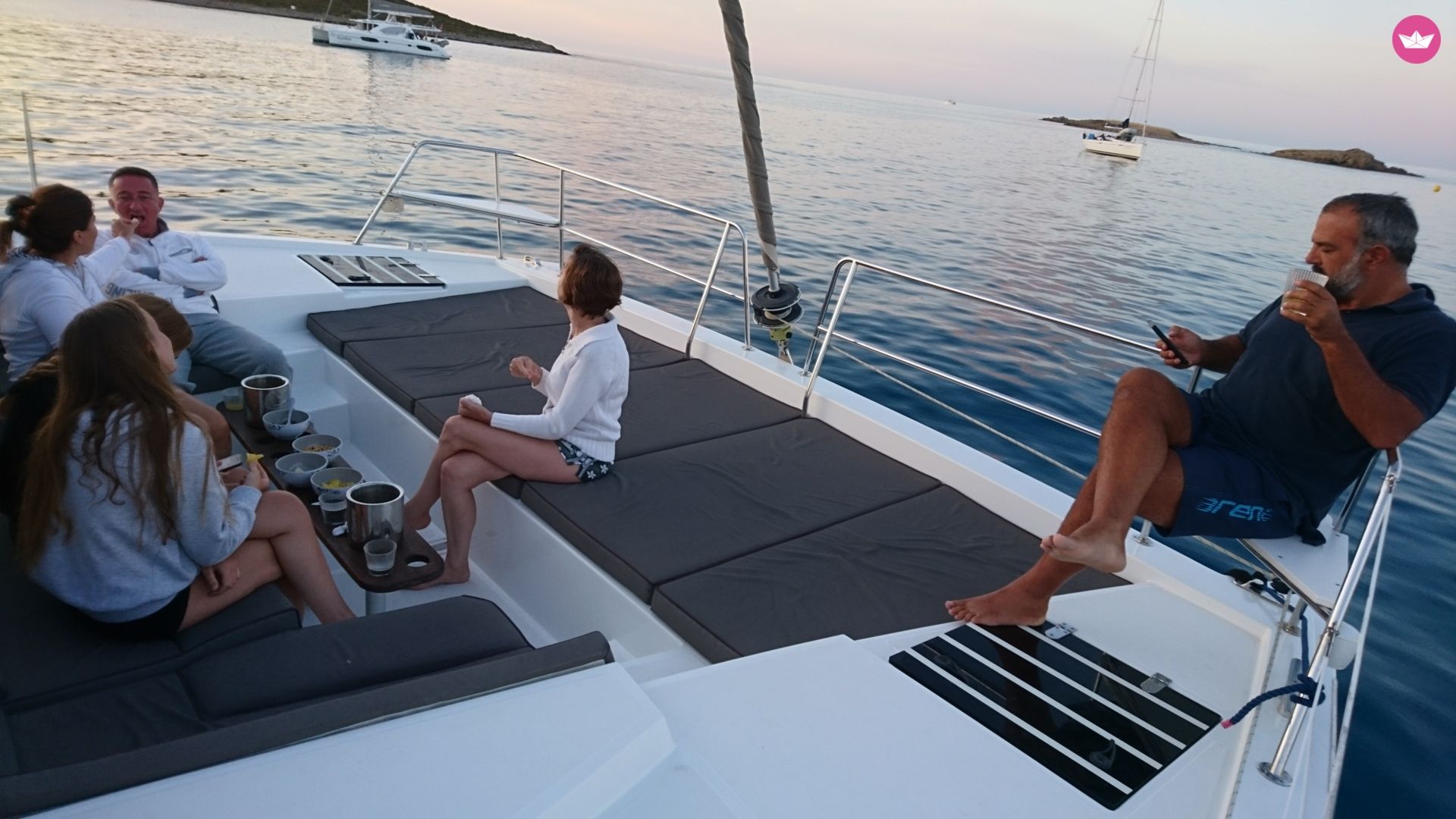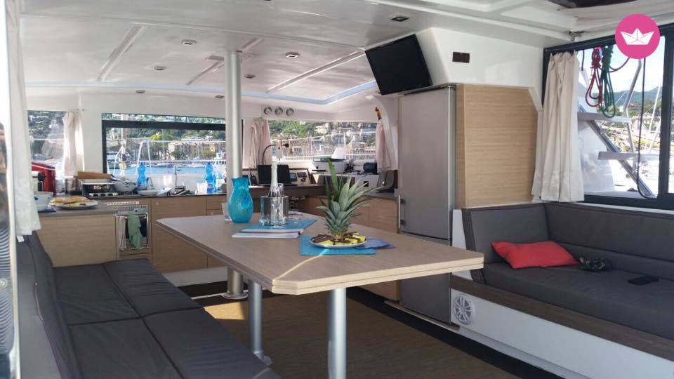 Description of Dario's catamaran , Venite a bordo del nostro meraviglioso catamarano, un Bali 4.0 di 12 metri. Costruita nel 2016, la barca dispone di 4 cabine doppie ognuna con il proprio bagno (4 bagni) situate agli estremi degli scafi, il che garantisce una privacy quasi del tutto assoluta. Vi sentirete come a casa in quanto l'imbarcazione è dotata di tutti i comfort e dei dispositivi elettronici necessari, come ad esempio: asciugacapelli, acqua calda, acqua fredda ecc. La cucina è moderna ed è così' bella da fare quasi invidia a qualunque altra cucina cittadina, localizzata all'interno di un "open space" da cui è possibile ammirare la vista del mare a 360 gradi. Tavoli da pranzo sia da interno che da esterno che danno modo di godersi pranzi o cene in famiglia o in compagnia di amici. Per le/gli amanti dell'abbronzatura invece sono disponibili cuscini, materassini perfetti per godersi il magnifico sole mediterraneo. Extra (i prezzi si intendono per settimana): Pulizia finale: 200 Euro (obbligatorio) Lenzuola: 25 Euro a cabina (opzionale) tender di servizio: incl. nel prezzo Asciugamani: 25 Euro (opzionale) Bombola gas: inclusa nel prezzo zattera di salvataggio: inclusa nel prezzo Hostess: 700 euro (opzionale) Skipper 1100 Euro (obbligatorio) Scheda tecnica: Motore: Nanni Diesel Potenza del motore: 2x40cv (29Kw) Carburante: diesel Propulsione: diesel con saildrive Serbatoio carburante: 400lt Acqua: 800 lt + dissalatore da 60 lt/h Riscaldamento: a gasolio WC: 4 Bagni: 4 Navigazione: timone
