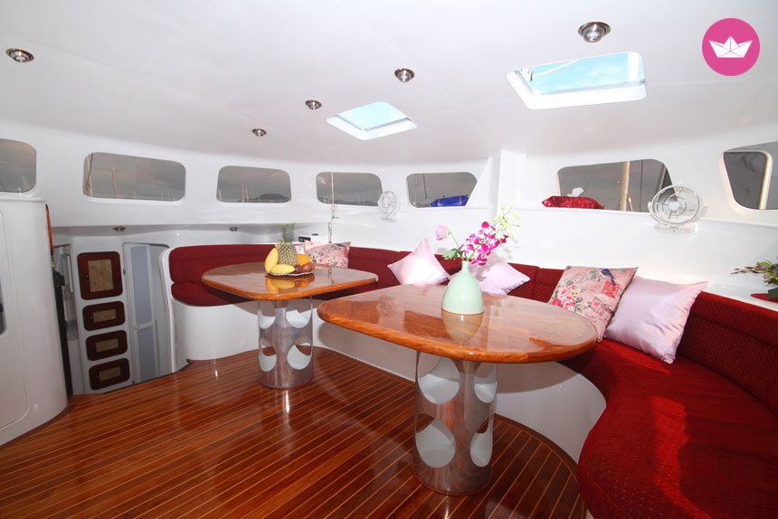 Description of Wolfgang's catamaran Amadeus' interior is stylishly designed in natural wood colours contrasting with light tinted interior elements. Above decks Amadeus is huge, taking into account she is 48 feet x 25 feet. She is fitted with an aluminium fixed awning for protection from the sun and the occasional tropical shower. Lunches are mostly served on the open-air foredeck under a shady and breezy awning with a panoramic view of the surroundings, or on the cockpit table. Amadeus features three breezy en-suite double cabins with their own bathroom and shower facilities and one airy double aft cabin with access to shower and bathroom. The saloon is spacious with a comfortable settee set around 2 tables. 8 Persons can sit here for breakfast, lunch or dinner. A convenient and well-stocked galley is located in the starboard (right) hull and is fitted with a gas stove and an oven/grill. Prices include: • No sharing with other groups • Services of Captain & Chef/Hostess • Gourmet lunch buffet • Coffee, tea, soft drinks& iced water • Snorkelling & fishing gear Prices do not include : • beer, wine, spirits, cocktails • National Park fees, when applicable • Transfer to/from hotel Prices Thailand, Malaysia 1 - 4 guests to 9-10 guests * on application Burma (Mergui Archipelago) 1 - 4 guests entree fee 250,- to 380.- US$ depending on length of stay & US$ 1000 Boat entry fee