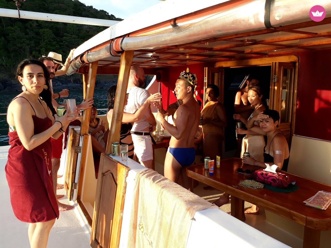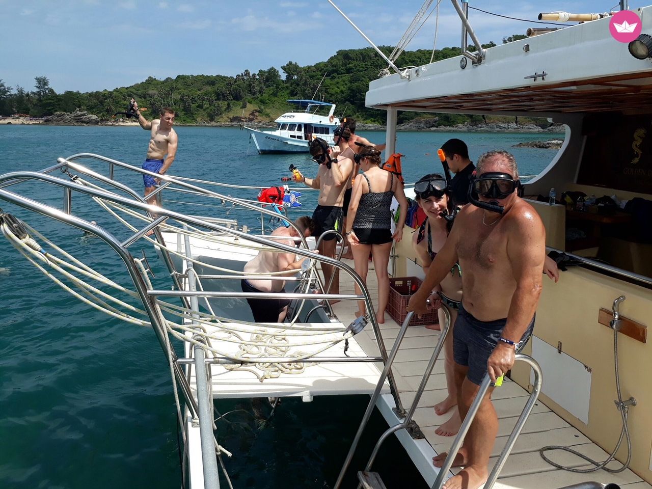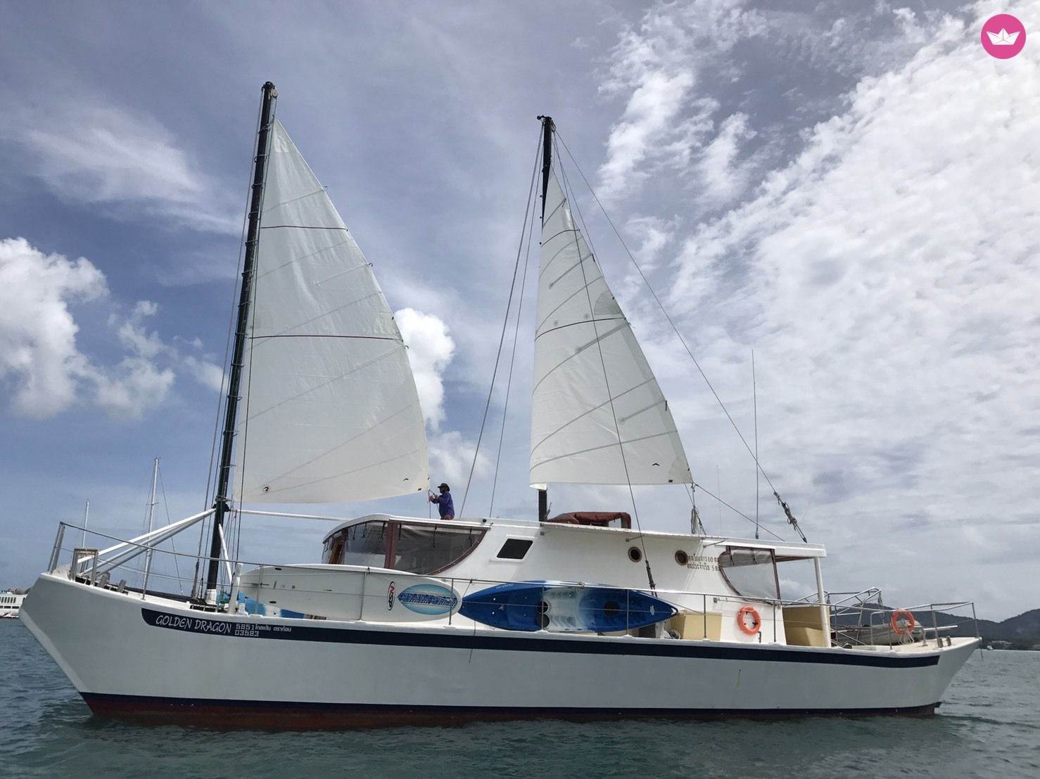 Description of Wolfgang's catamaran SY Golden Dragon Comfortable Charter Catamaran for a day sail or sunset cruise This amazing catamaran is huge, taking into account she is 18 m long x 10 m wide. The seats areas are in the shade giving protection from the piercing sun and the sporadic rainfall. The special Thai style lunches are provided on the bar table and you can eat as much as you like. Drinks are kept in a Fridge and are available all day. The organized floors with widespread pathways make her an innocuous vessel for children. The vast mesh with bean bags is a preferred place to soak the sun. With two swim ladders on the stern of the boat make an entrance and leaving for swimming in a calm and safe environment. With hugely fun activities Relish sailing to attractive beaches, catching fish on the way and snorkelling in clear water. Share this astonishing day with groups, family, rent the boat for your special occasions, marriage or any corporate event you want to unite. Max. 35 persons GREEN SEASON The price for a private day trip is: THB 36,000 for up to 10 guests.(1 May - 31 Oct.) For every additional guest we charge THB 2,000, maximum 35 guests on board. Children of 3-12 years THB 1,000 Children below 3 years old is free HIGH SEASON The price for a private day trip is: THB 44,000 for up to 10 guests.(01 Nov. - 30 April) For every additional guest we charge THB 2,000, maximum 35 guests on board. Children of 3-12 years THB 1,000 Children below 3 years old is free. Day trips: Less than 14 days prior to departure date – 10% of full charter fee charged Less than 5 days prior to departure date – 30% of full charter fee charged Less than 48 hours prior to departure date – 50% of full charter fee charged but 100% of charter fee for peak season On the day of departure – 100% of charter fee charged. If the weather is deemed unsafe by the company, then an alternate date will be offered or a full refund provided. Amadeus lodging space: - Stylishly designed cabins with natural colour schemes - 3 EnSite double cabins (instead of 2) - Extra stowage services in the cabins - Totally original saloon and new galley - over-all 4 toilets on board - Desalination system on board; due to its 160 litre/hr capacity, fresh water is never an issue. Prices include: o 24-hour sole use of the yacht No sharing with other groups o Services of Captain, Chef/Hostess o Running cost of yacht (fuel & berthing) o 3 main meals each day & snacks & fruits Coffee, tea & iced water o Snorkelling & fishing gear o Linen & bath towels Optional Prices: Thai Massage THB 3600 per 6 hrs. Sit on top kayaks 2-person kayak THB 600 ,- per day Stand Up Paddle boards THB 600,- per day
