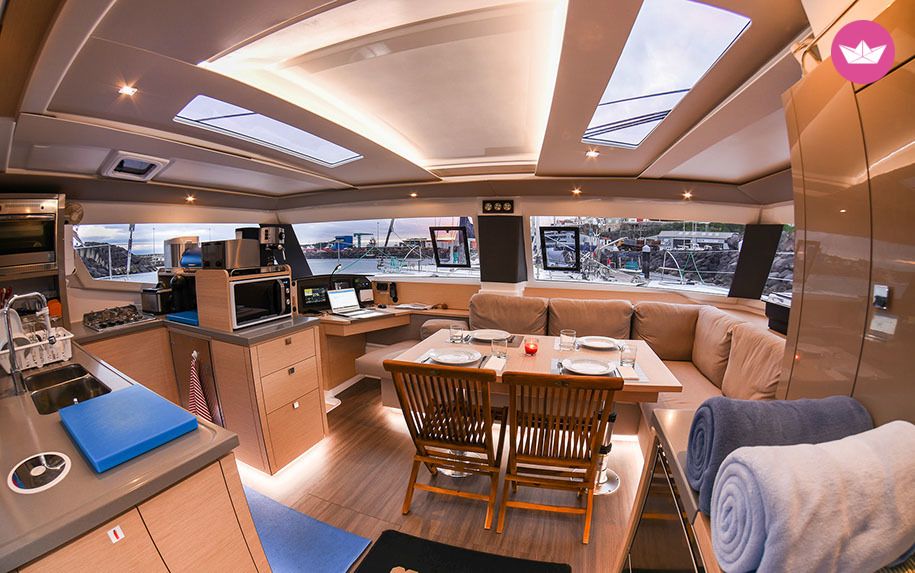 Description of Carlos's catamaran This amazing Pajot Helia 44 catamaran is located in the Vila do Porto Marina in the beautiful islands of Santa Maria. Water and Wind are charters and sailing company specializing in Diving tours. They are based out of the beautiful archipelago of Azores, which is made of nine amazing islands voted second in the world for sustainable tourism by National Geographic Traveler in 2014. The Helia is 13,3m x 7,4m long, 4 king size bed suites, 2 rooms for crew and an Equipped kitchen with a comfortable Lounge area and a nice balcony to enjoy the Horizon. Main additional equipment: Silent and ecological sailing with solar power and wind generator. Fully equipped kitchen with microwaves, dishwasher, breadmaker, coffee machine, two fridges and one freezer. 9,5 Kw Diesel generator and 12 V 60l/hour Watermaker. 220 V and 12 V sockets, allowing you to charge your electrical equipment and cameras onboard. 3,80 mts aluminium RIB with a 20Hp engine. Snorkel equipment and swimming ladders. Compressor and diving gear onboard (for diving liveaboards). Oceanic Class Safety equipment. Plotter, radar, GPS, EPIRB and Autopilot. Additionals onboard: diving, full meals. Languages spoken by the crew: Portuguese, Spanish, French, English and German
